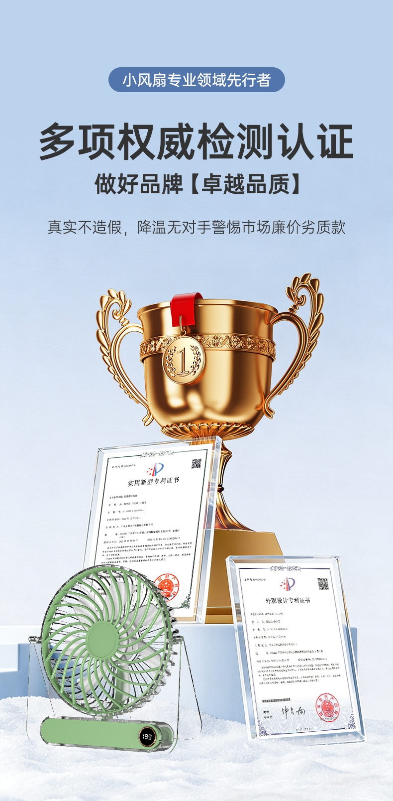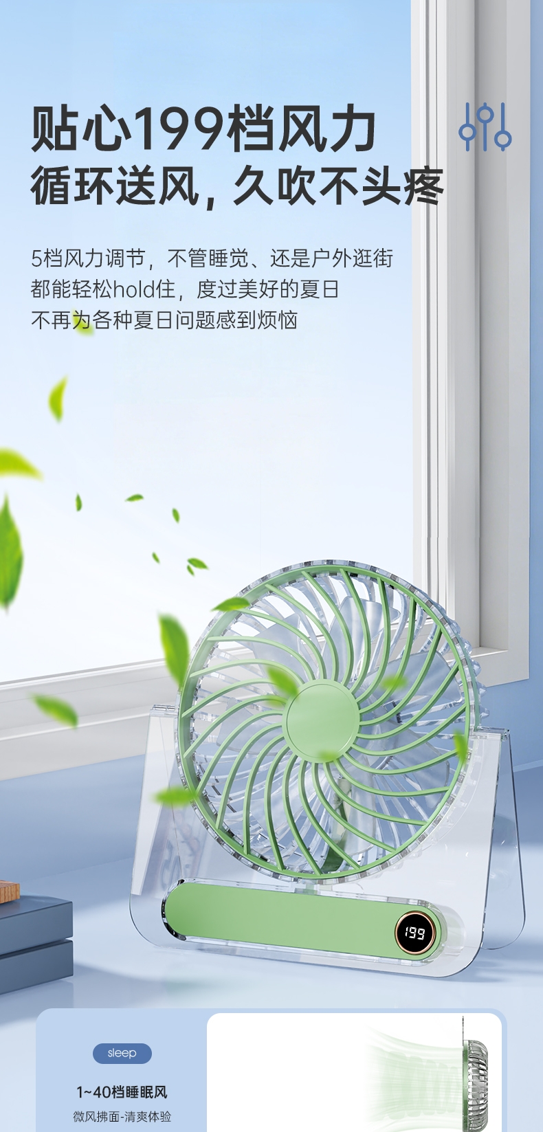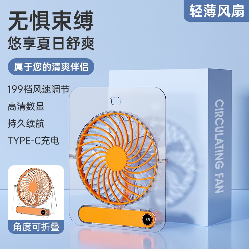 超高颜值折叠透明机身立挂两用;高速无刷电机12000转,199档无极调速;超薄广角高速大风轻薄便携