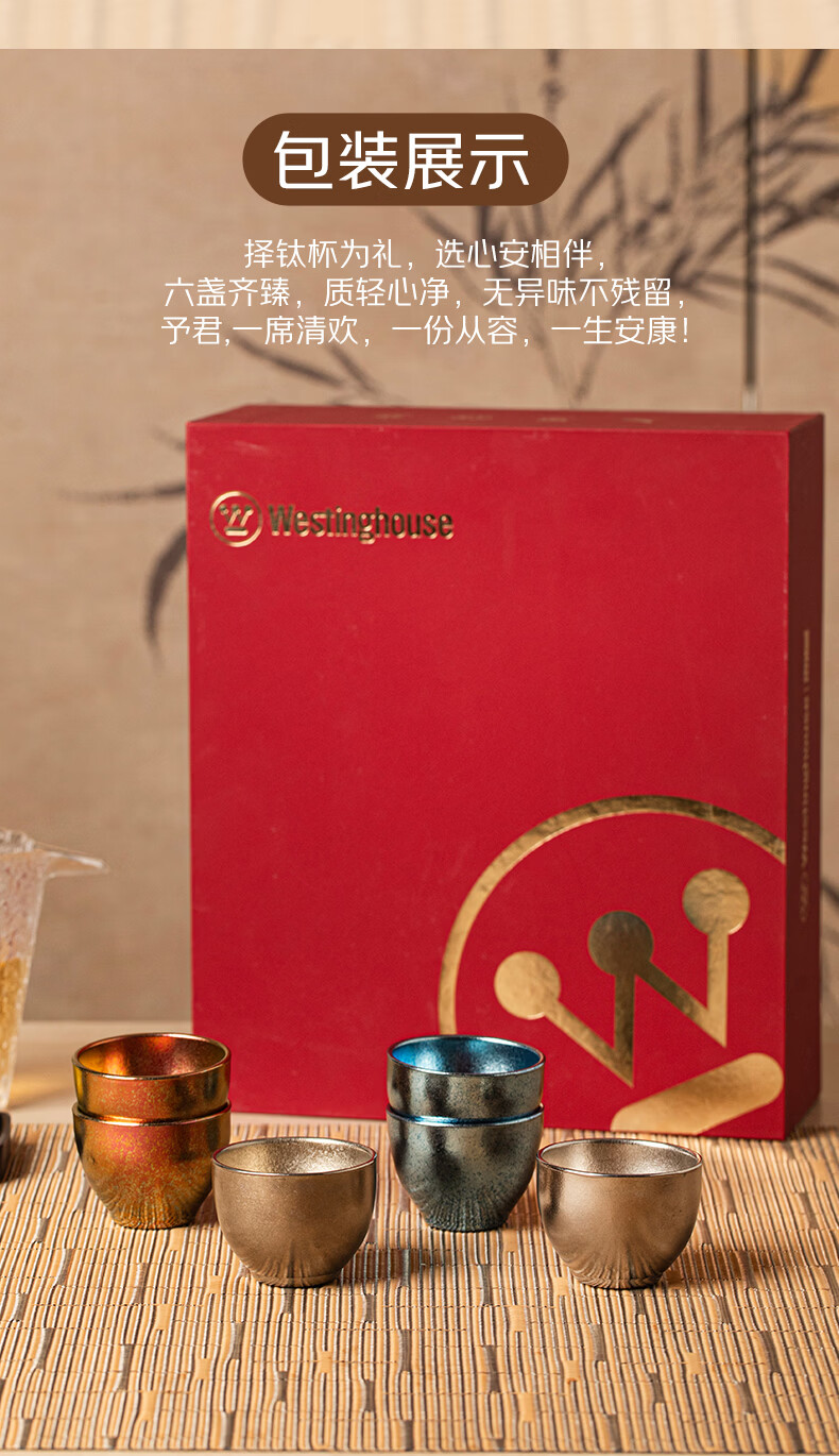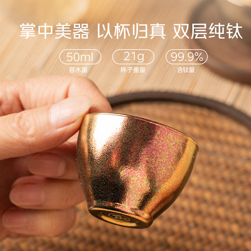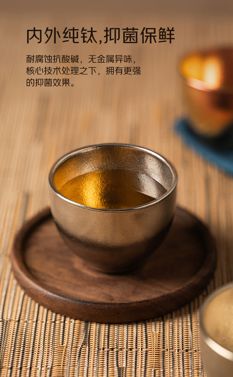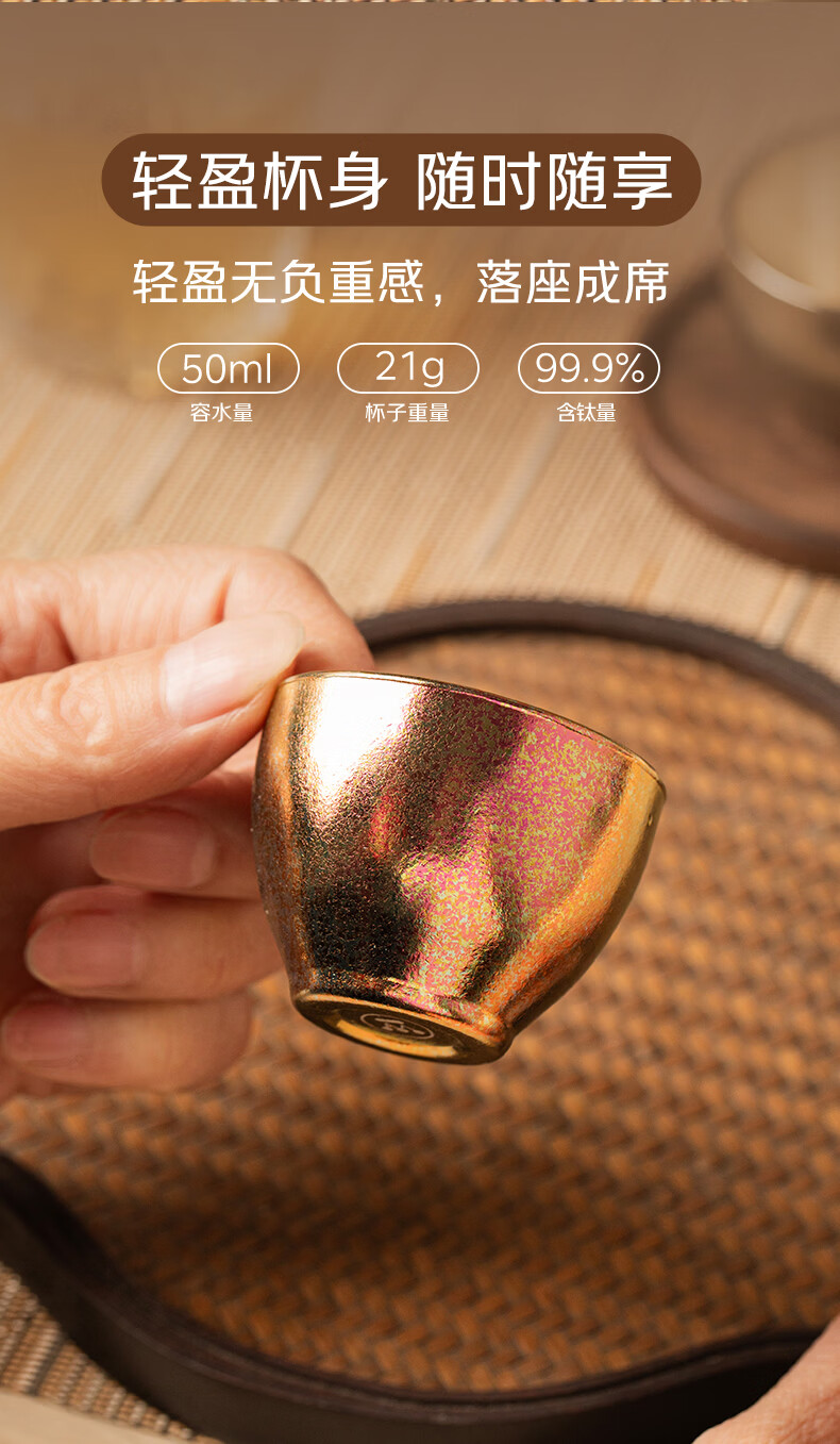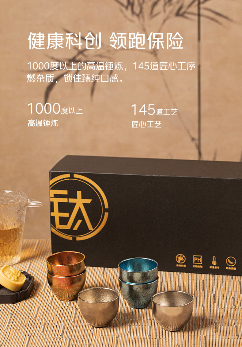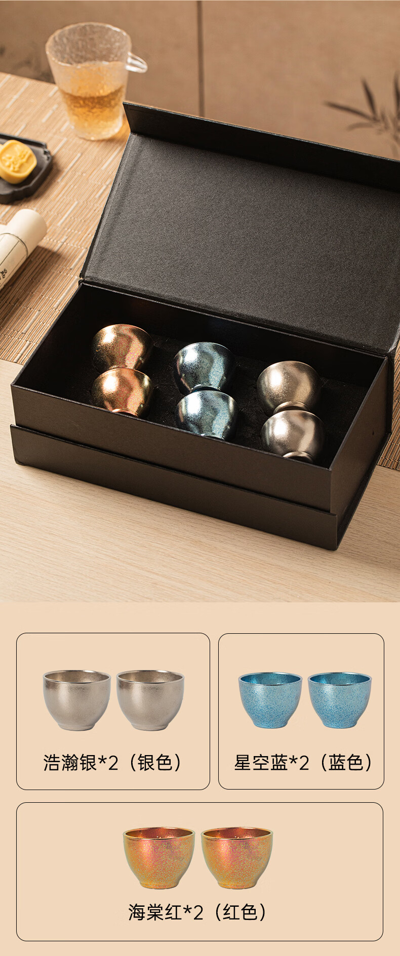 纯钛抗腐蚀,抑菌防霉,防滑防烫,0金属0喷漆0涂层;甄选好礼,六杯成盒,寄语六六大顺;50毫升玲珑体量,杯满福气来