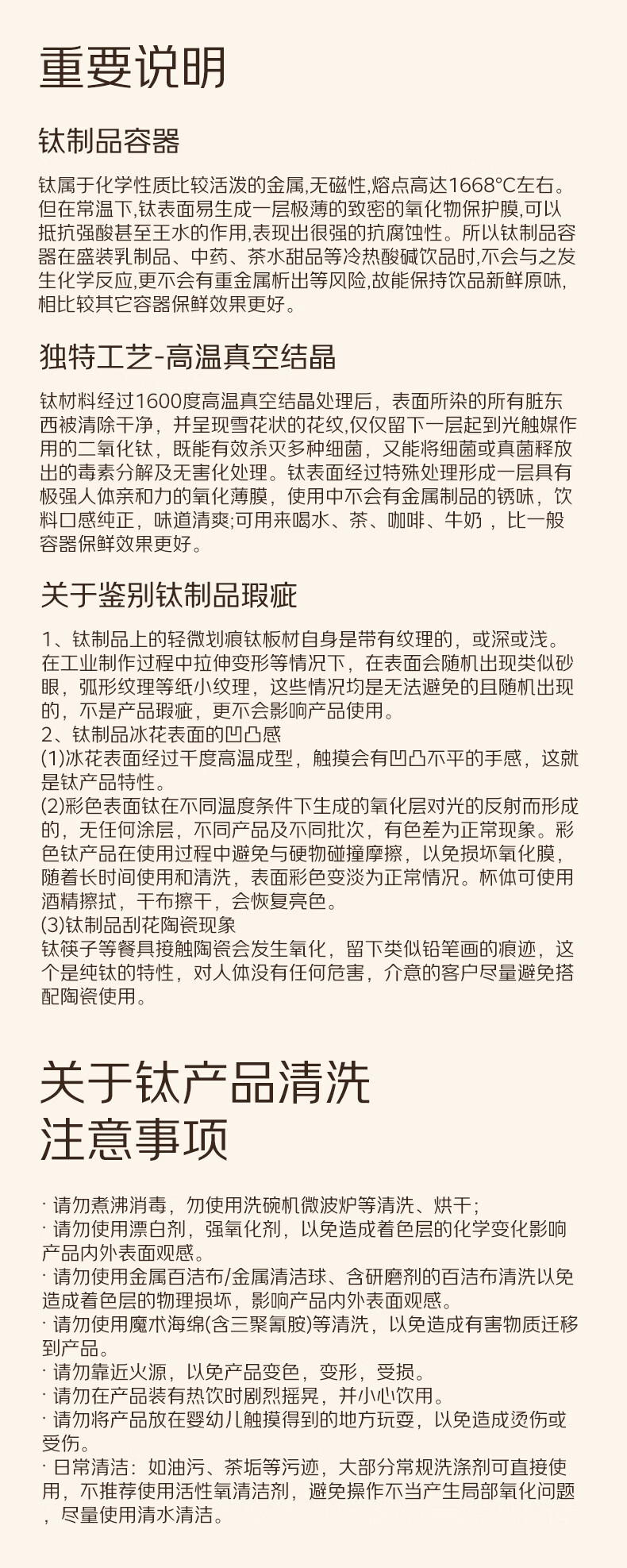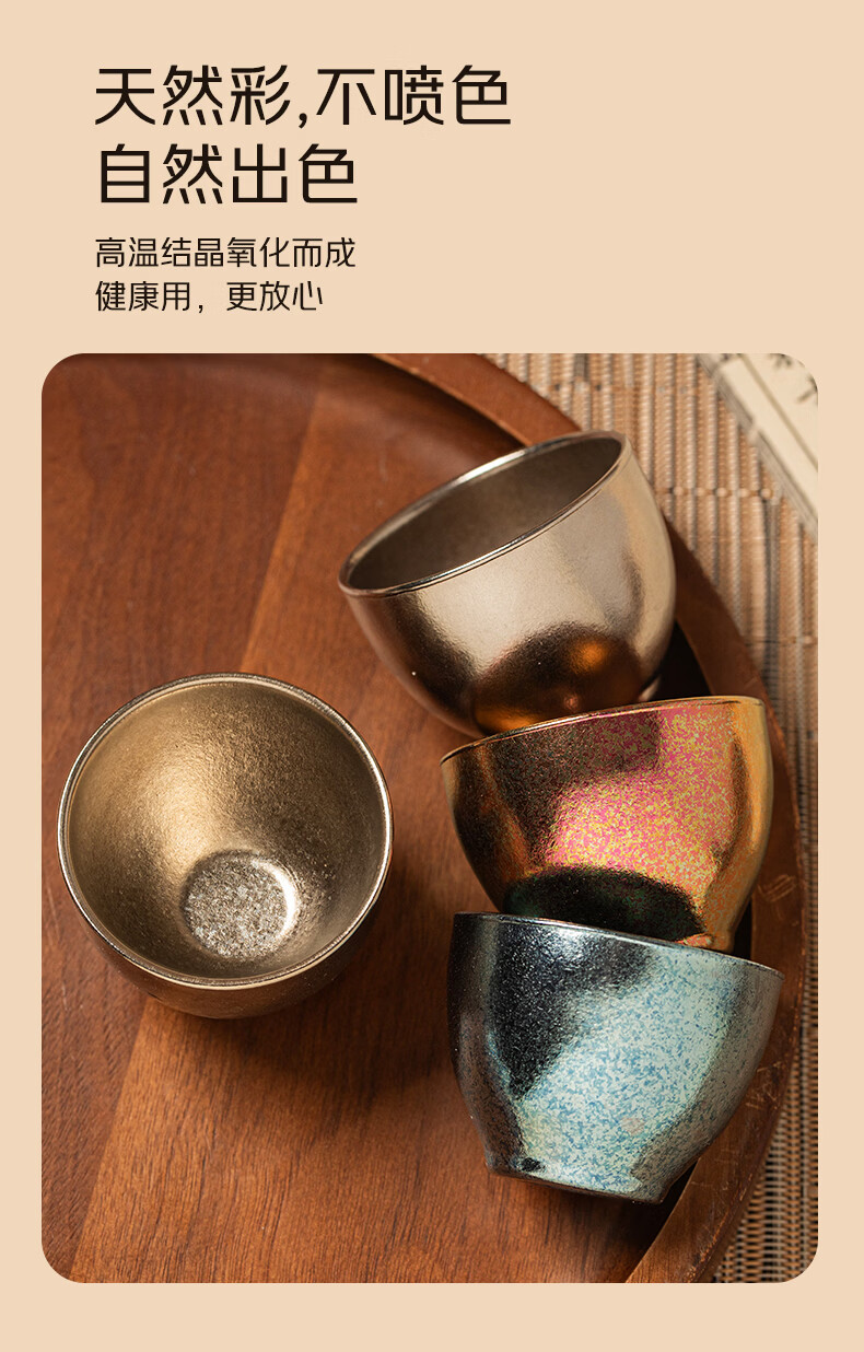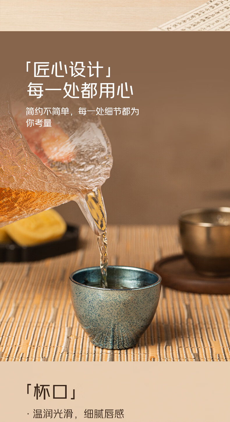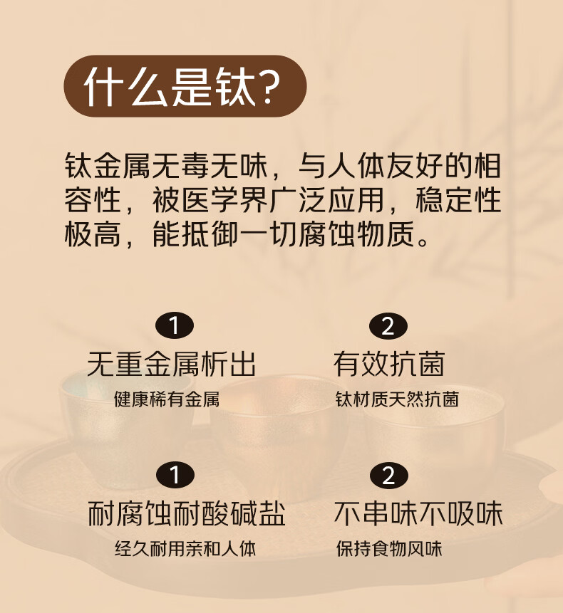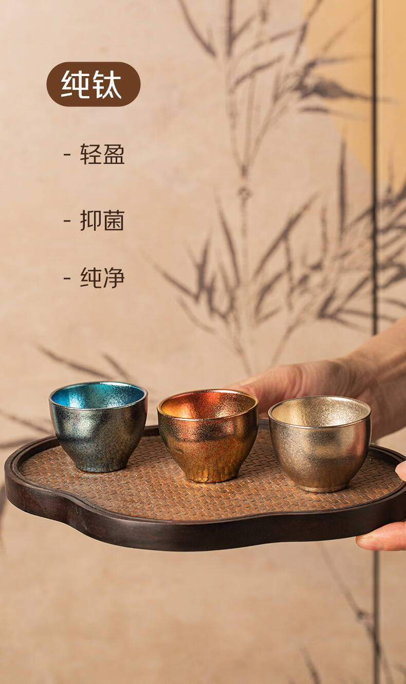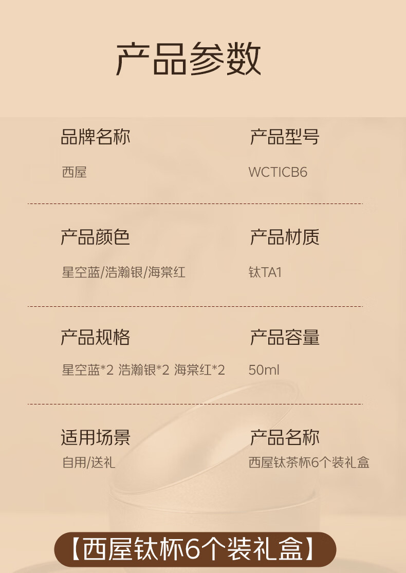 纯钛抗腐蚀,抑菌防霉,防滑防烫,0金属0喷漆0涂层;甄选好礼,六杯成盒,寄语六六大顺;50毫升玲珑体量,杯满福气来
