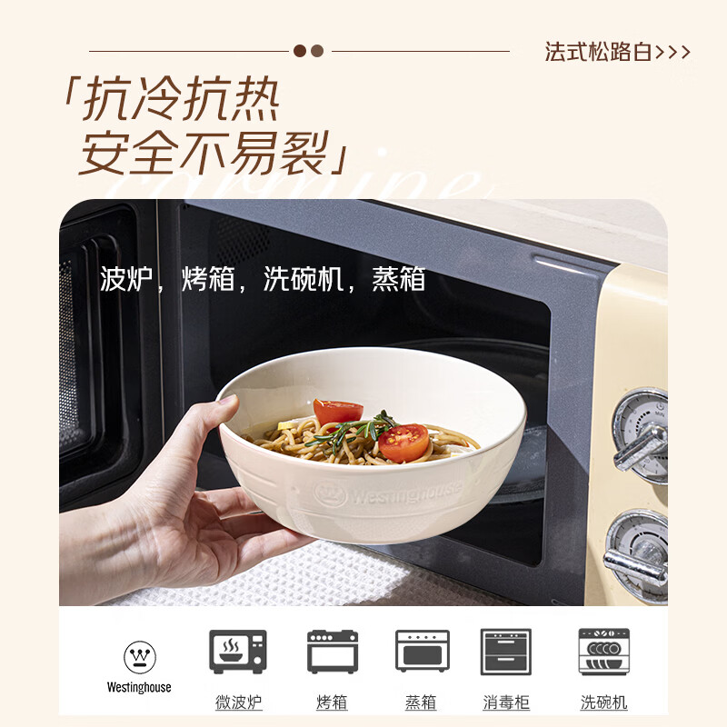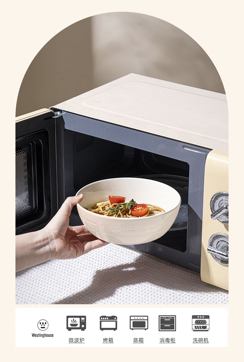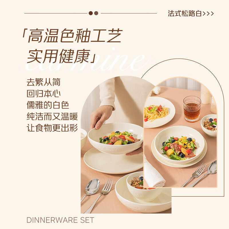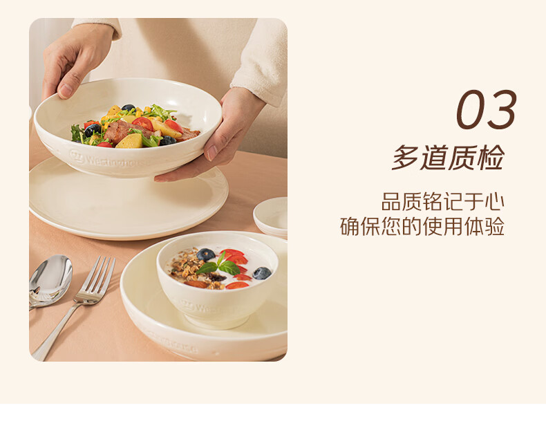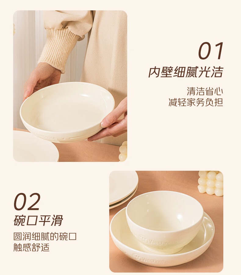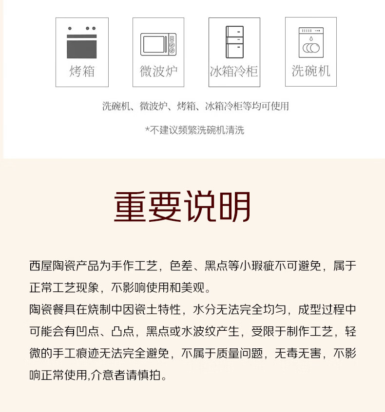 中温炻瓷材质,瓷质温润细腻;独有天然植物材料调色,色感亮丽,耐看,健康环保;可进洗碗机,烤箱,微波炉,消毒柜