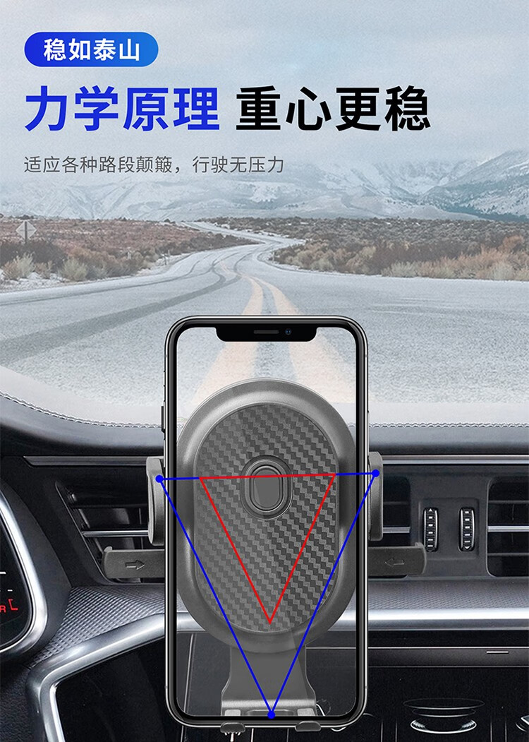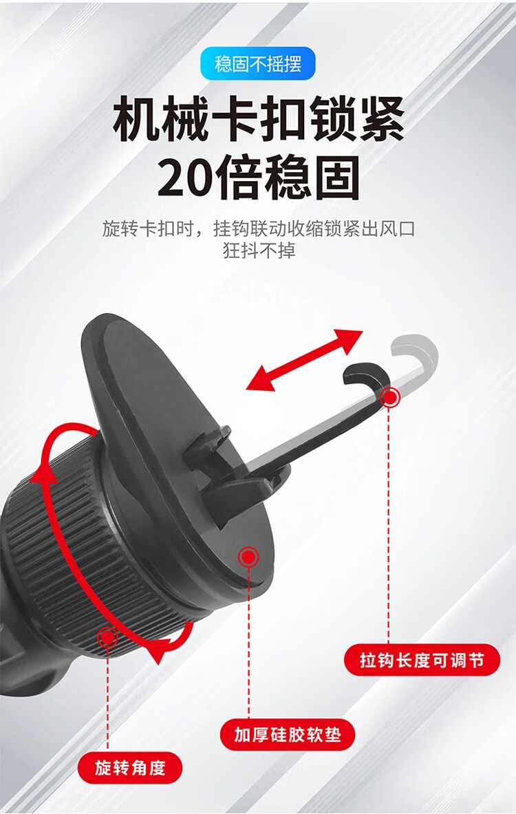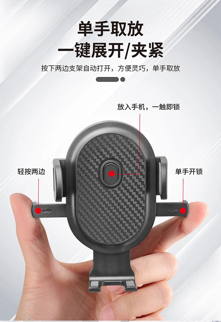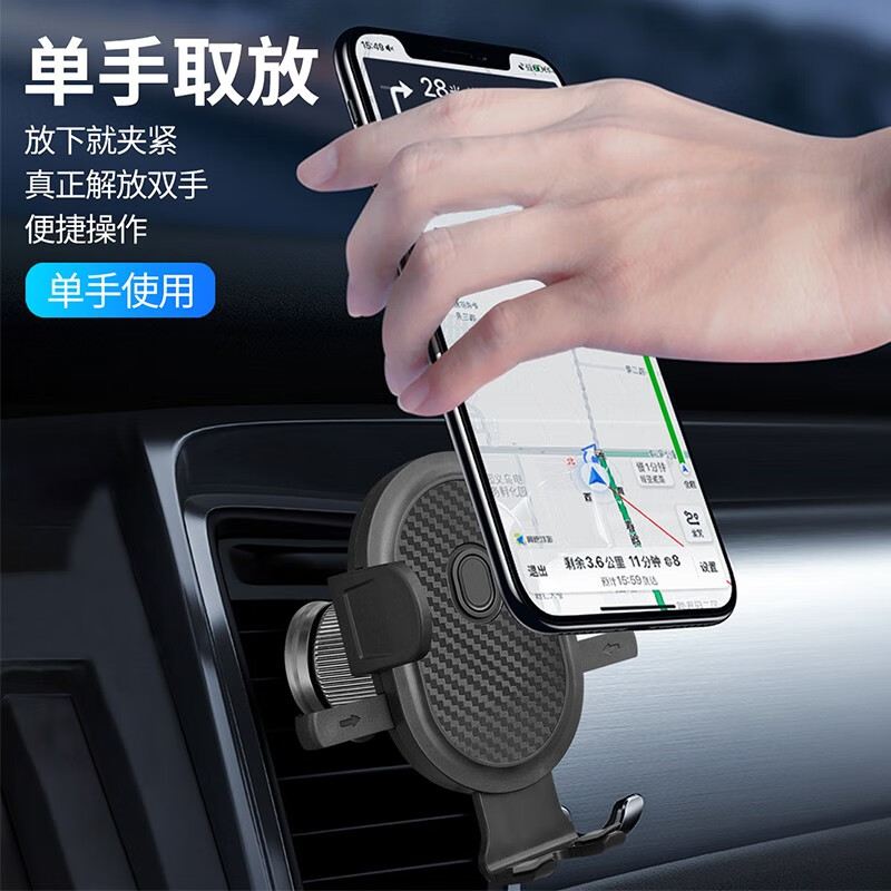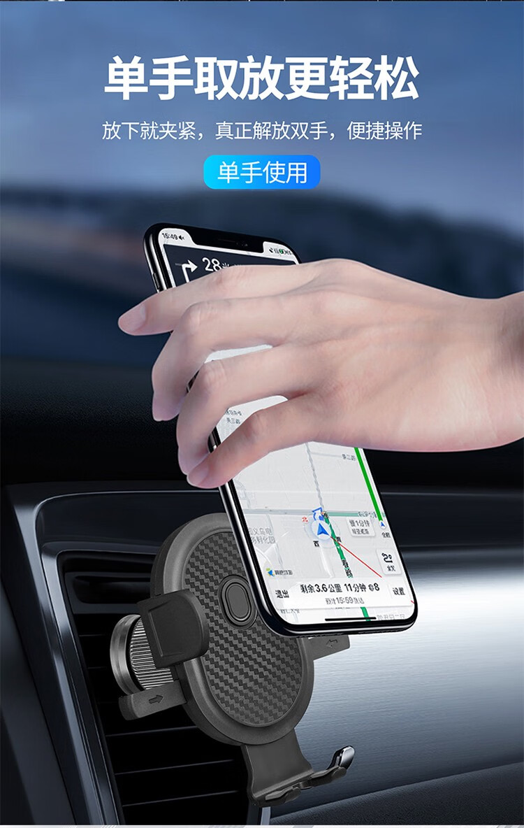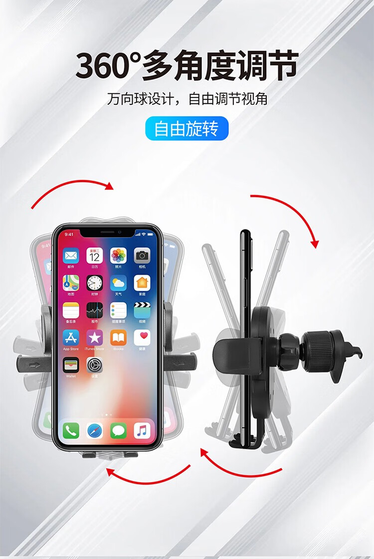 自动夹紧,坚实耐用;主动锁车载出风口支架,单手操作,易放易取;360°自由旋转调整,适用于99%车型