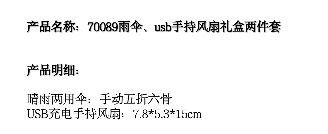 配置清单:雨伞*1;usb 风扇*1;礼袋*1
