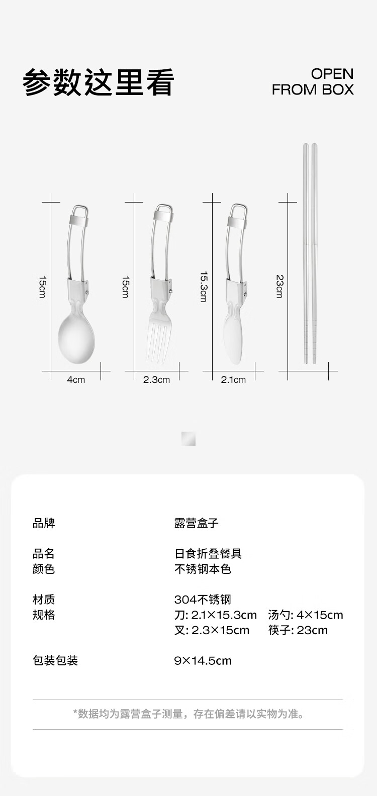 配置清单:304不锈钢 刀:2.1X15.3cm 汤勺:4X15cm 又:2.3X15cm 筷子:23cm