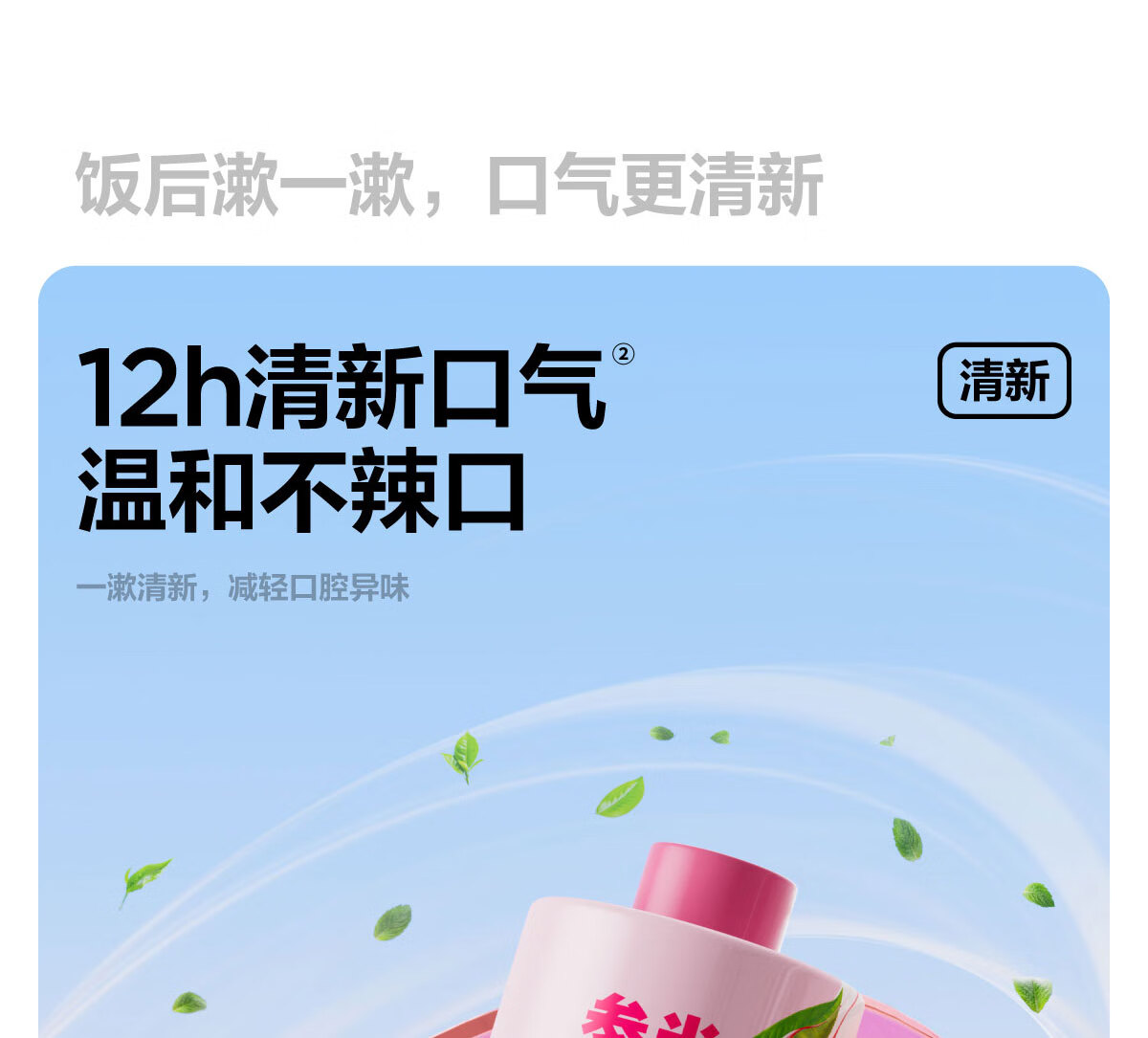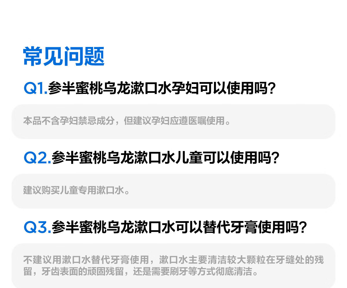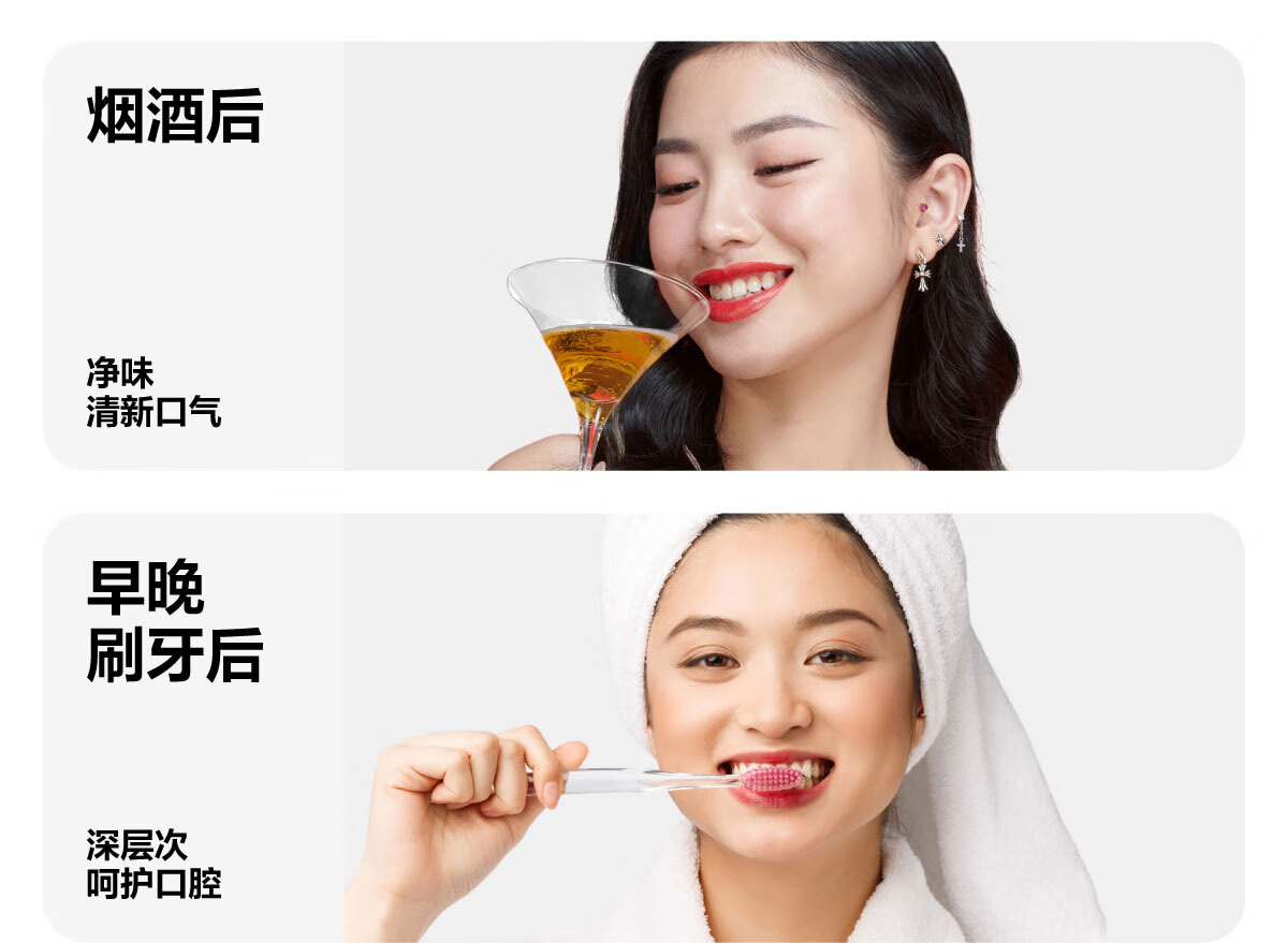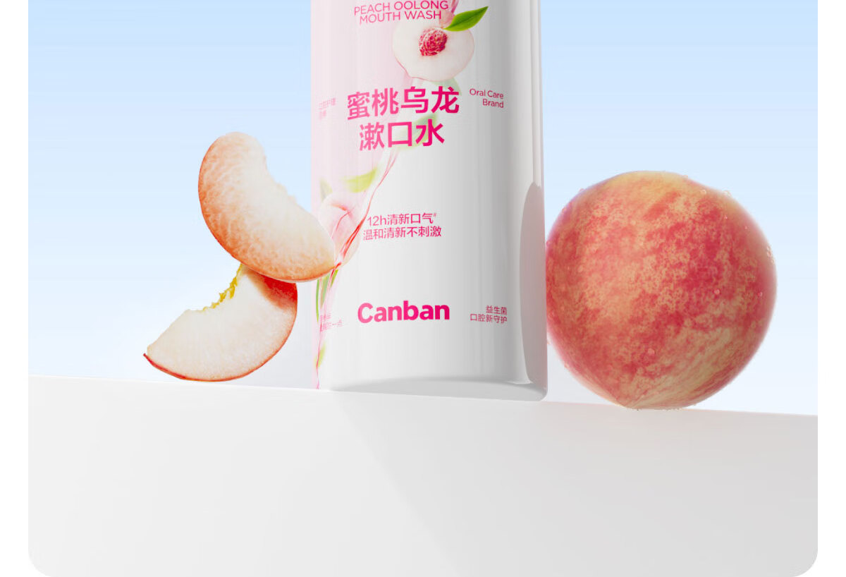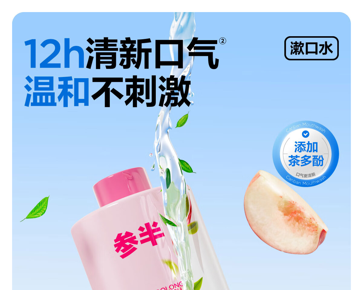 0 酒精温和配方,不辣口,敏感口腔也能用;蜜桃乌龙果香,清新口气,持久留香;深层清洁口腔,饭后漱口,便捷护齿