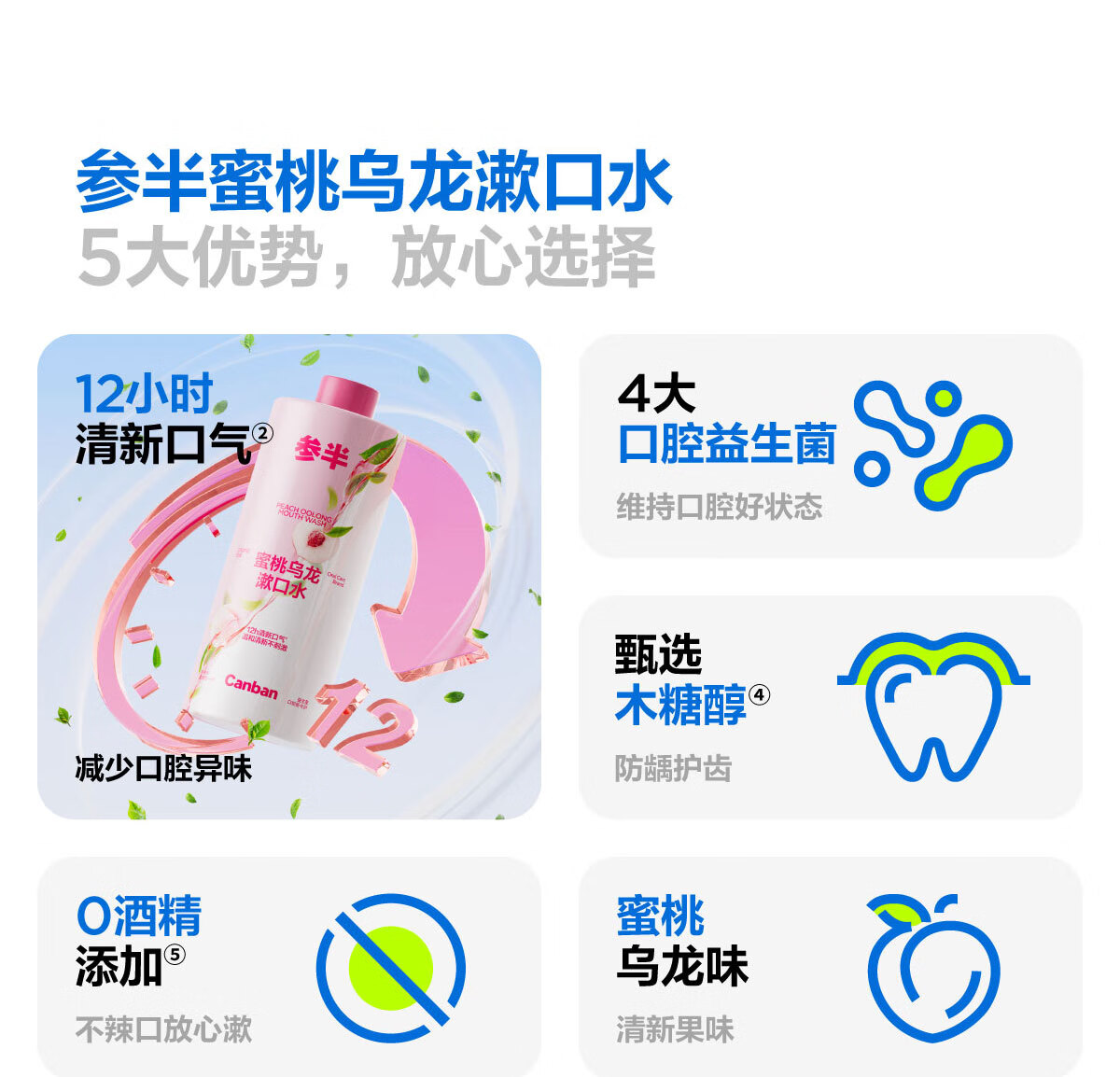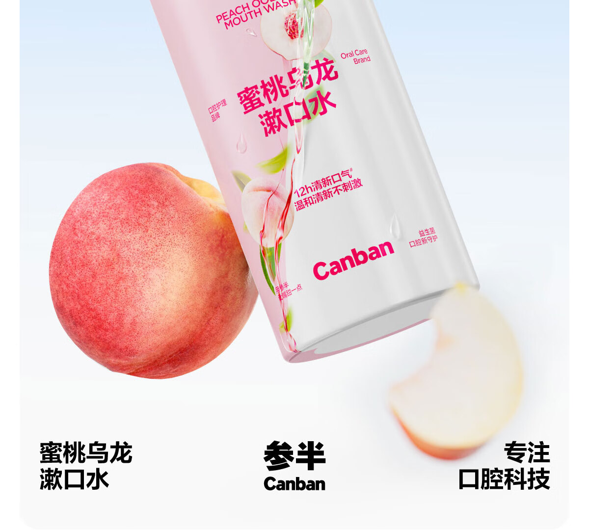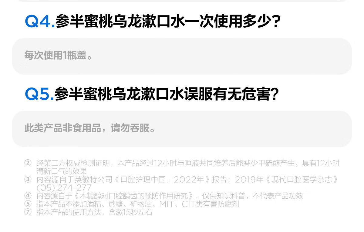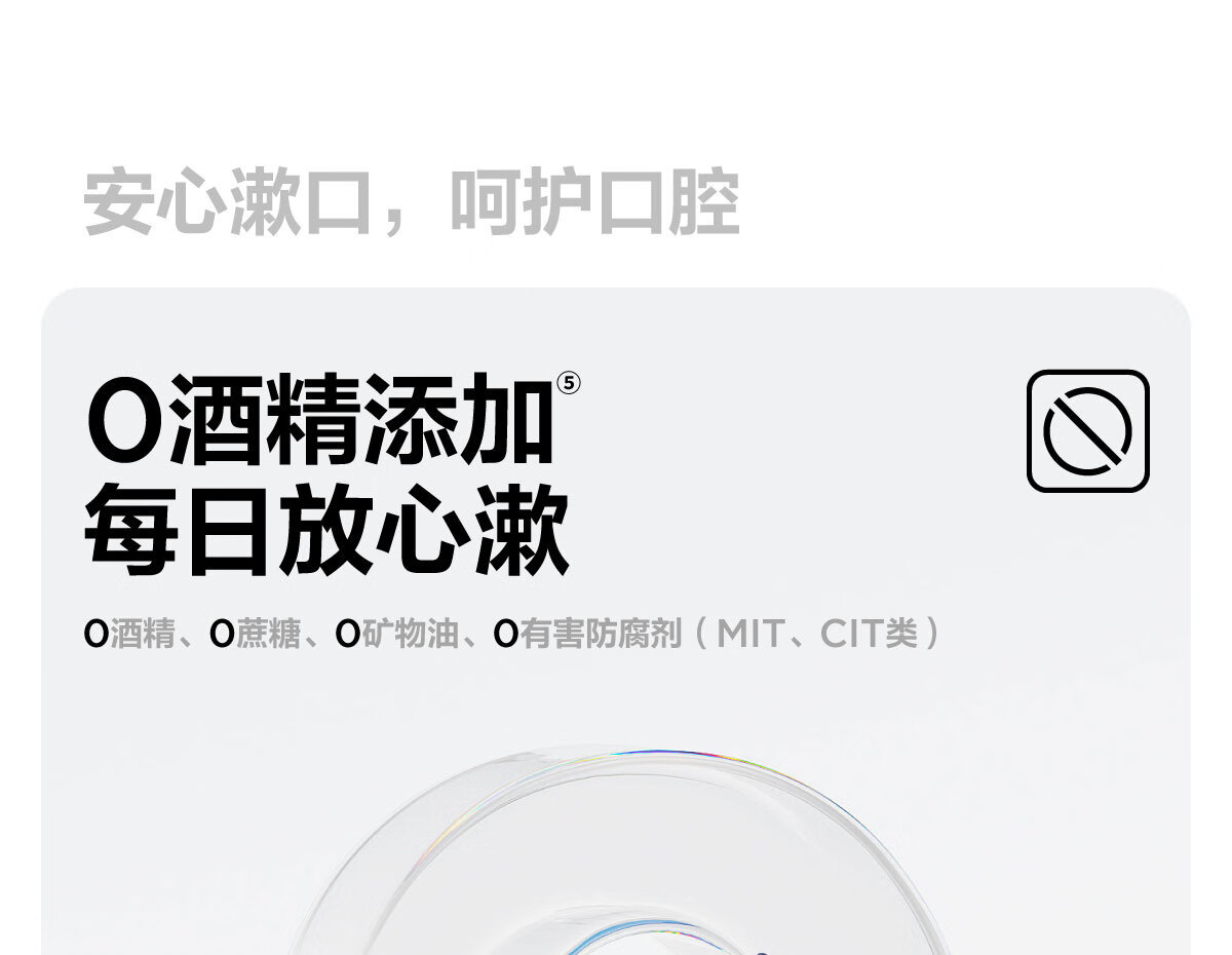 0 酒精温和配方,不辣口,敏感口腔也能用;蜜桃乌龙果香,清新口气,持久留香;深层清洁口腔,饭后漱口,便捷护齿