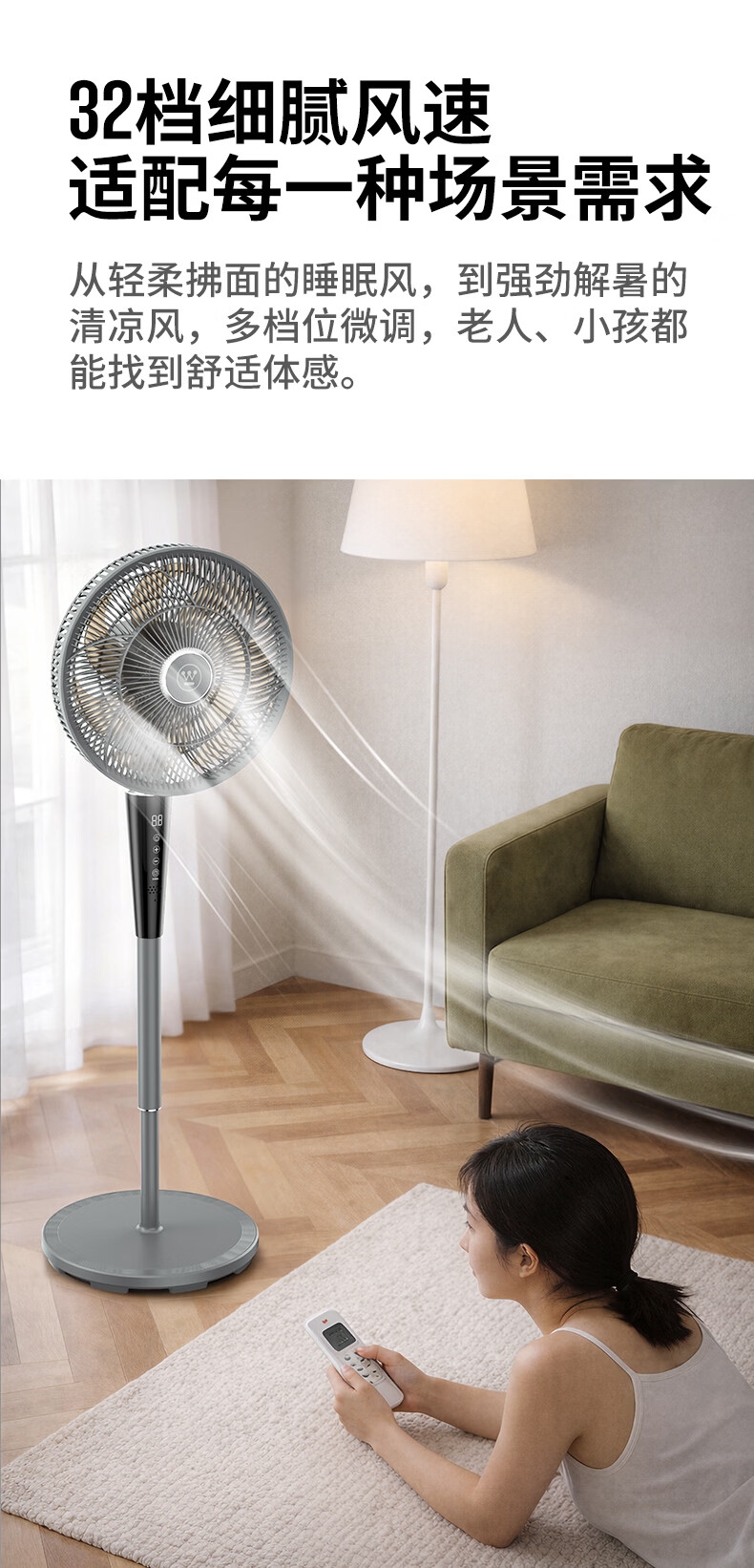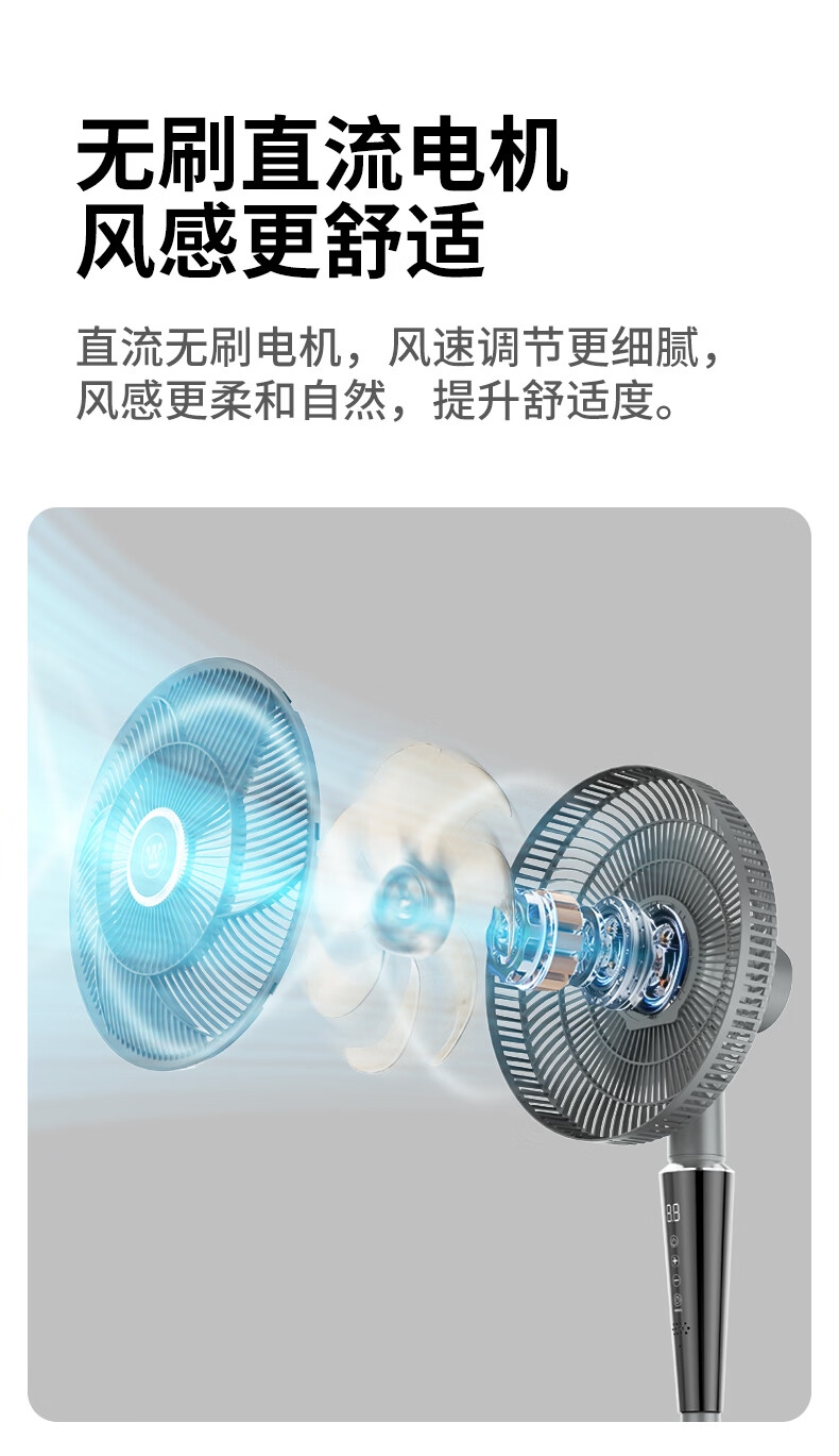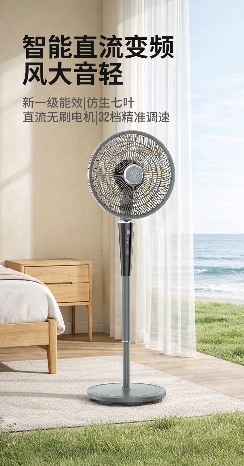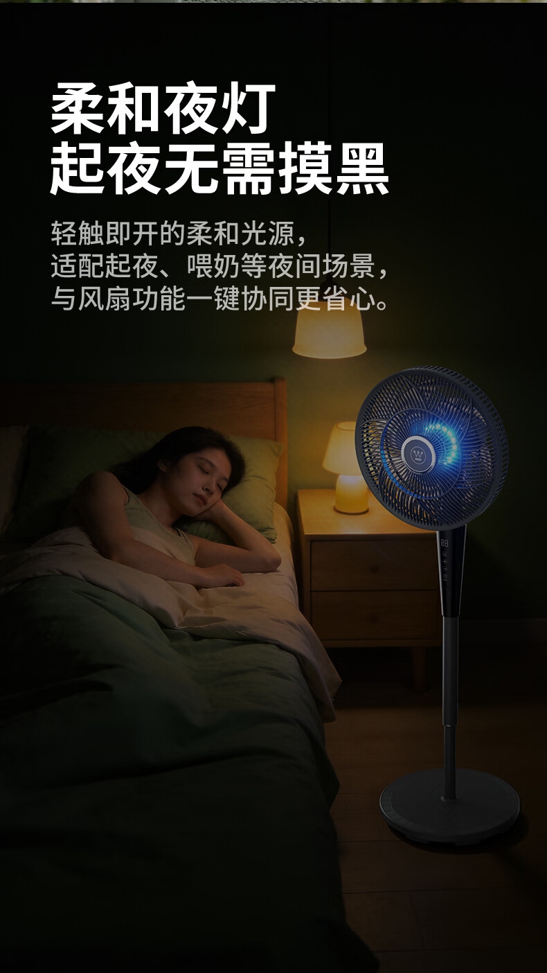 一级能效 32档风速调节 直流无刷电机;智慧语音/触屏/遥控/小程序多种控制方式;超声波驱蚊 自然、睡眠、婴儿、正常风 氛围小夜灯
