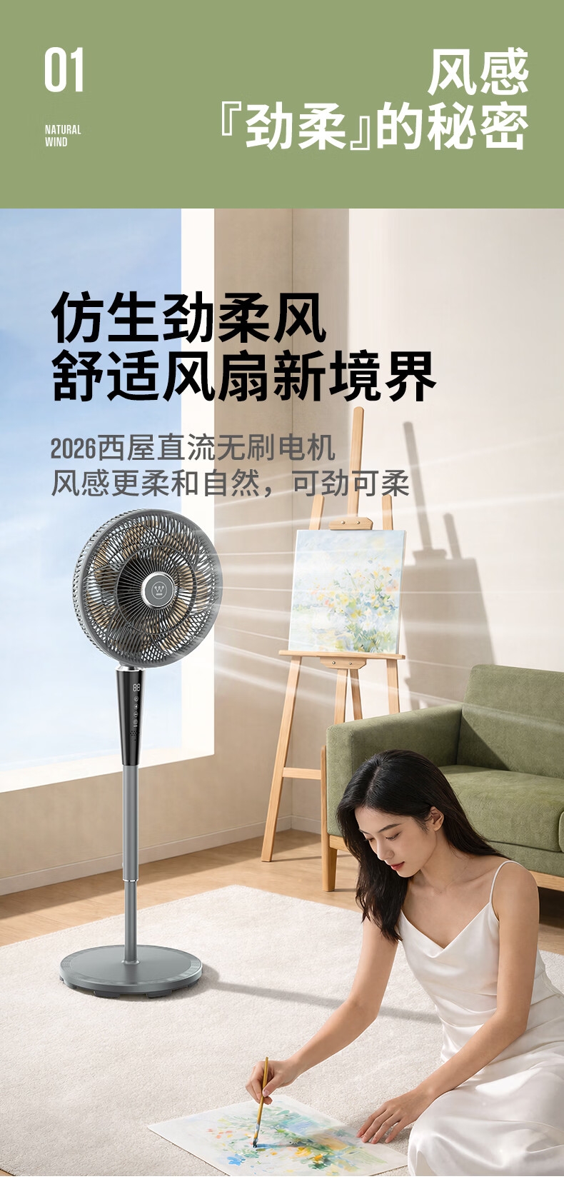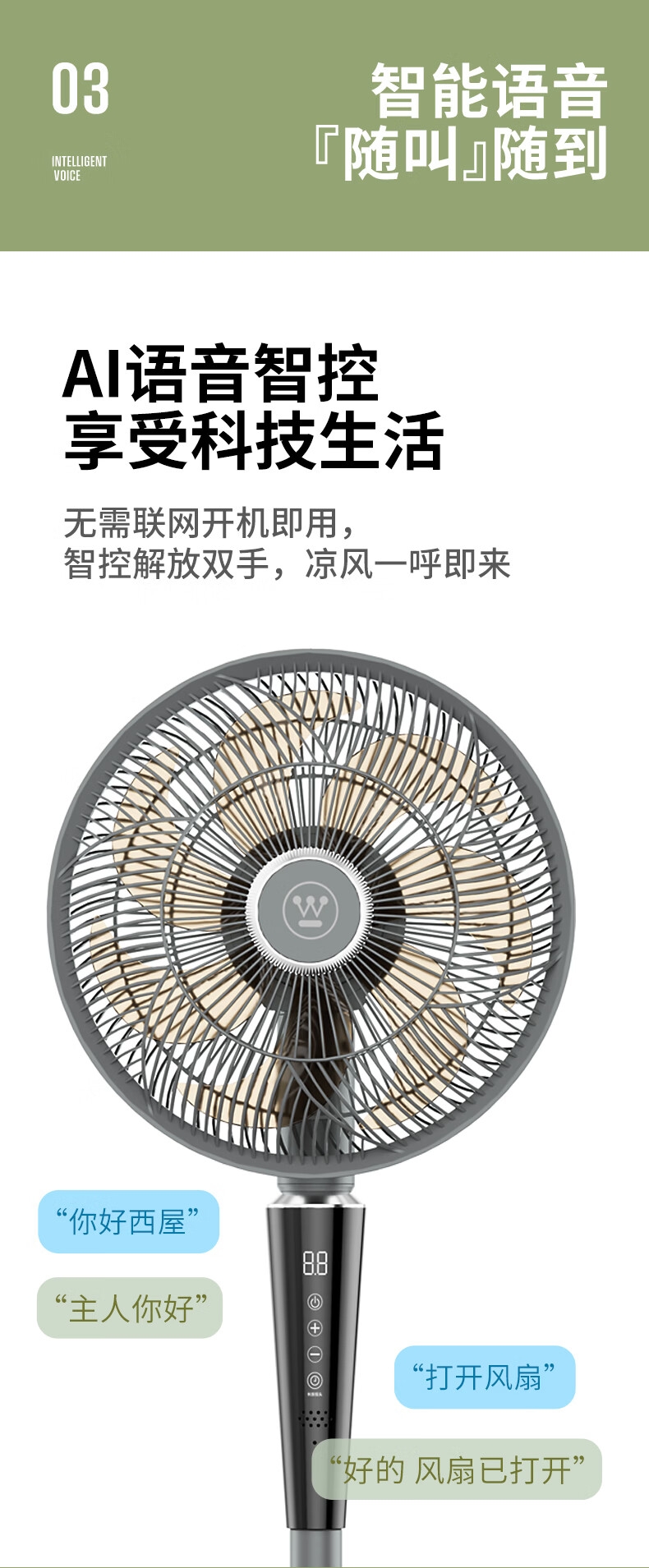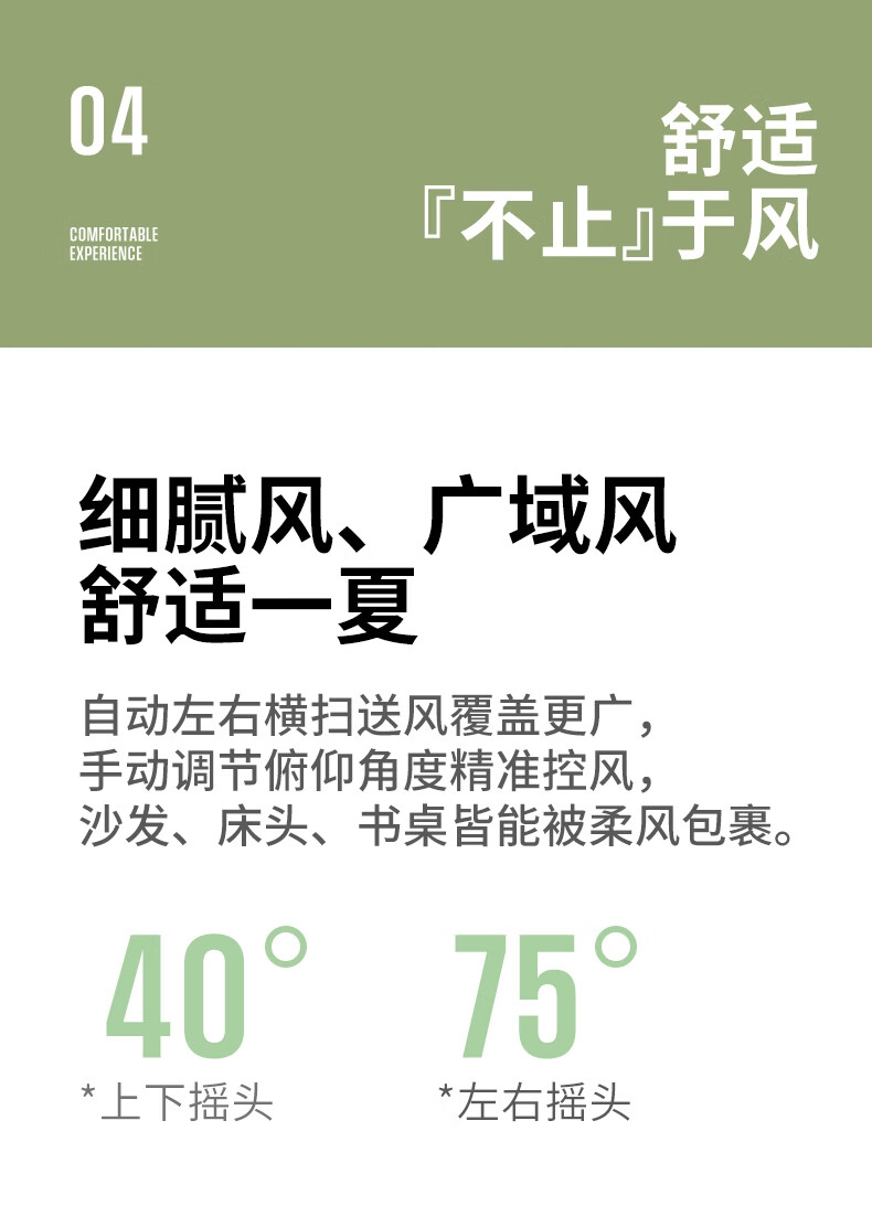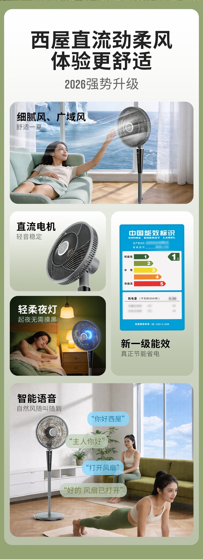 一级能效 32档风速调节 直流无刷电机;智慧语音/触屏/遥控/小程序多种控制方式;超声波驱蚊 自然、睡眠、婴儿、正常风 氛围小夜灯