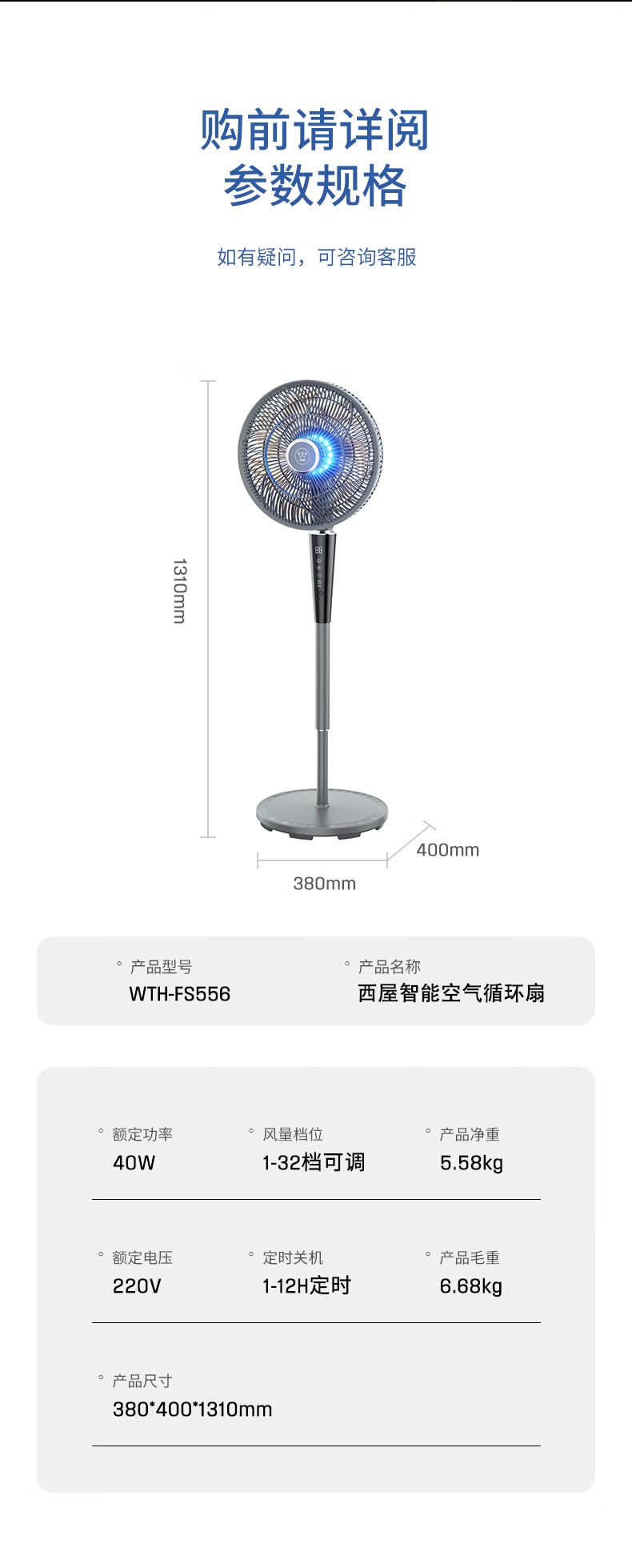 西屋 一级能效直流平面电风扇静音循环WTH-FS556