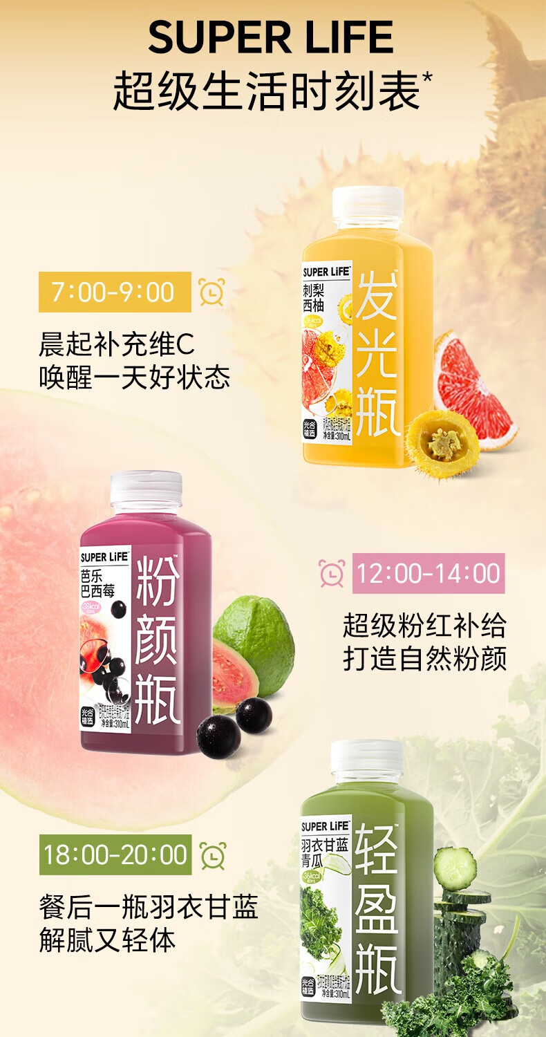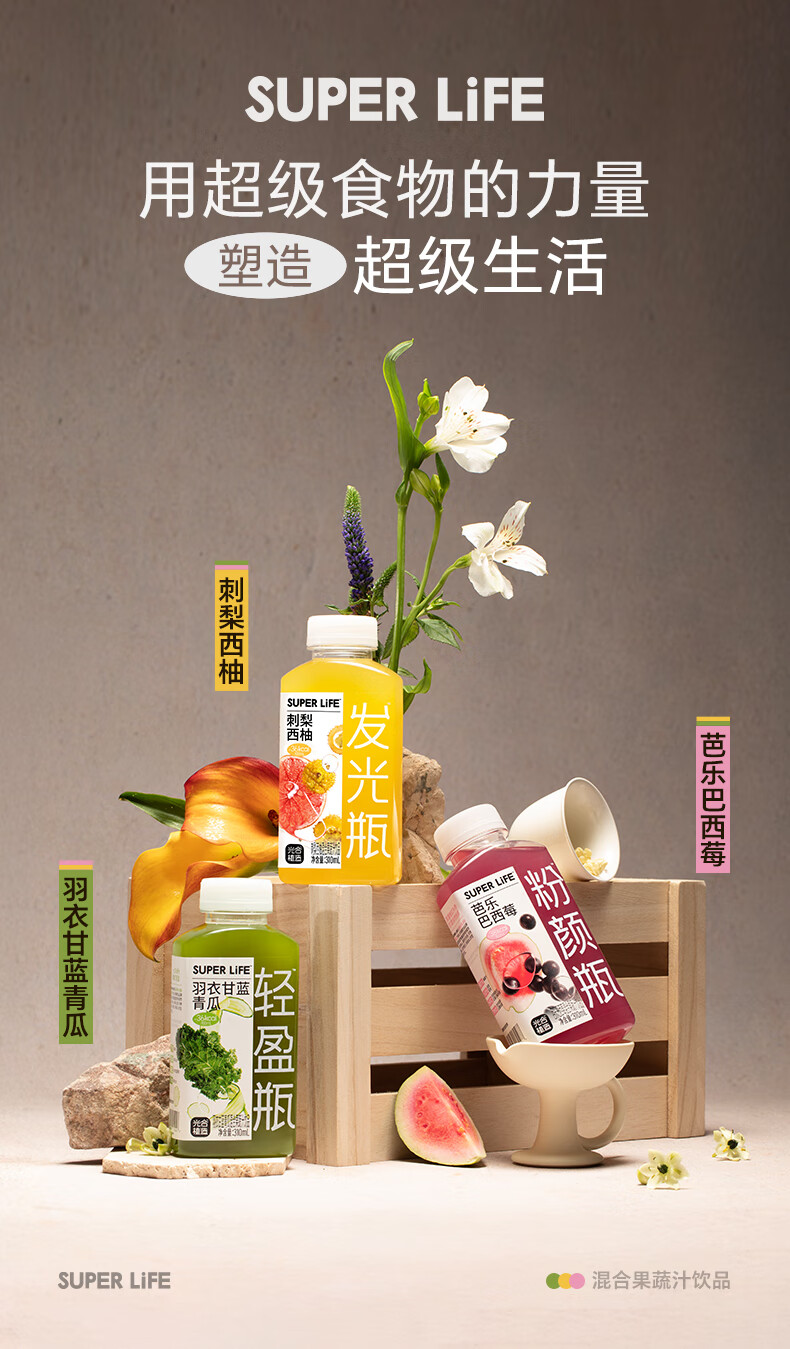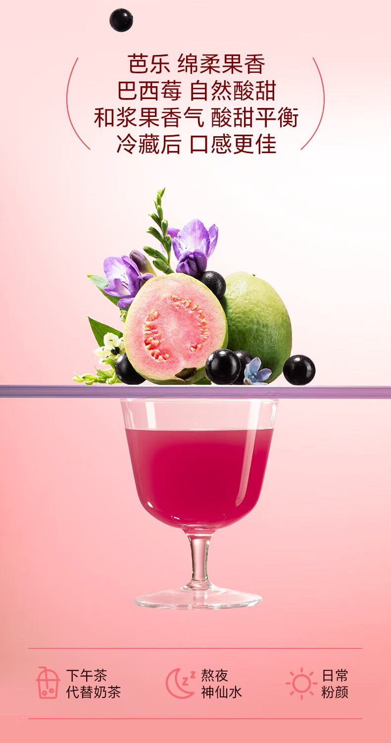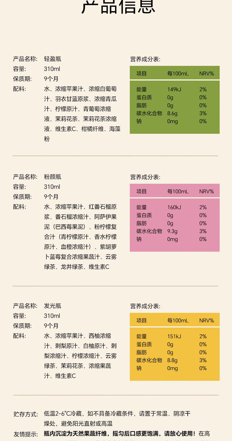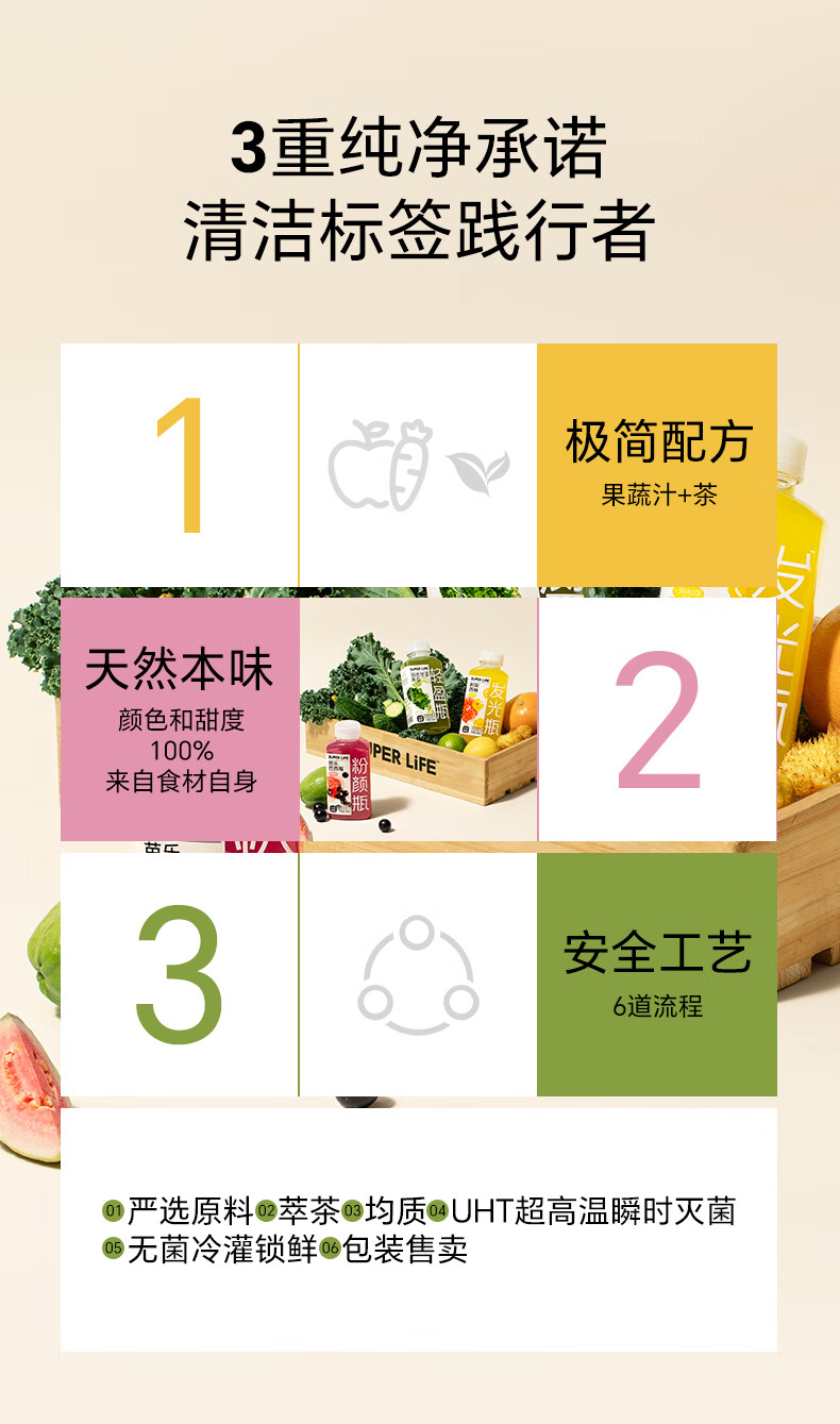 极简配方,果蔬和茶;天然本味,颜色来自果蔬本身;工艺安全