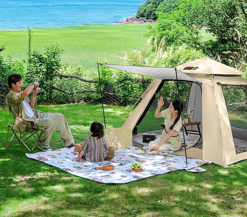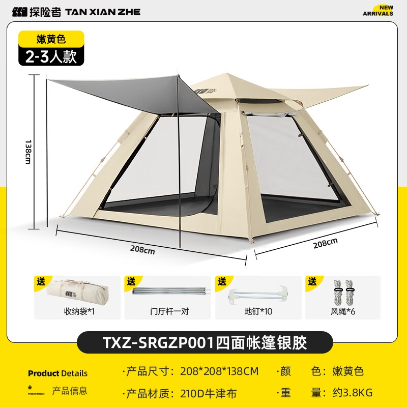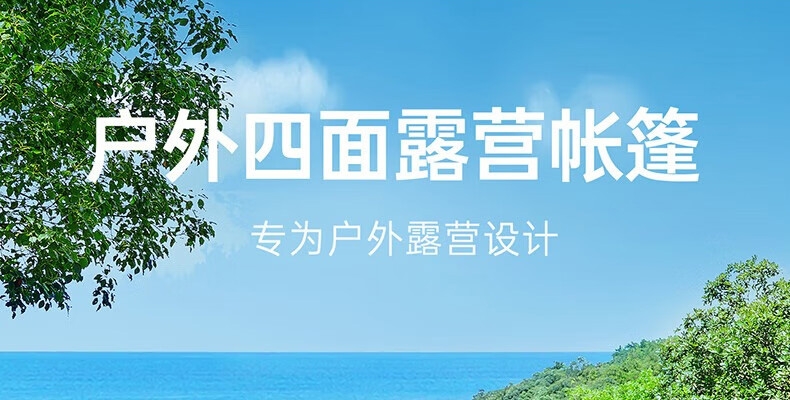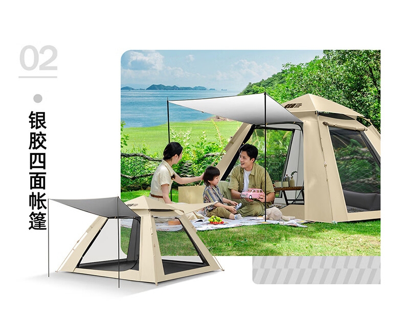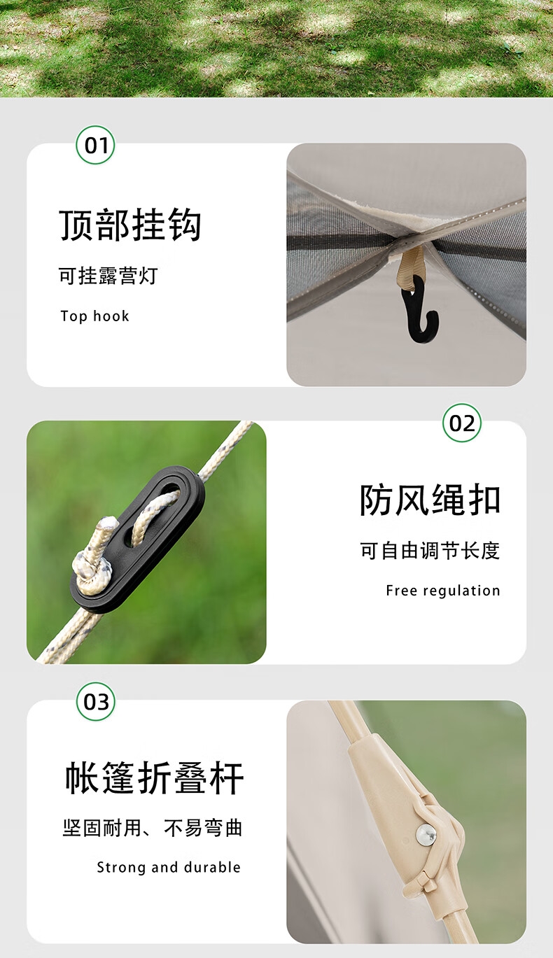银胶四面帐篷;顶部挂钩,可挂露营灯;防风绳扣,可自由调节长度