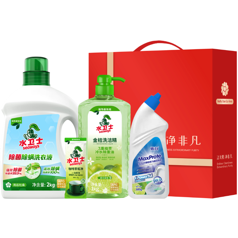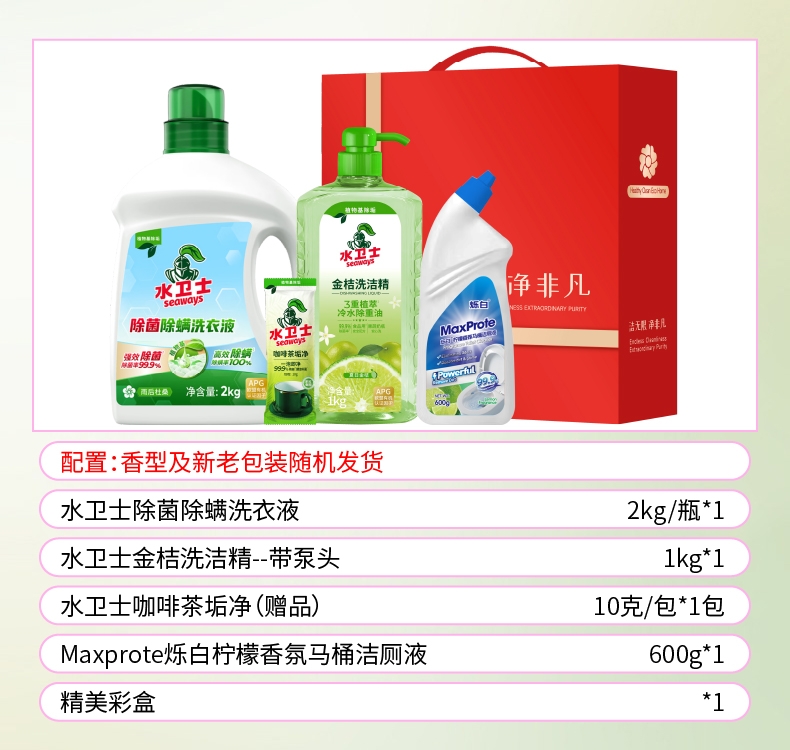 配置清单:水卫士除菌除螨洗衣液2kg/瓶*1 水卫士金桔洗洁精--带泵头1kg*1 水卫士咖啡茶垢净10克/包*1包(赠品) Maxprote烁白柠檬香氛马桶洁厕液600g*1 洁无限净非凡小礼盒*1