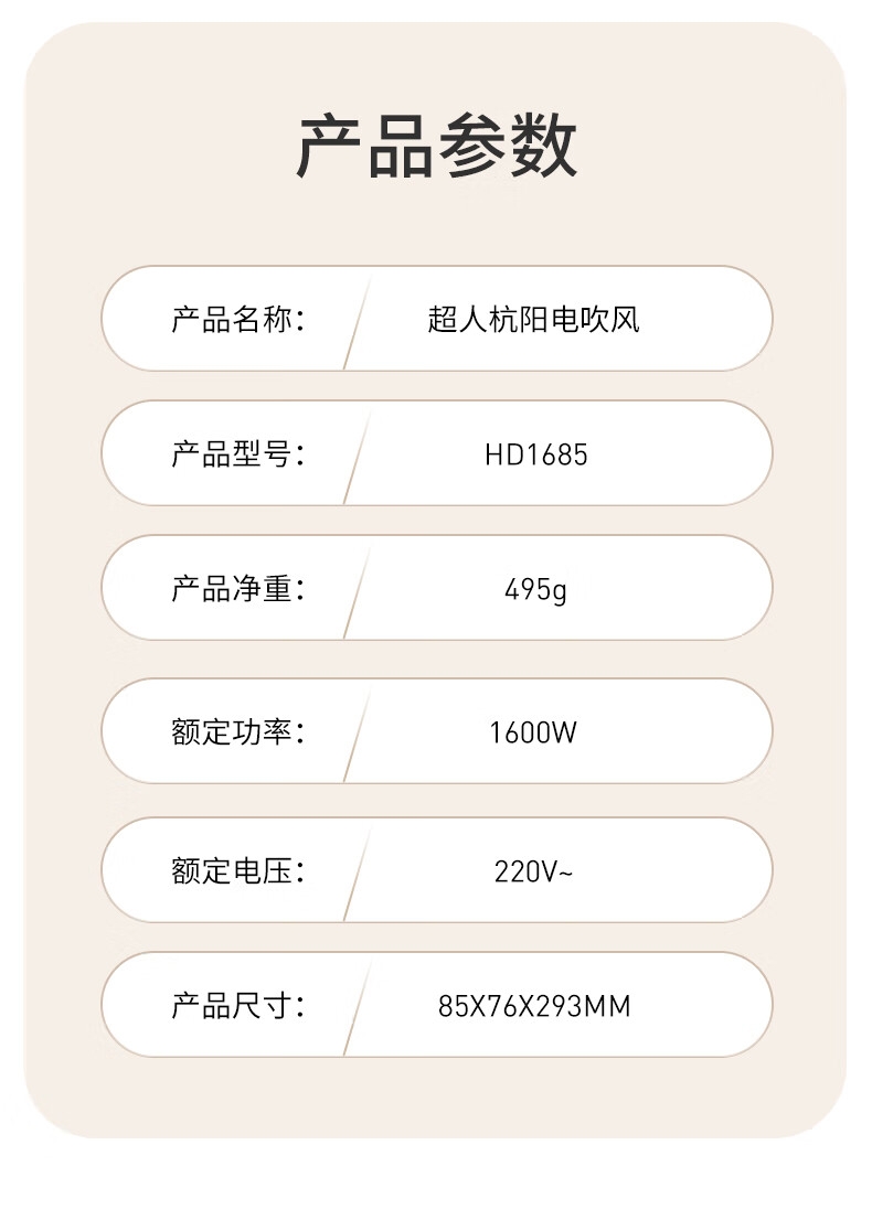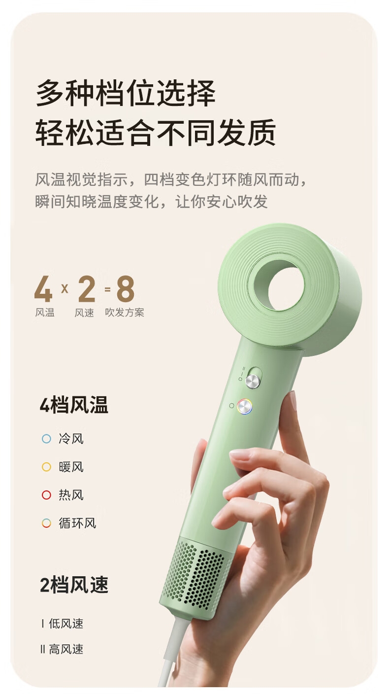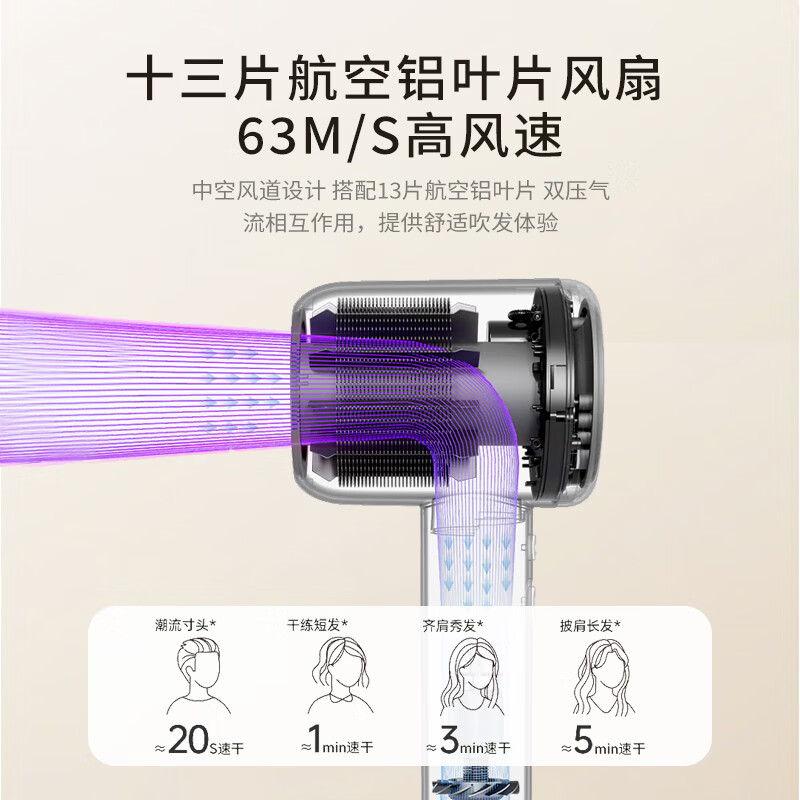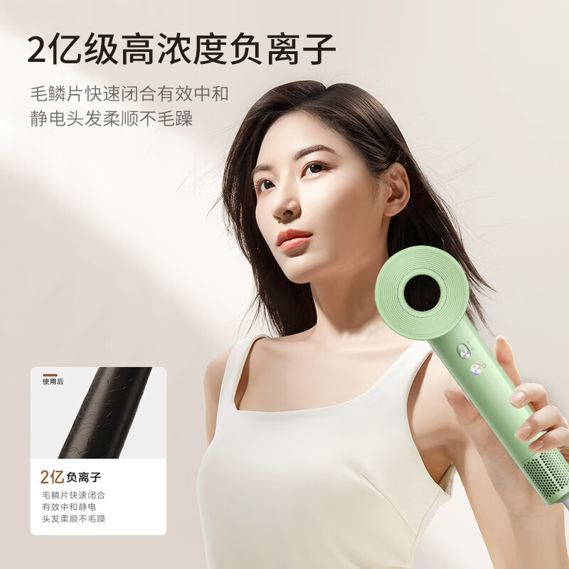 创新中控风道,颠覆传统吹发模式;11万高速无刷马达,强劲风速,快递吹干;2亿级高浓度负离子,深层滋养每一根发丝