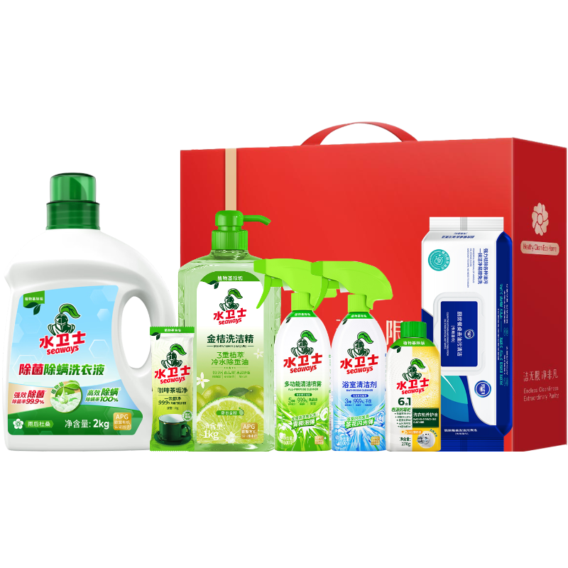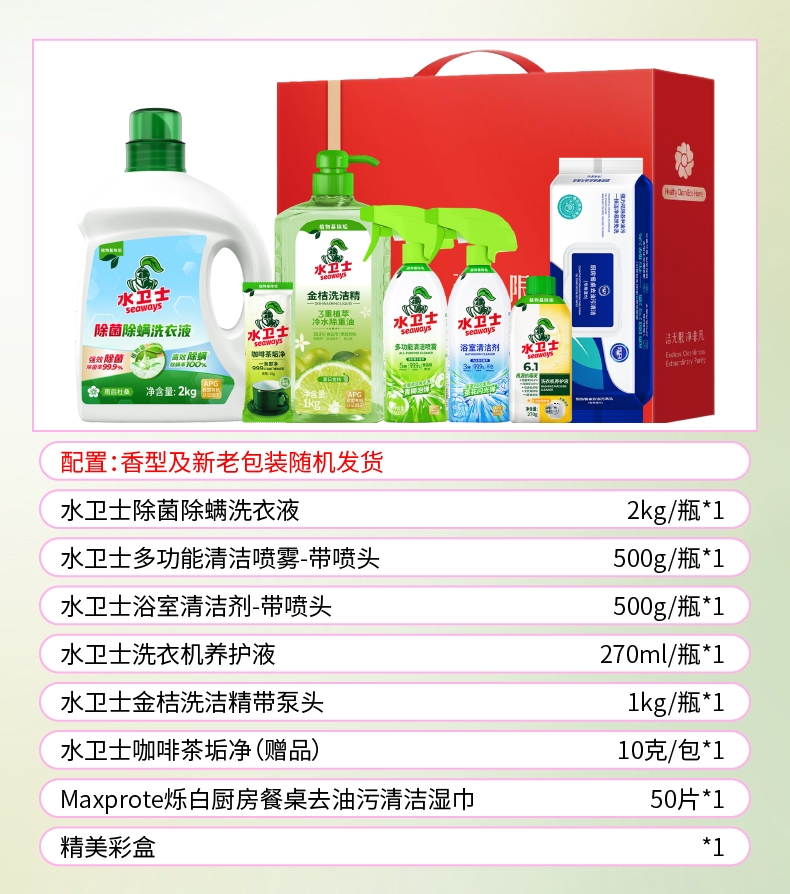 配置清单:水卫士除菌除螨洗衣液2kg/瓶*1 水卫士多功能清洁喷雾-带喷头500g/瓶*1 水卫士浴室清洁剂-带喷头500g/瓶*1 水卫士洗衣机养护液270ml/瓶*1 水卫士金桔洗洁精带泵头1kg/瓶*1 水卫士咖啡茶垢净10克/包*1(赠品) Maxprote烁白厨房餐桌去油污清洁湿巾50片*1 洁无限净非凡中礼盒*1