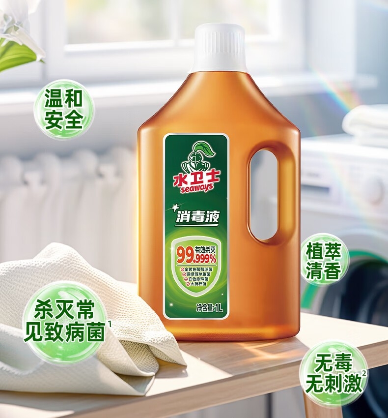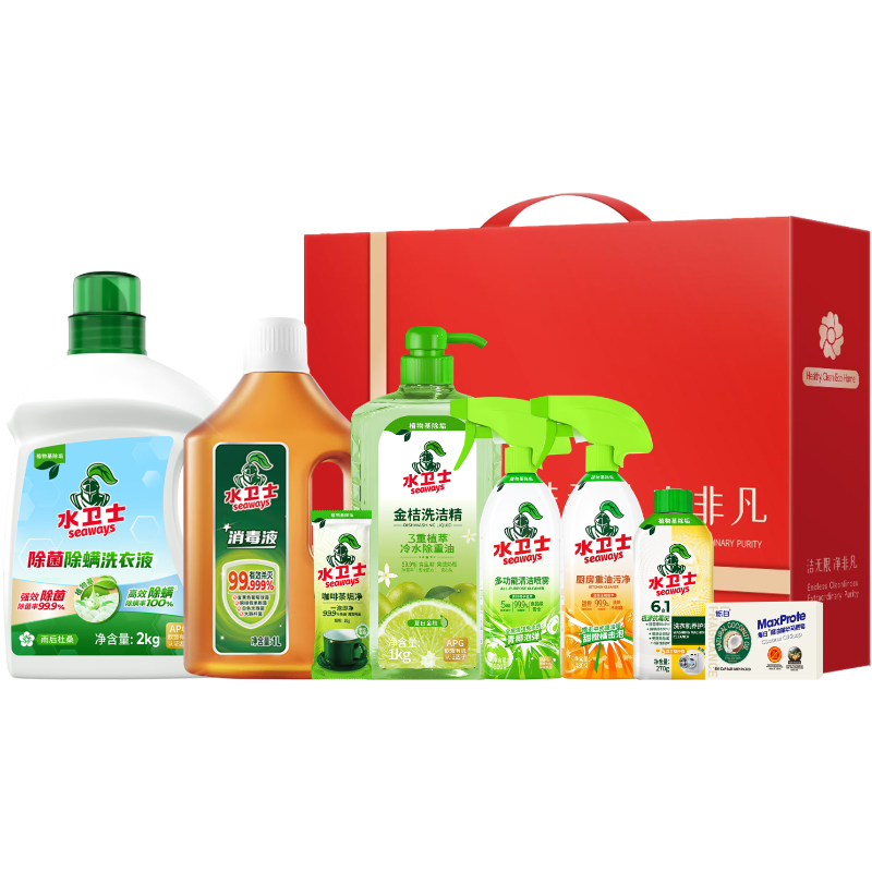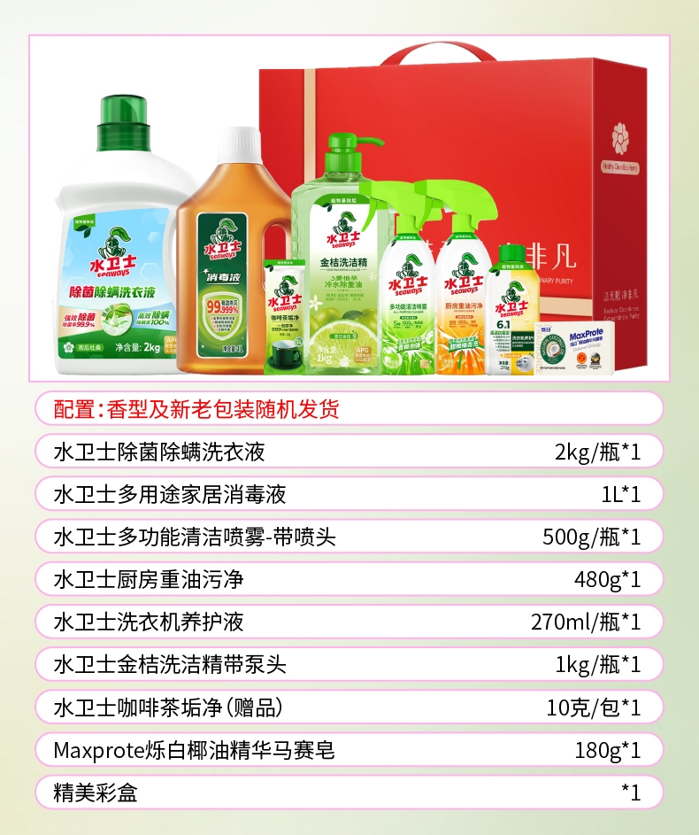配置清单:水卫士除菌除螨洗衣液2kg/瓶*1 水卫士多用途家居消毒液1L*1 水卫士多功能清洁喷雾-带喷头500g/瓶*1 水卫士厨房重油污净480g*1 水卫士洗衣机养护液270ml/瓶*1 水卫士金桔洗洁精带泵头1kg/瓶*1 水卫士咖啡茶垢净10克/包*1(赠品) Maxprote烁白椰油精华马赛皂180g*1 洁无限净非凡中礼盒*1