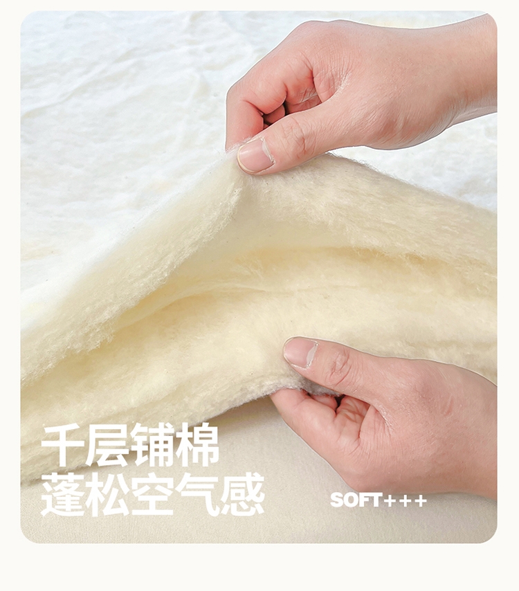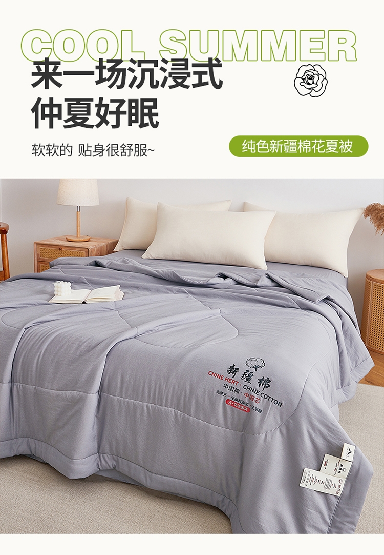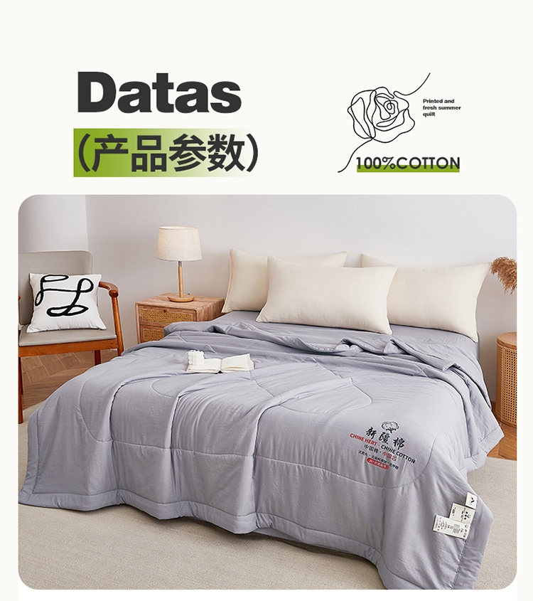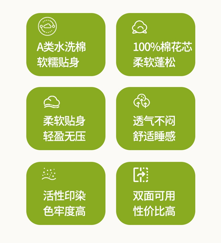 采用亲肤的材质,柔软触感,手感舒适。;新疆棉花填充 ,柔软舒适。;活性印染 |,新一代印染工艺,色牢度高,不易褪色。