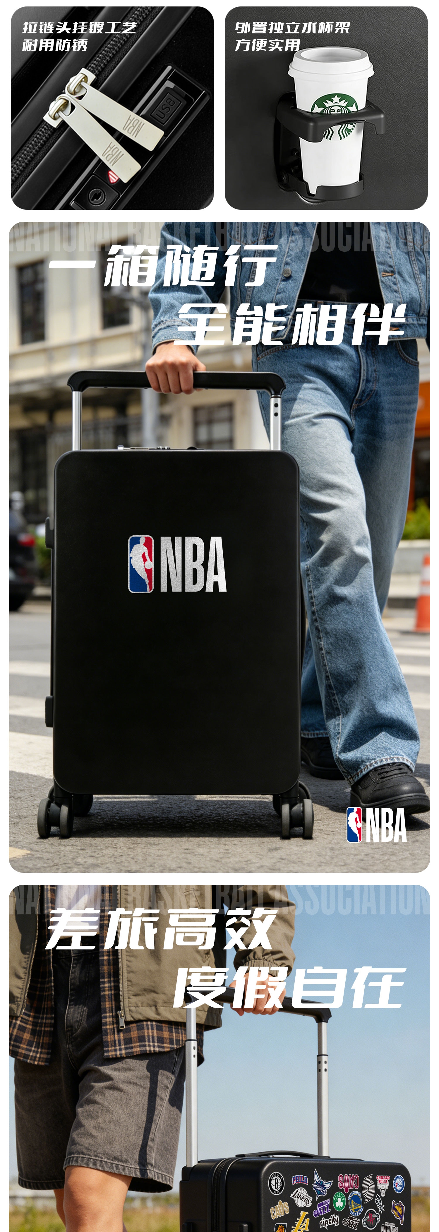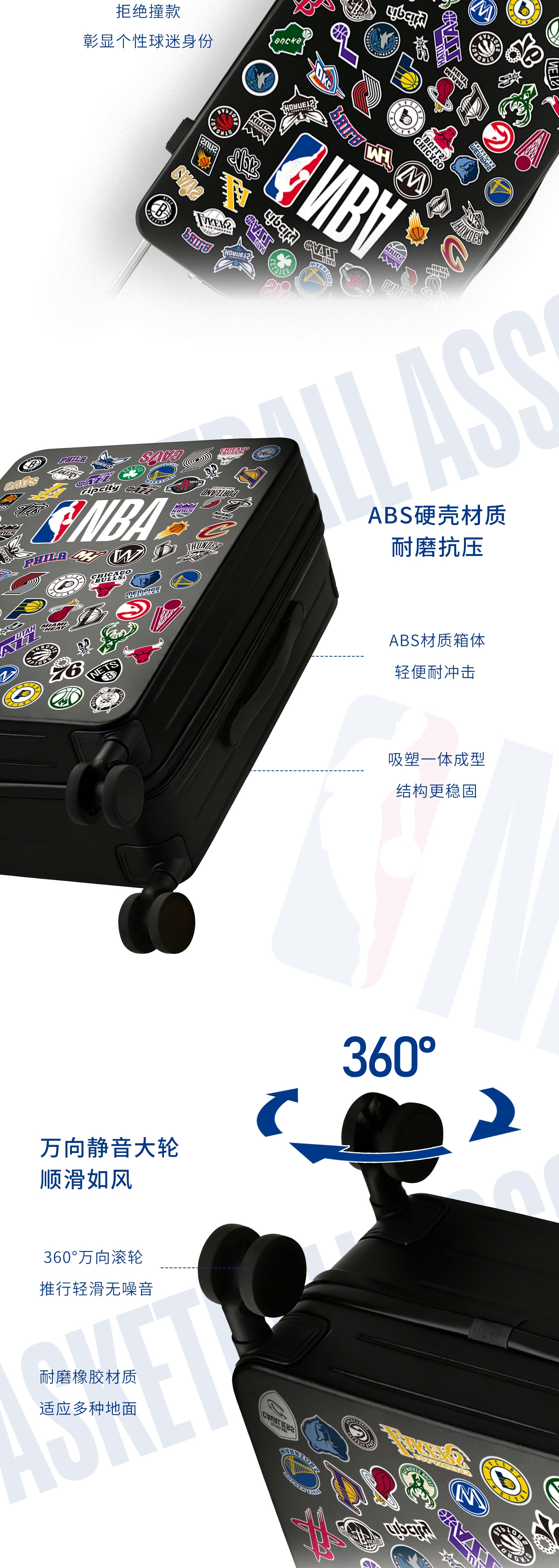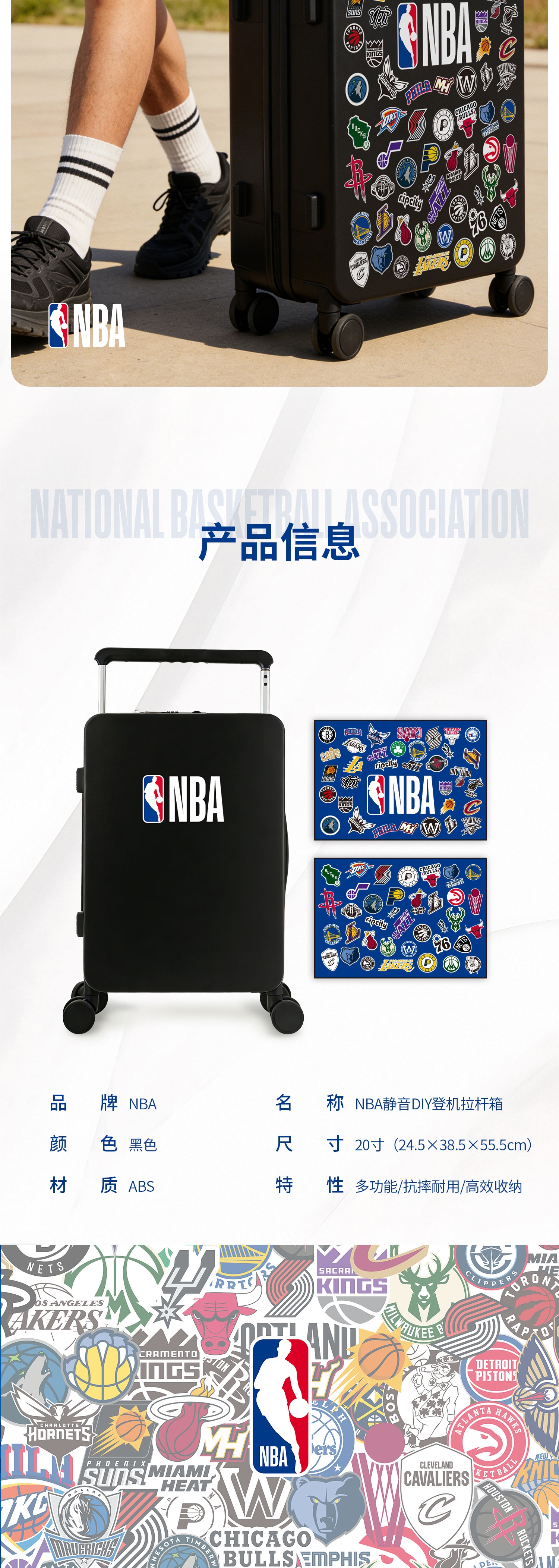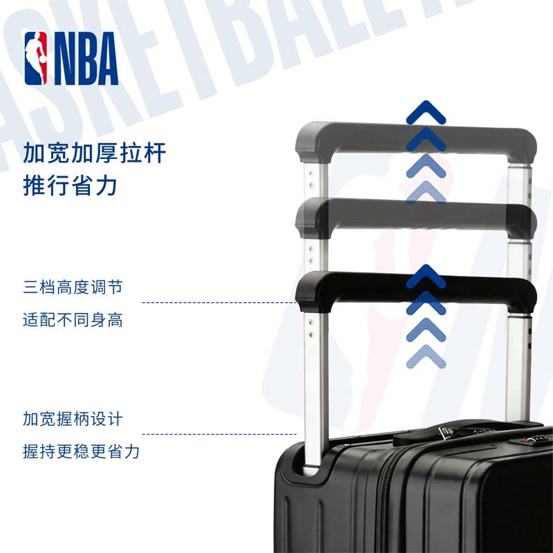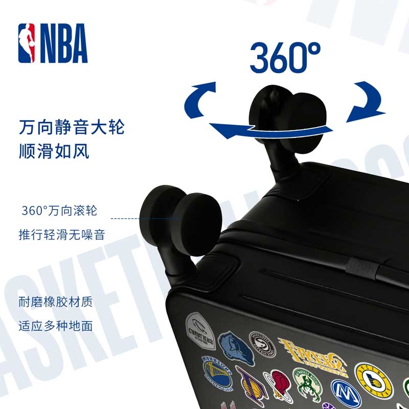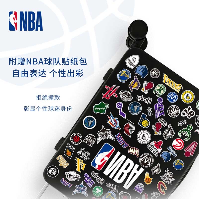 NBA 官方元素 + DIY 贴纸自由,个性拉满;硬壳耐磨材质 + 实用结构,兼顾颜值与耐用性;万向顺滑静音大轮、加粗加厚全铝拉杆