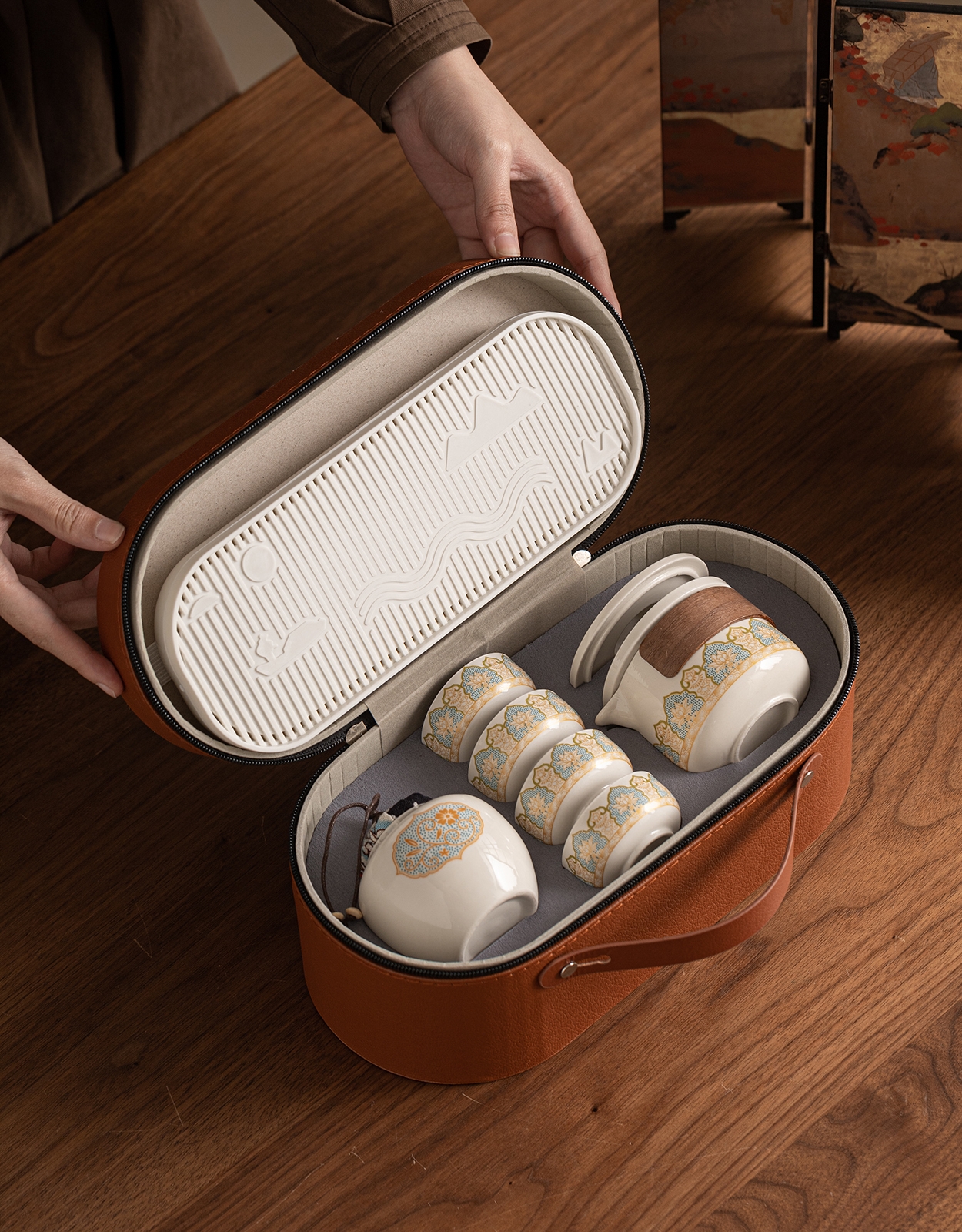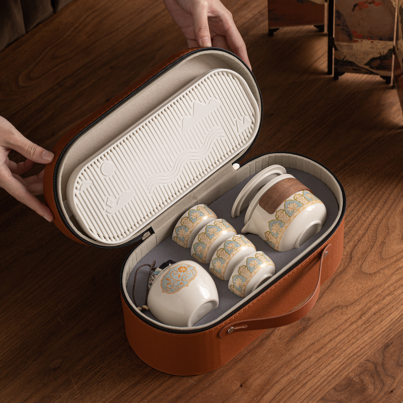 配备专属棕色皮质收纳包,能随时随地享受品茶乐趣;茶具表面装饰有精美的花纹图案,色彩搭配和谐;茶具套装包含泡茶、饮茶、存茶及排水所需的基本工具