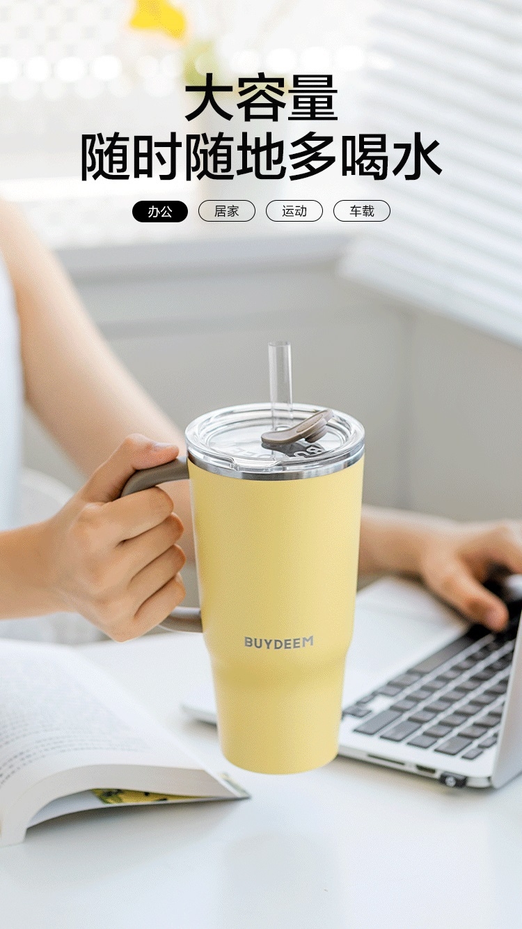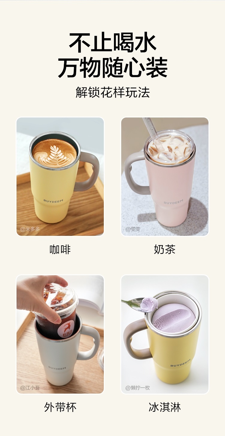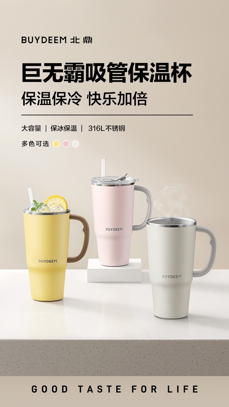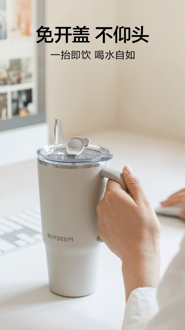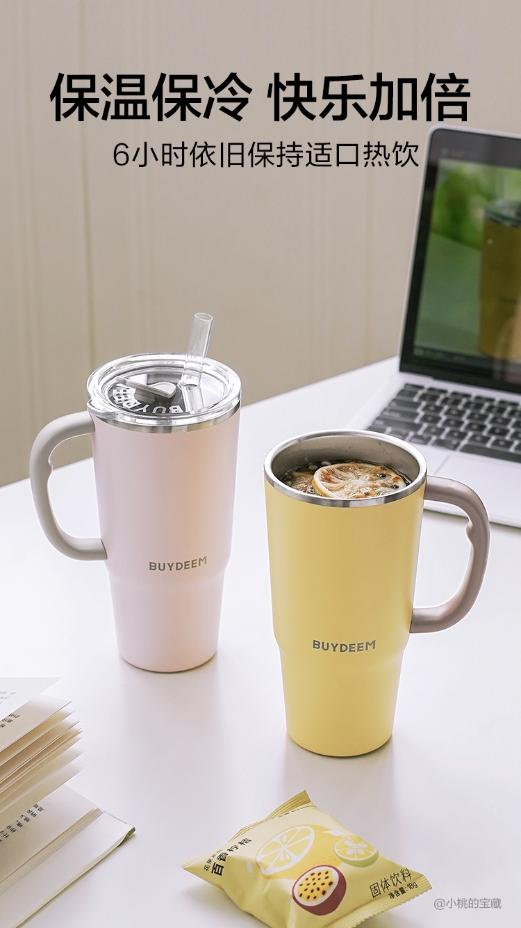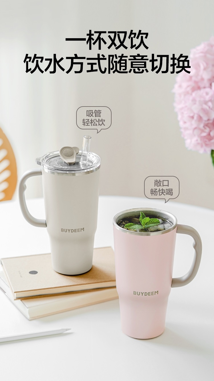 可保温、可保冷,一年四季都能用、快乐畅饮;750ml大容量,随时随地多喝水;双饮设计,可吸管饮水口红不沾杯,开盖即饮日常也方便