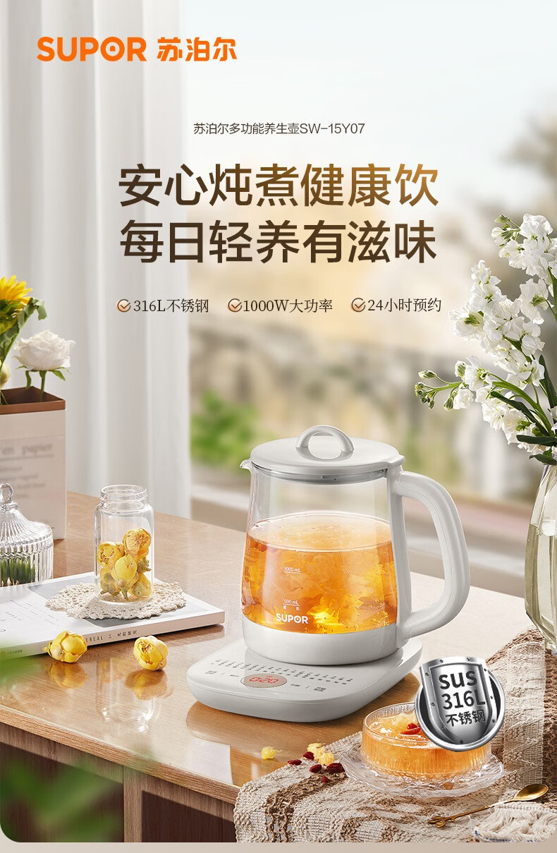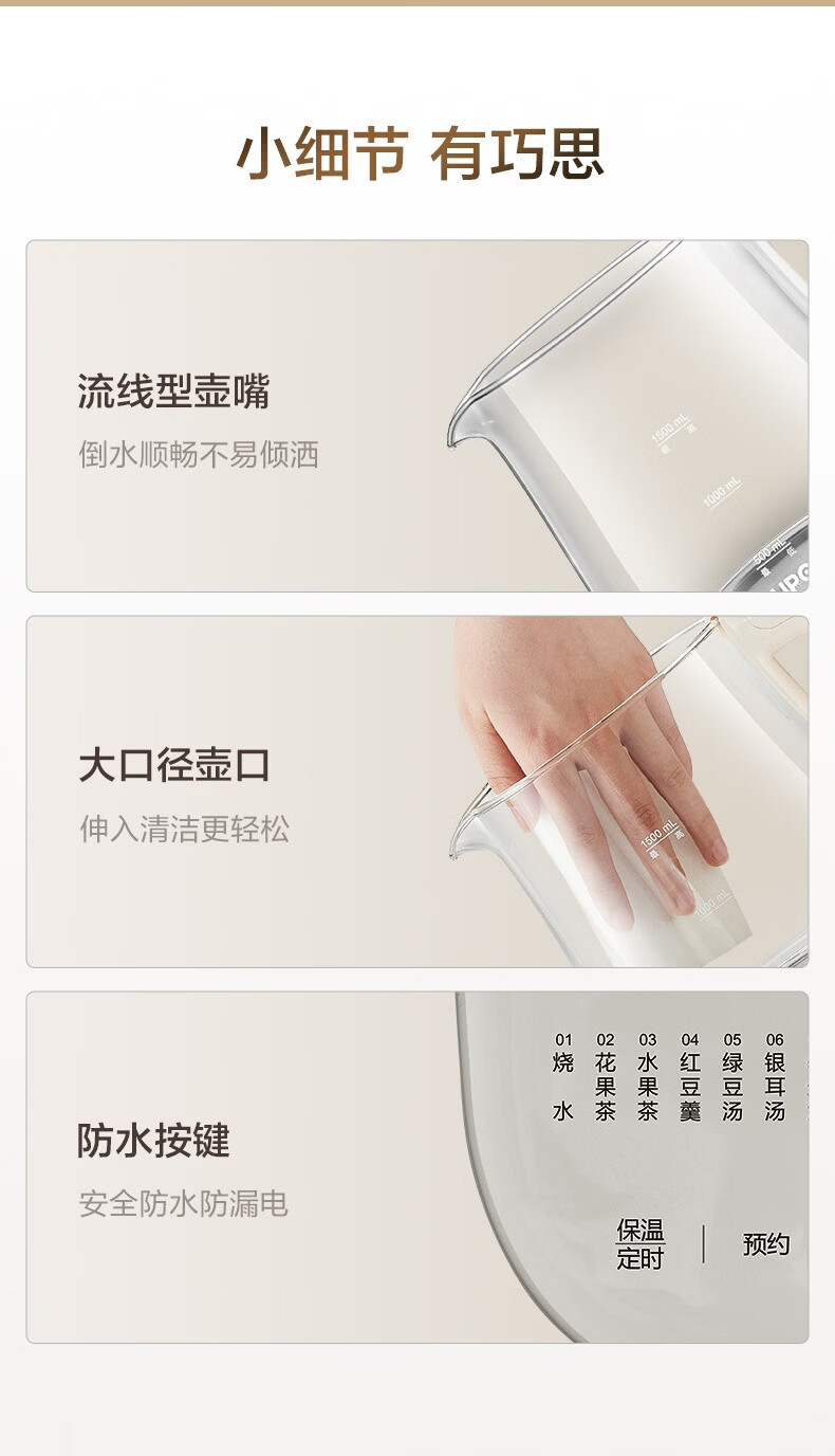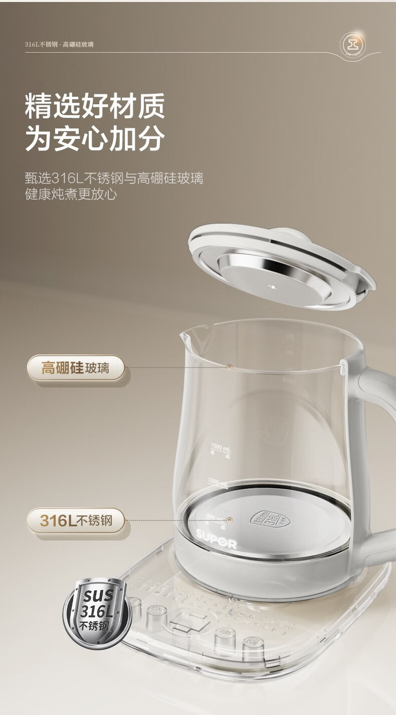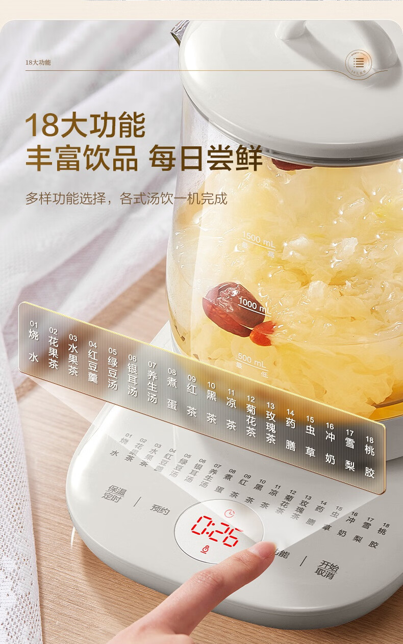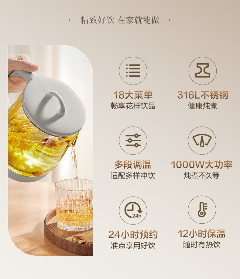 316L 不锈钢加热盘,健康更安心;18 大菜单,畅享花样饮品;1000W 大功率,炖煮不久等