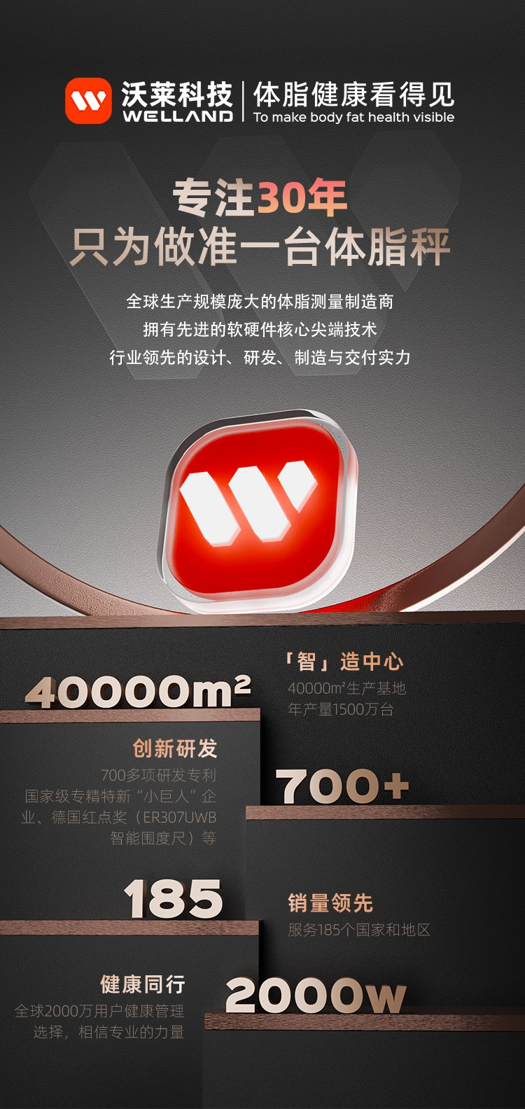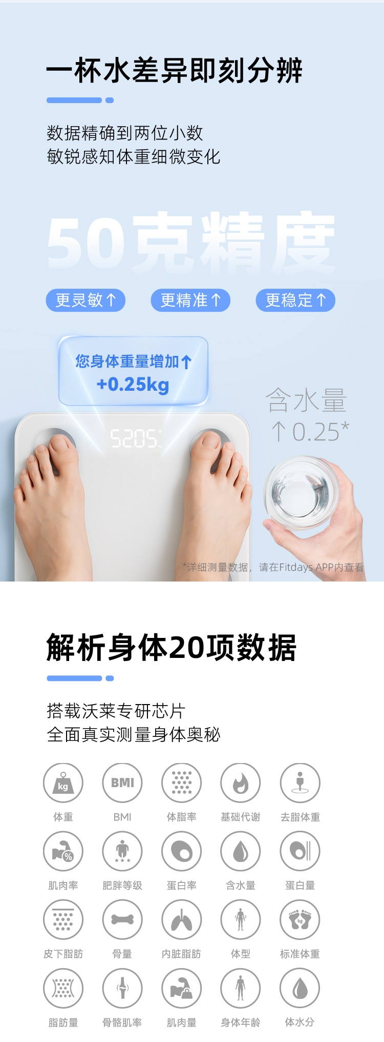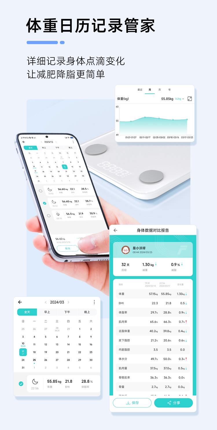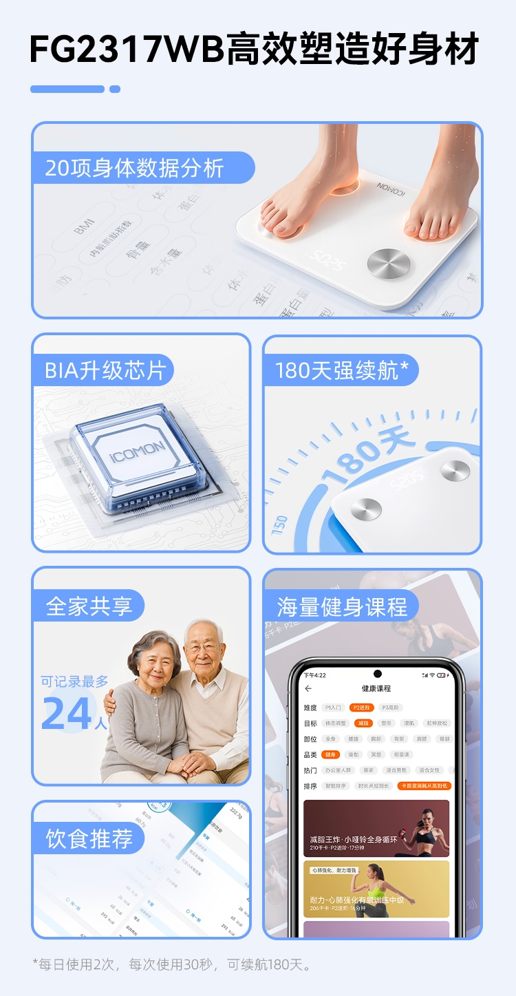 产品可测量20项人体成份:体重、BMI、体脂率、;支持24个用户管理,全家健康一步到位,称量结果智能;据测量结果提供科学的饮食摄入、饮水助手、科学减脂建