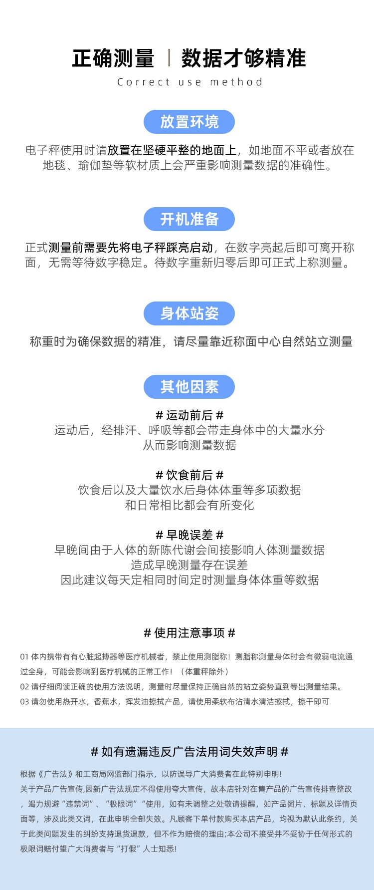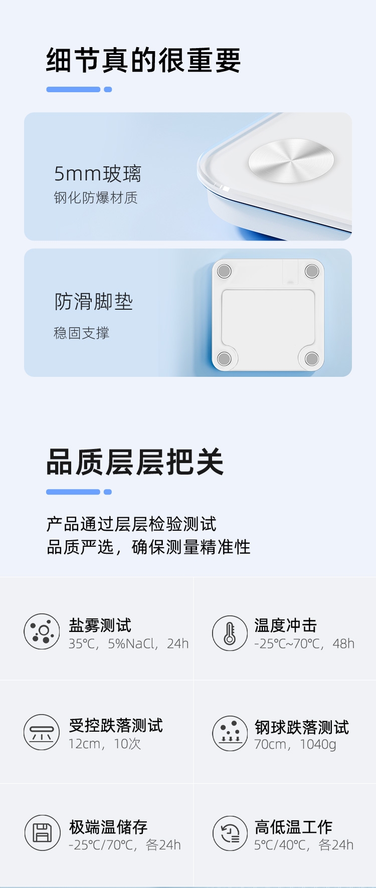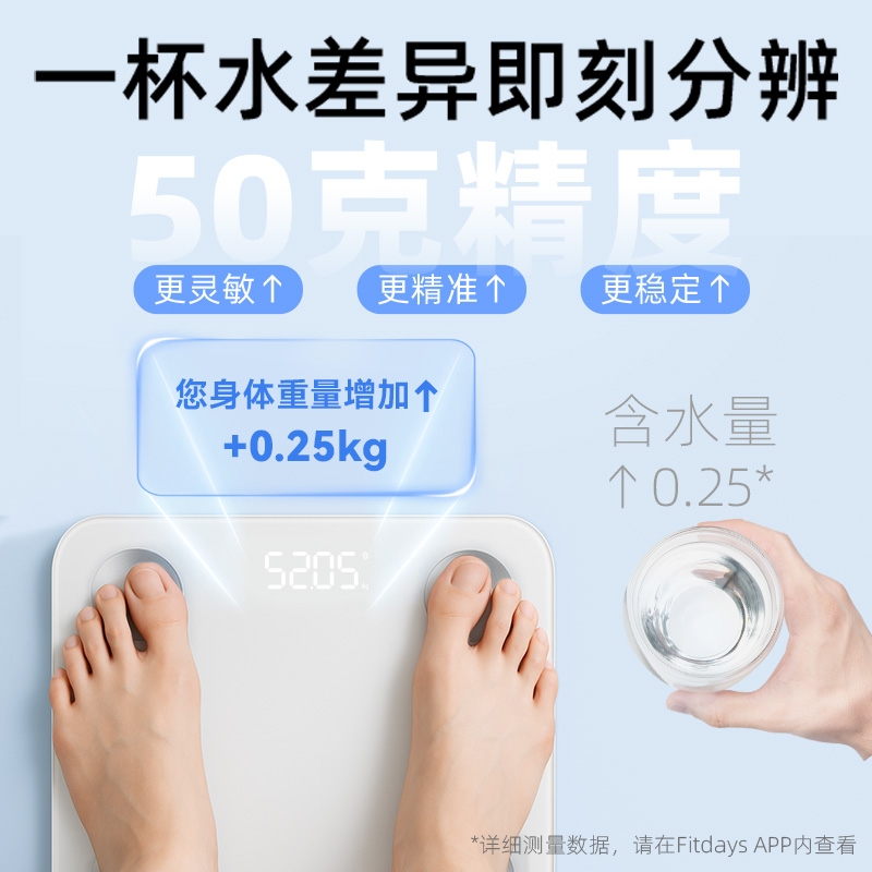 配置清单:材质:不锈钢电极+钢化玻璃+ABS 显示:LED 电源:2节7号电池 连接:蓝牙 测脂方案:直流 底部结构:半包底结构 产品尺寸:260*260*20mm 产品净重:1.1kg 称量范围:5-180kg ;分度值:100g 包装方式:彩盒