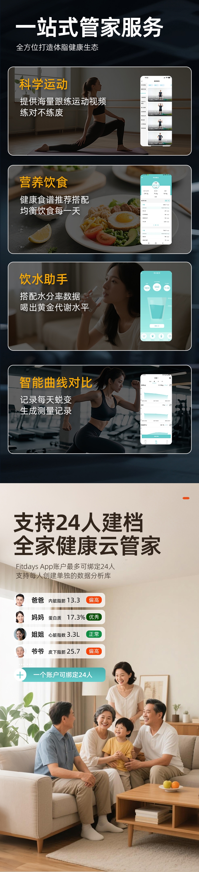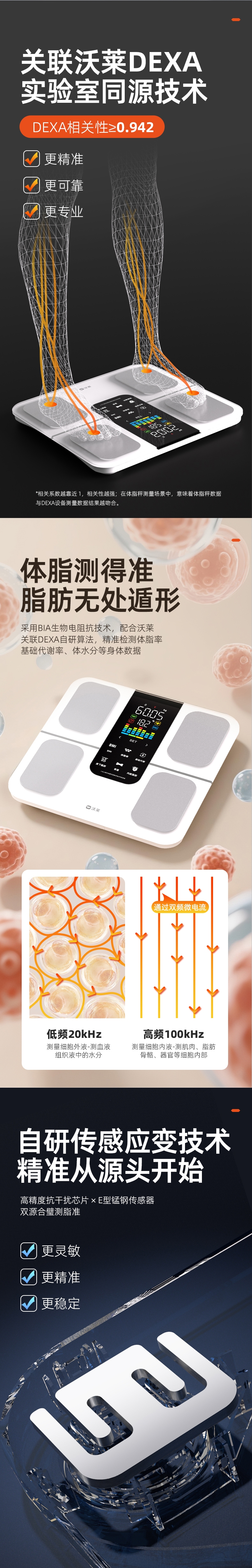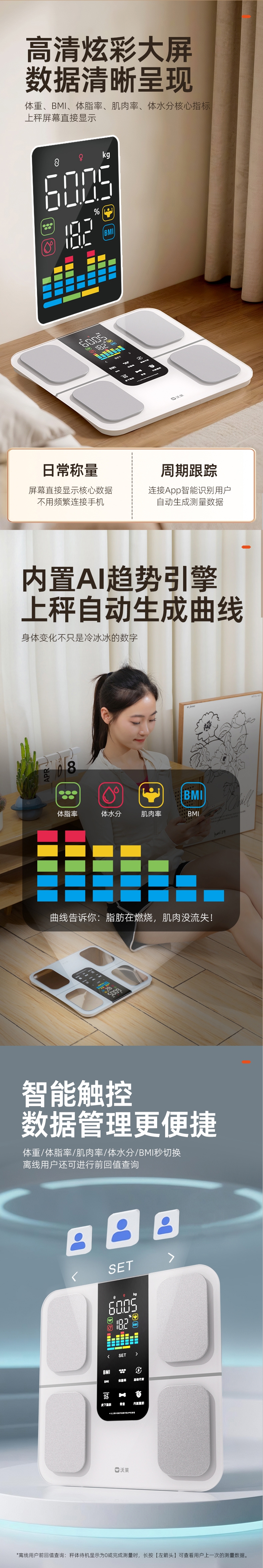产品可测量20项人体成份:体重、BMI、体脂率、;4.6寸车规级VA-LED彩屏显示,支持5项数据;支持24个用户管理,全家健康一步到位,称量结果智能