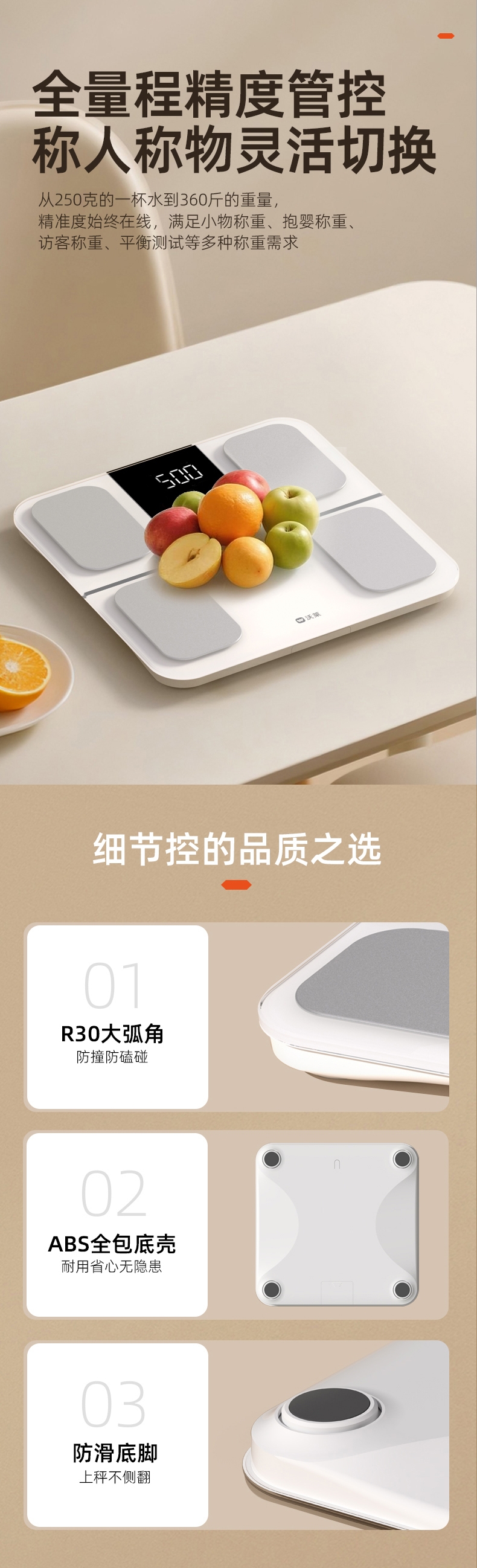 配置清单:材质:不锈钢电极+钢化玻璃+ABS 显示:4.6寸车规级VA-LED彩屏显示,支持5项数据(体重、体脂率、体水分、肌肉量、BMI)及趋势曲线直接显示 底部结构:全包底结构 电源:3节7号电池 连接:蓝牙 产品尺寸:278*278*23mm; 产品净重:1.5kg 称量范围:0.25-180kg ;分度值:50g 包装方式:牛卡盒