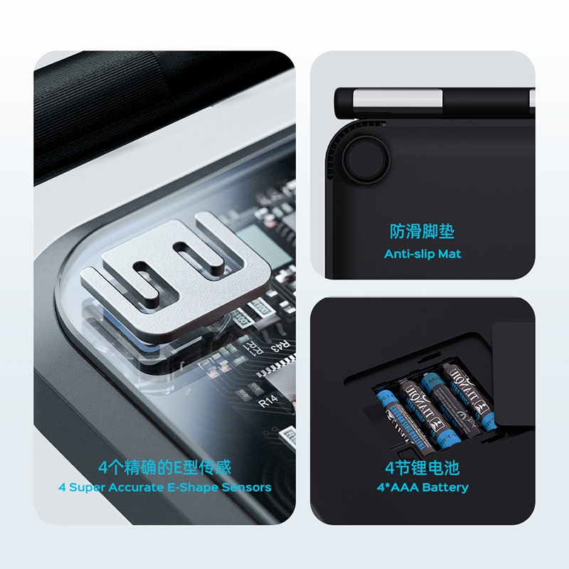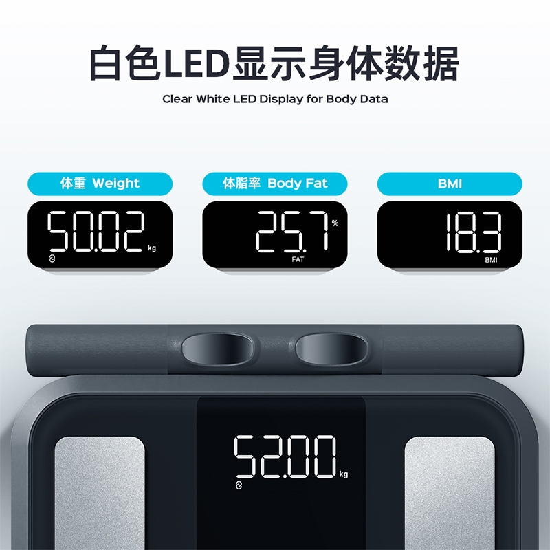 配置清单:材质:高强度钢化玻璃+不锈钢电极片+ABS 底部结构:全包底结构 显示:LED 电源:4节7号电池 通讯方案:蓝牙5.0 测脂方案:交流 产品尺寸:333*305*33.5mm 产品净重:2kg 称量范围:5-180kg ; 分度值:50g 包装方式:彩盒+珍珠棉(内保护)