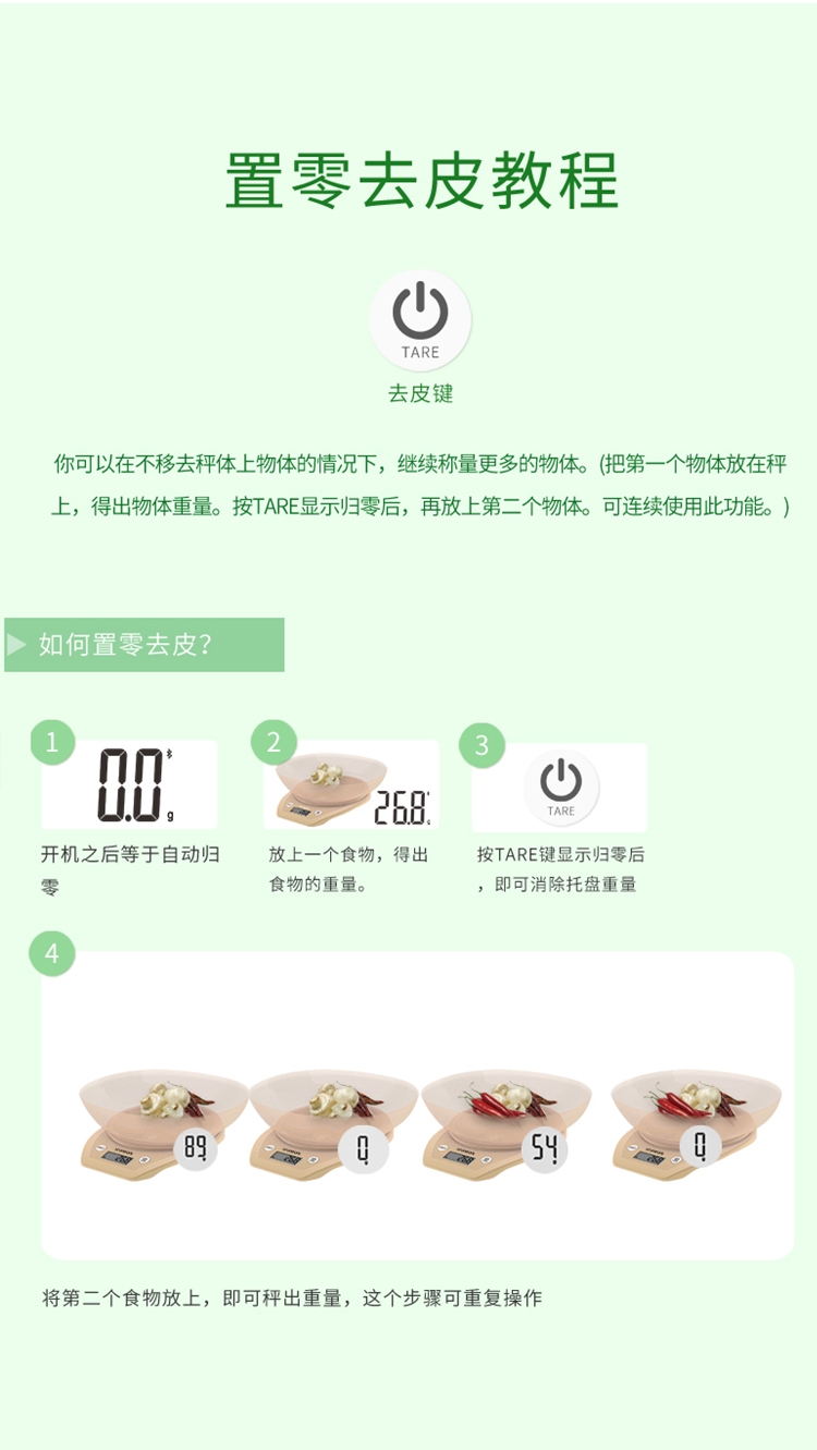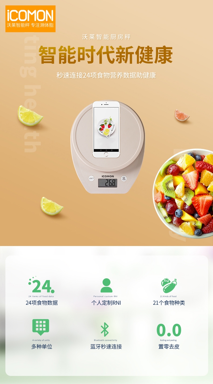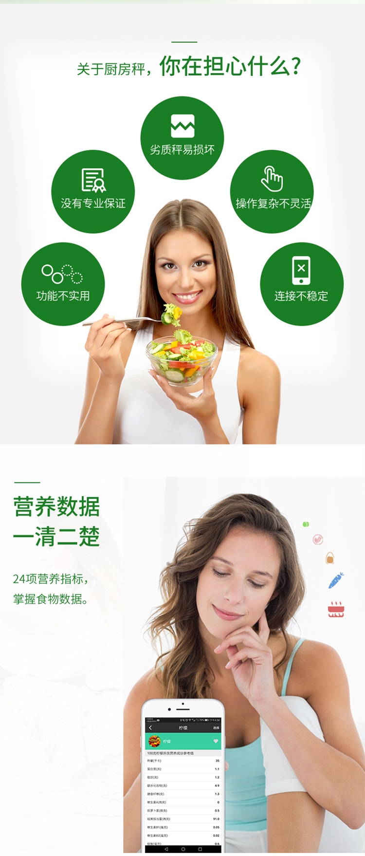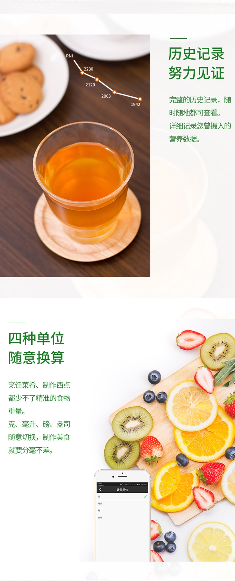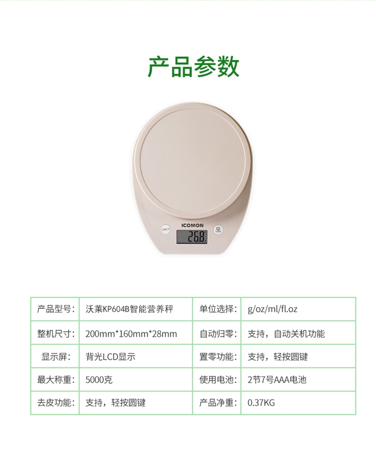 大容积配套秤盘,便捷随心称;一键去皮、解决繁琐困扰;从用户体验出发,APP精简交互设计:选择食物,