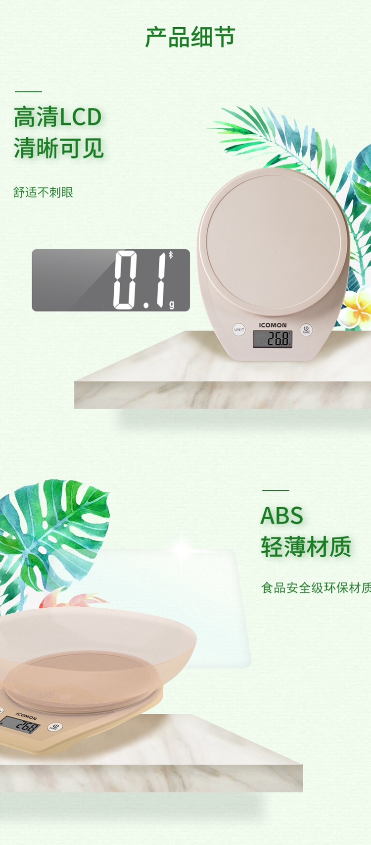 配置清单:材质:环保食品级材料载物盘+ABS 显示:LCD 电源:2*AAA 连接方式:蓝牙 产品尺寸:200*160*28mm 产品净重:0.4kg 称量:1g-5kg ; 分度值:1g 包装方式:彩盒包装