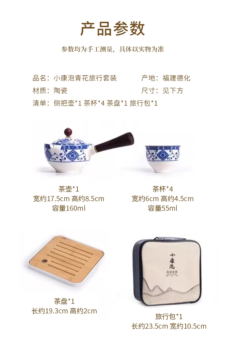配置清单:茶壶*1 茶杯*4 茶盘*1 旅行包*1