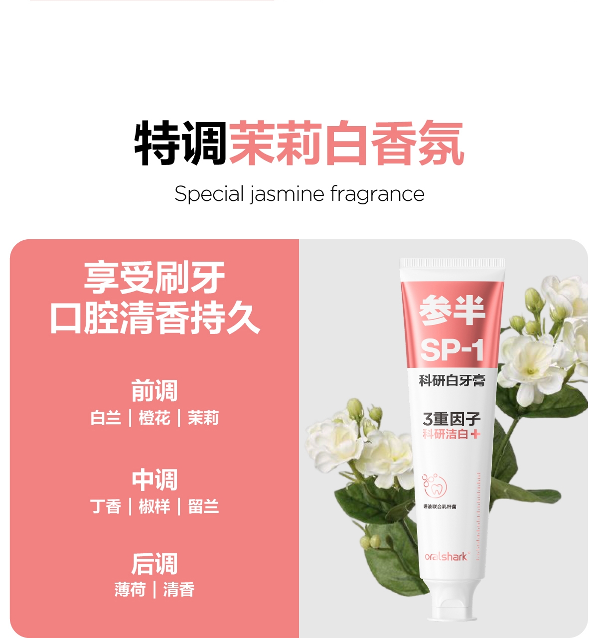 配置清单:参半oralshark高山茉莉味科研白牙膏--180g*2支 参半30支装袋装牙线 参半C11牙刷*2支