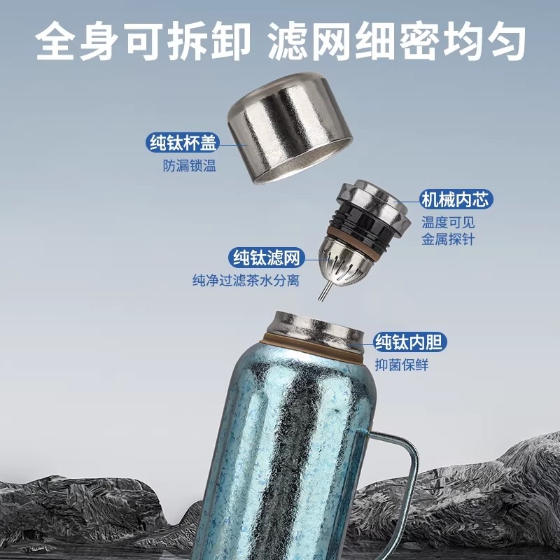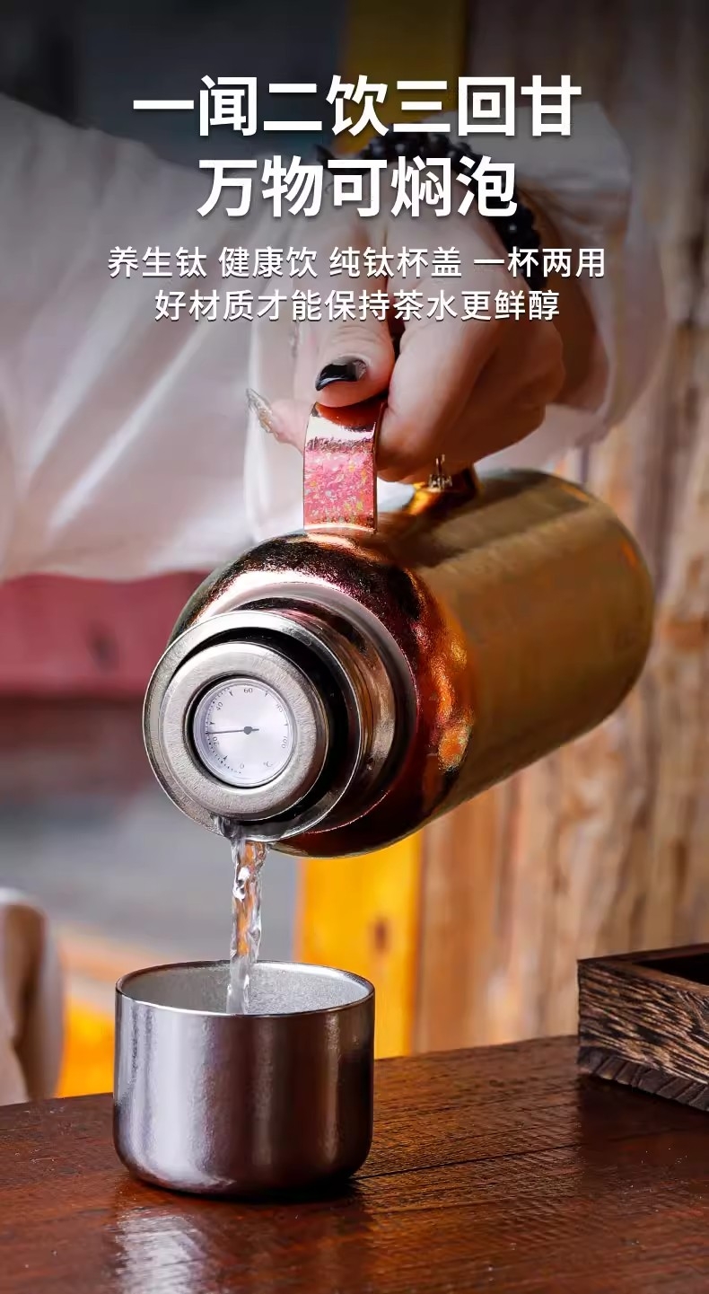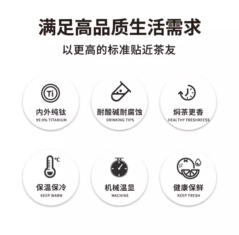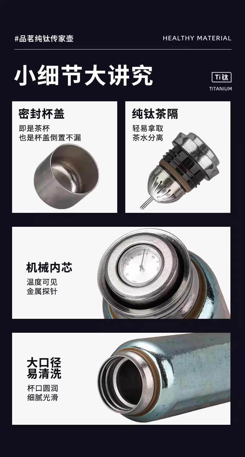 纯钛鲜泡入口皆是茶香,机械温显保温保鲜,可焖可泡;内外双层纯钛,高真空隔热无尾抽真空技术48小时持久;内置纯钛茶隔 全身可拆卸滤网细密均匀;健康养生方式高端纯钛内胆 「长效保鲜抑菌」;机械指针测温设计机械内芯,每一刻的温度实时显现