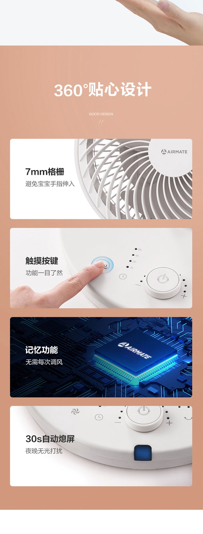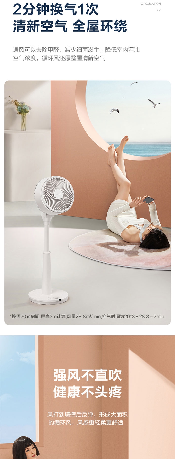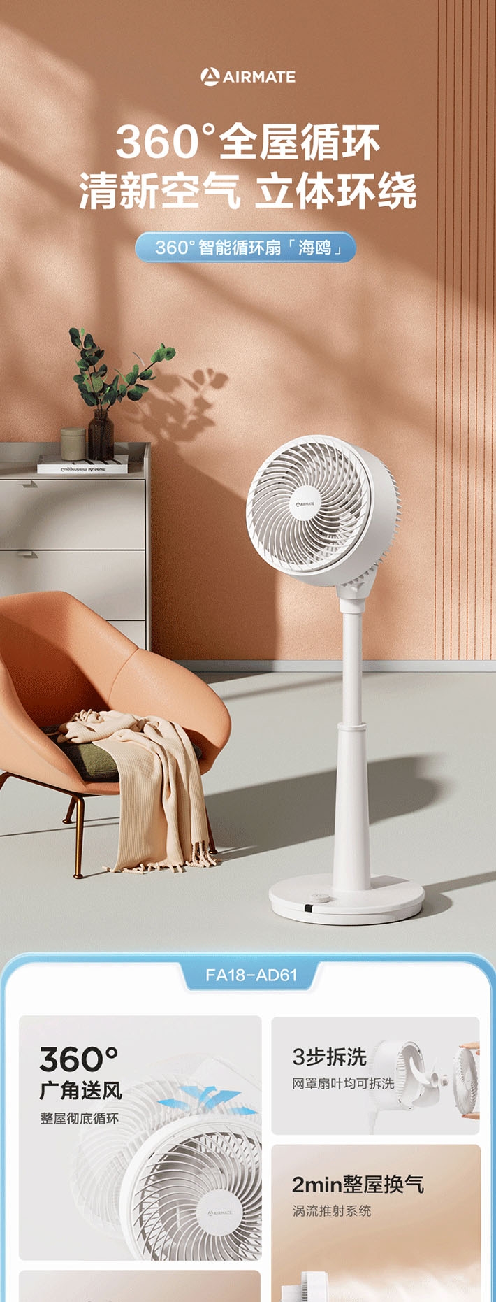 360°广角送风 整屋彻底循环;2min整屋换气 AS涡流推射系统;3步拆洗网罩扇叶均可拆洗