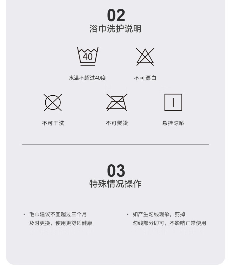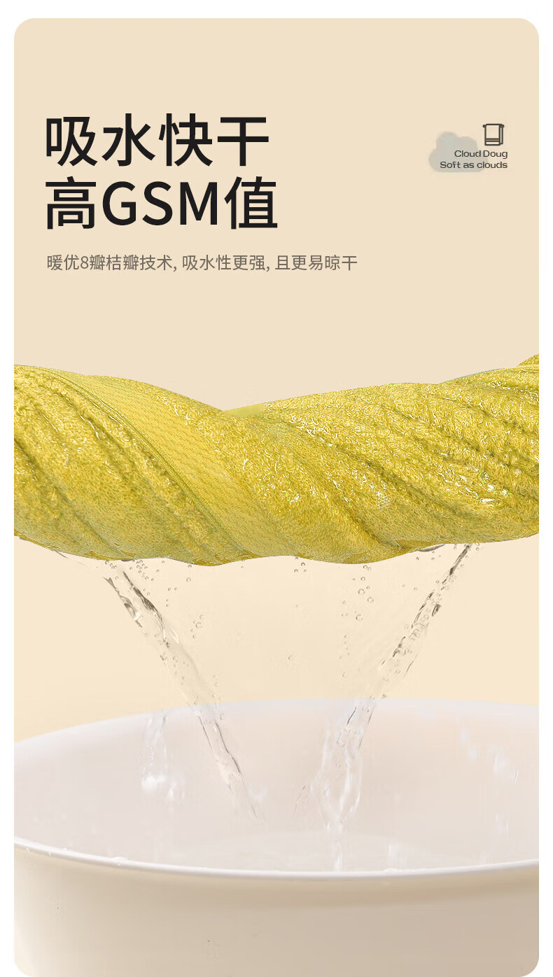 不易掉毛精梳工艺;吸水快干高GSM值;柔软细腻亲肤蓬松