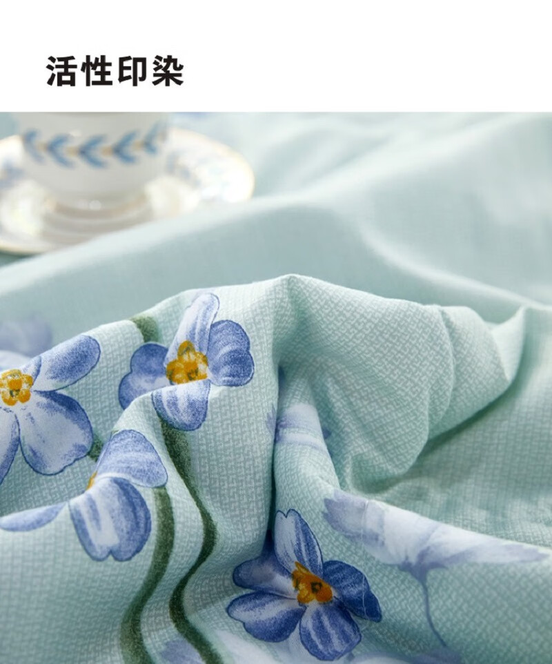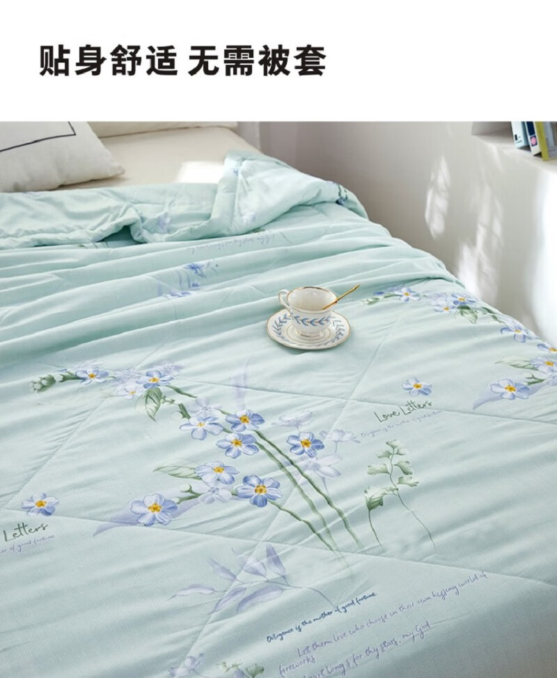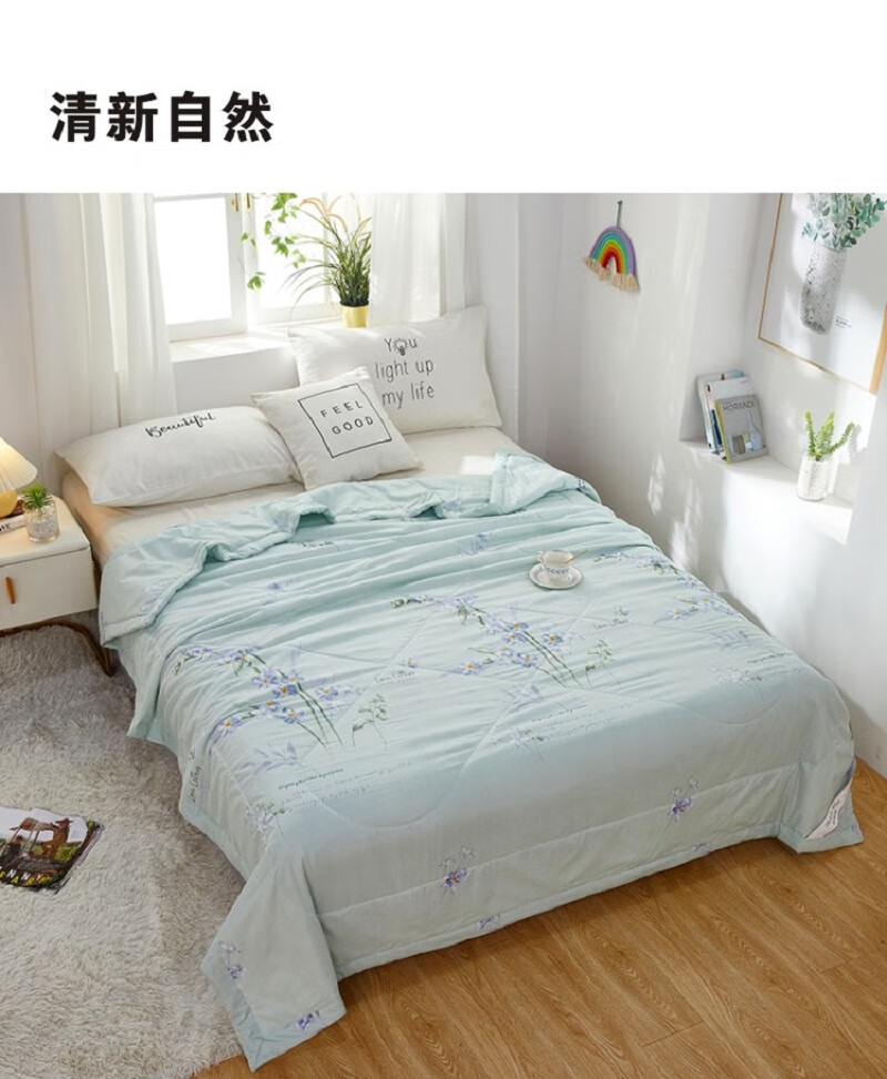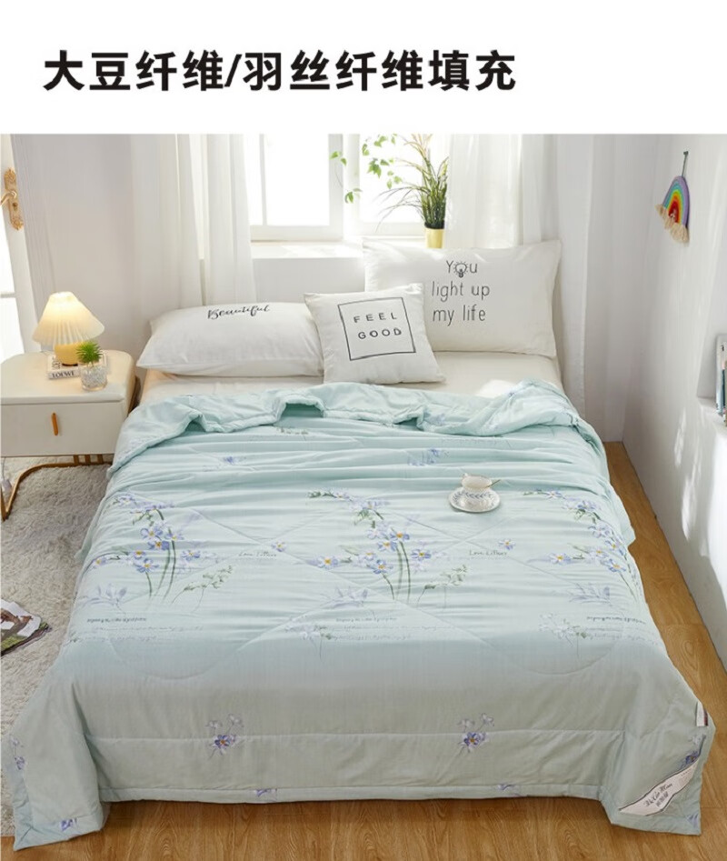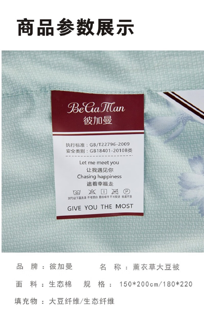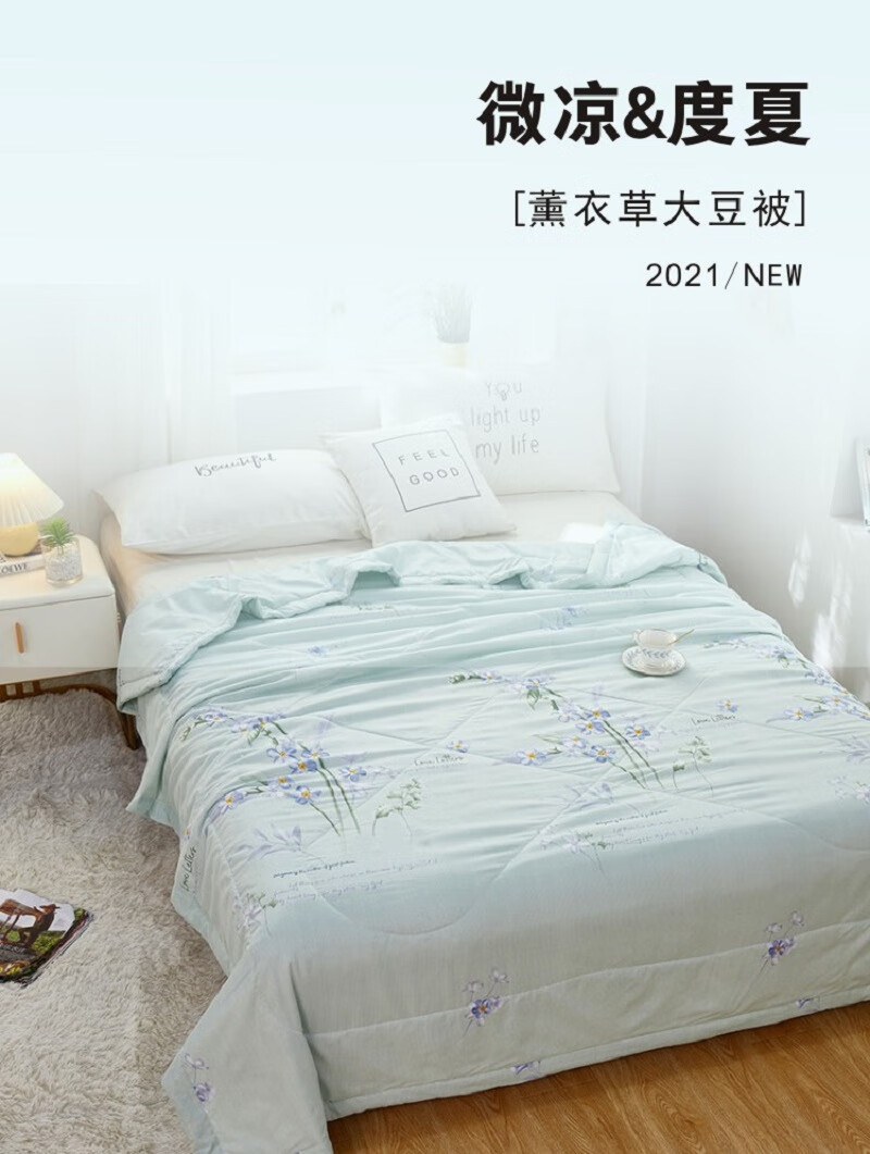 此款被子采用活性印染工艺,配以薰衣草大版花卉风格;美丽大方,清新怡人!大豆纤维填充,;更加环保健康、更加透气舒适,呵护睡眠!