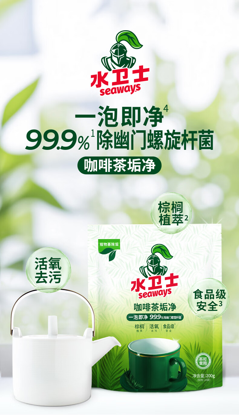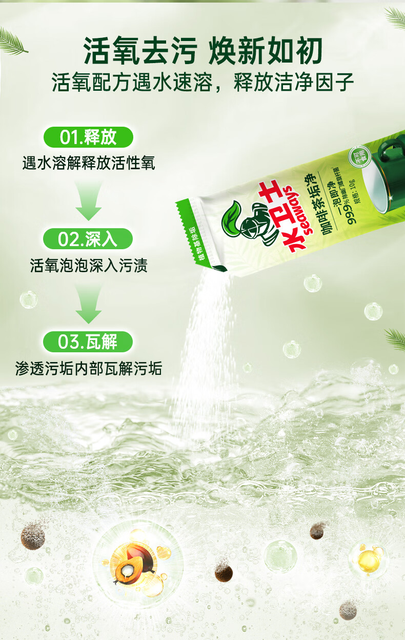 一泡即净 99.9%除幽门螺旋杆菌;活氧去污。活氧配方,遇水速溶,释放洁净因子高效去渍;一泡即净。小苏打洁净成分,快速分解污垢,无需费力洗