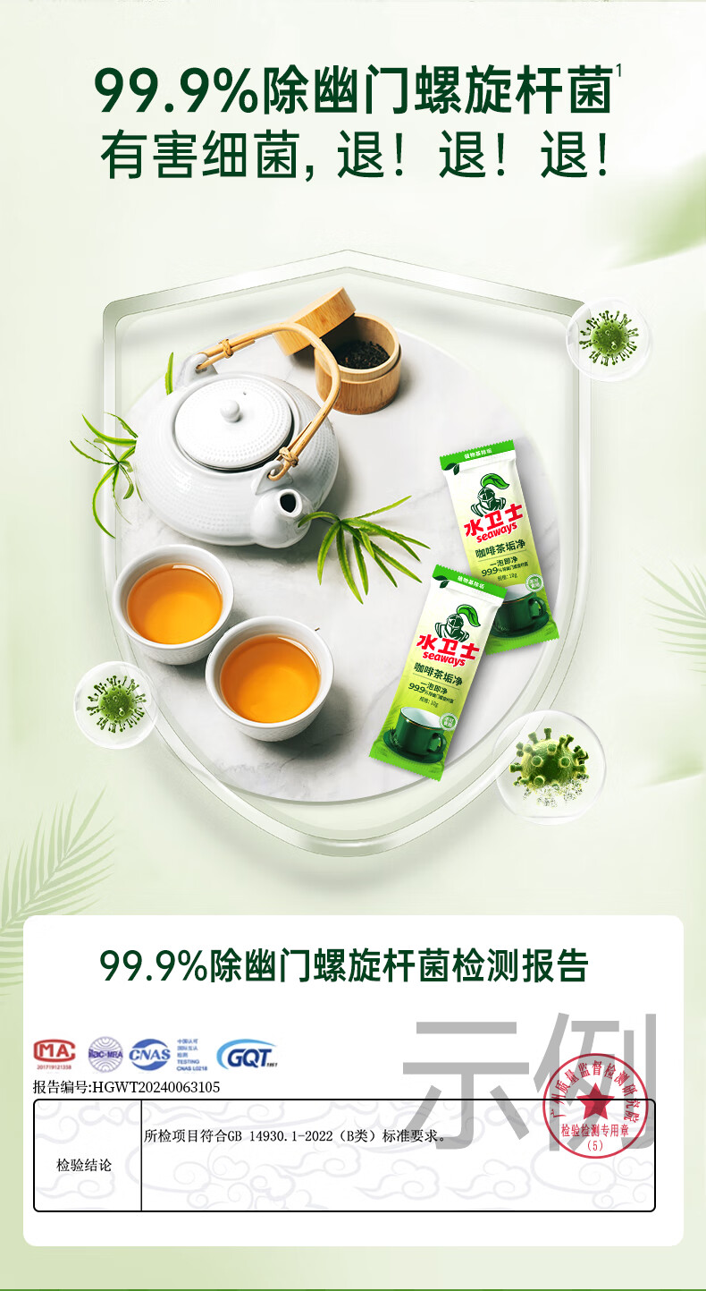 产品功效:一泡即净 99.9%除幽门螺旋杆菌
