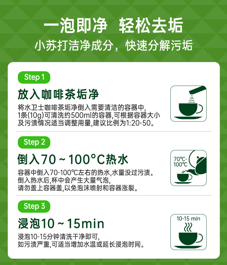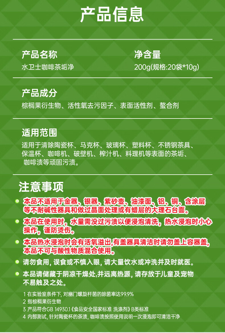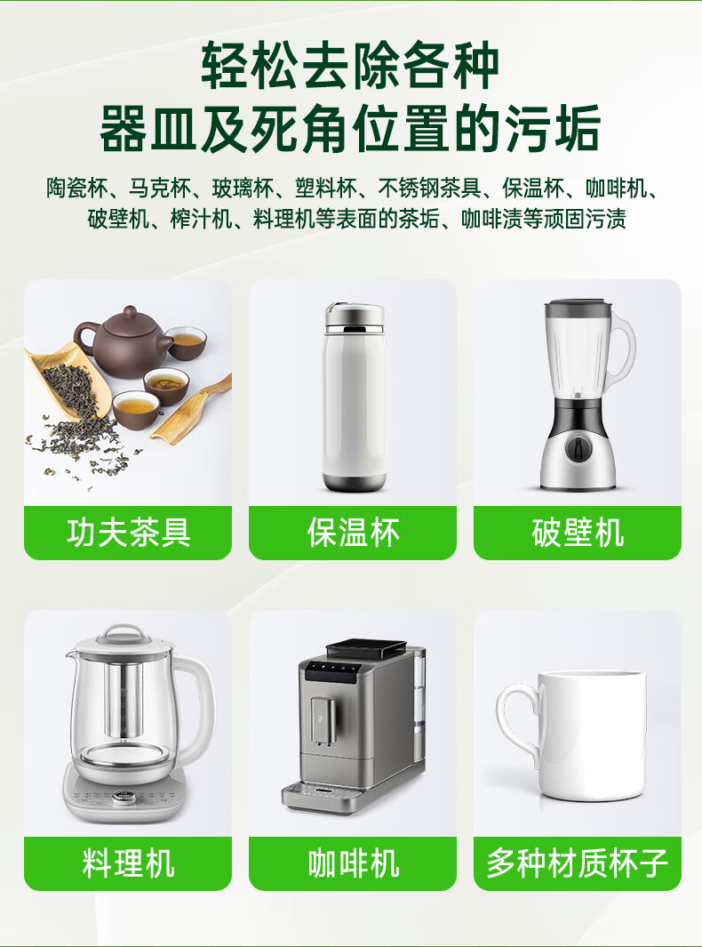 适用范围:适用于清除陶瓷杯、马克杯、玻璃杯、塑料杯、不锈钢茶具、保温杯、咖啡机、破壁机、榨汁机、料理机等表面的茶垢、咖啡渍等顽固污渍。