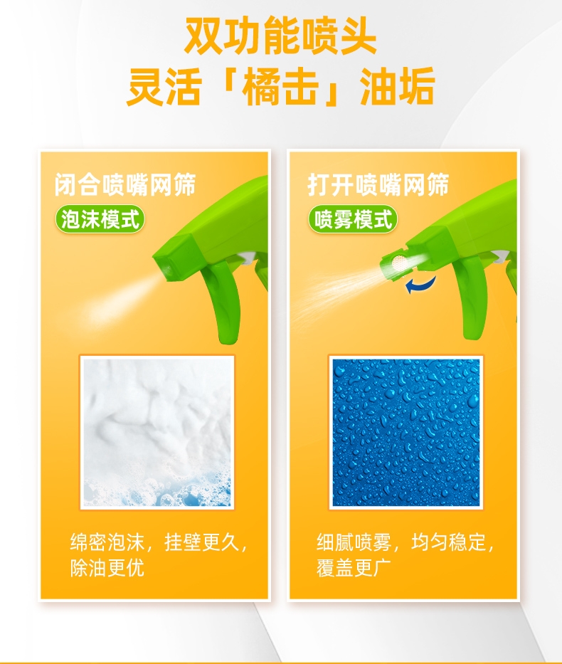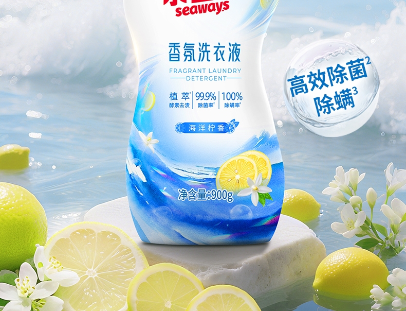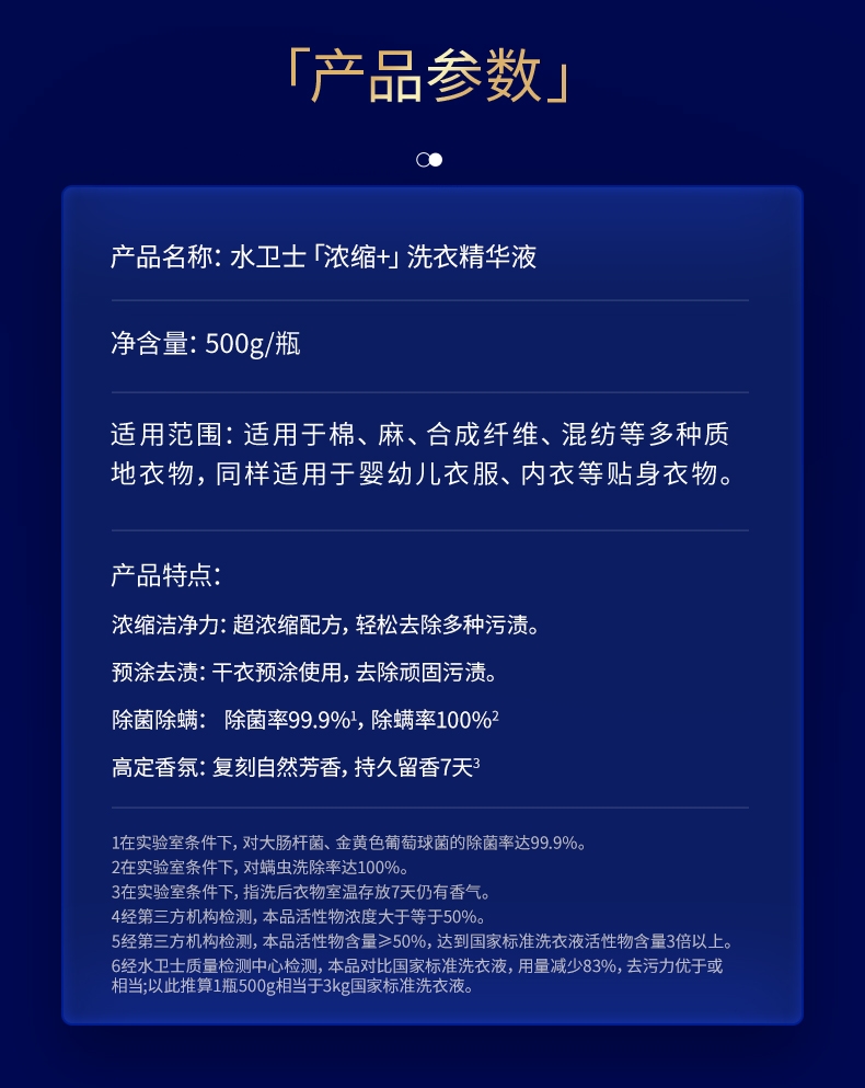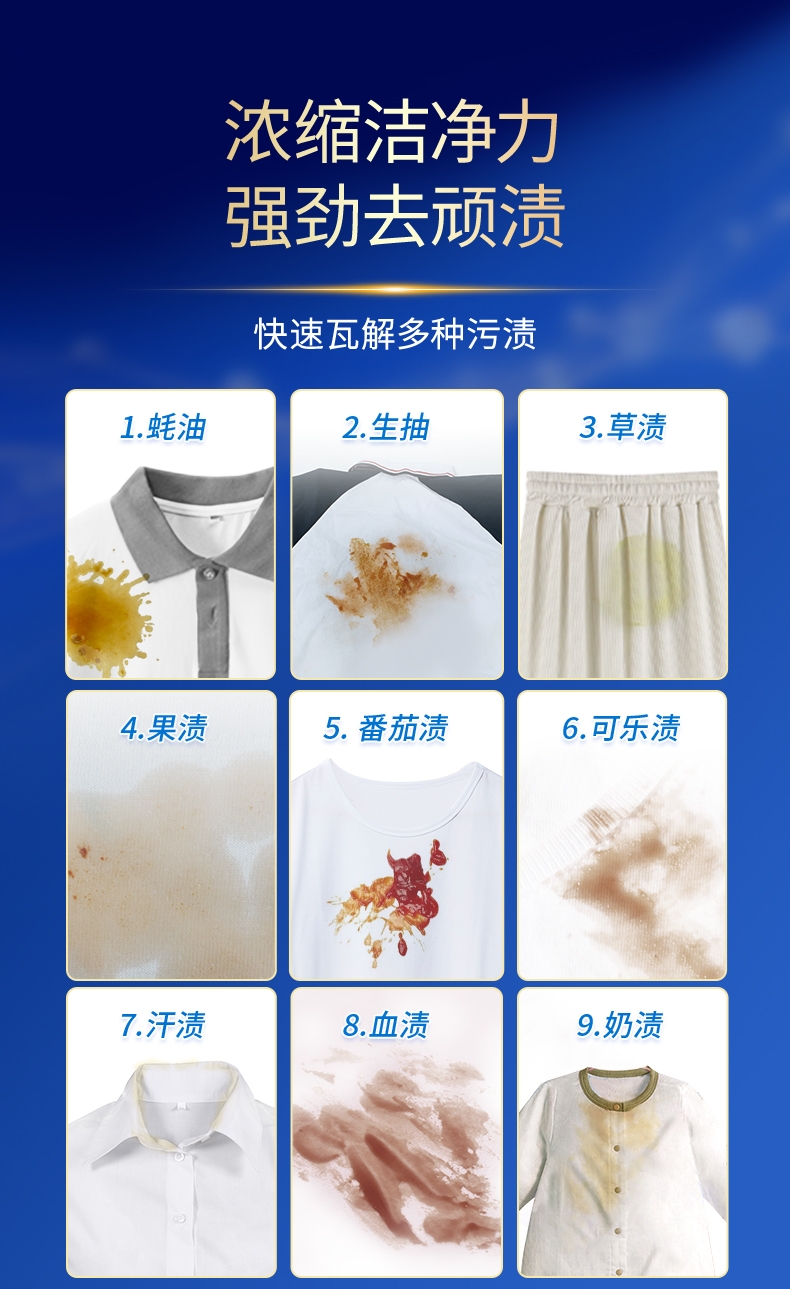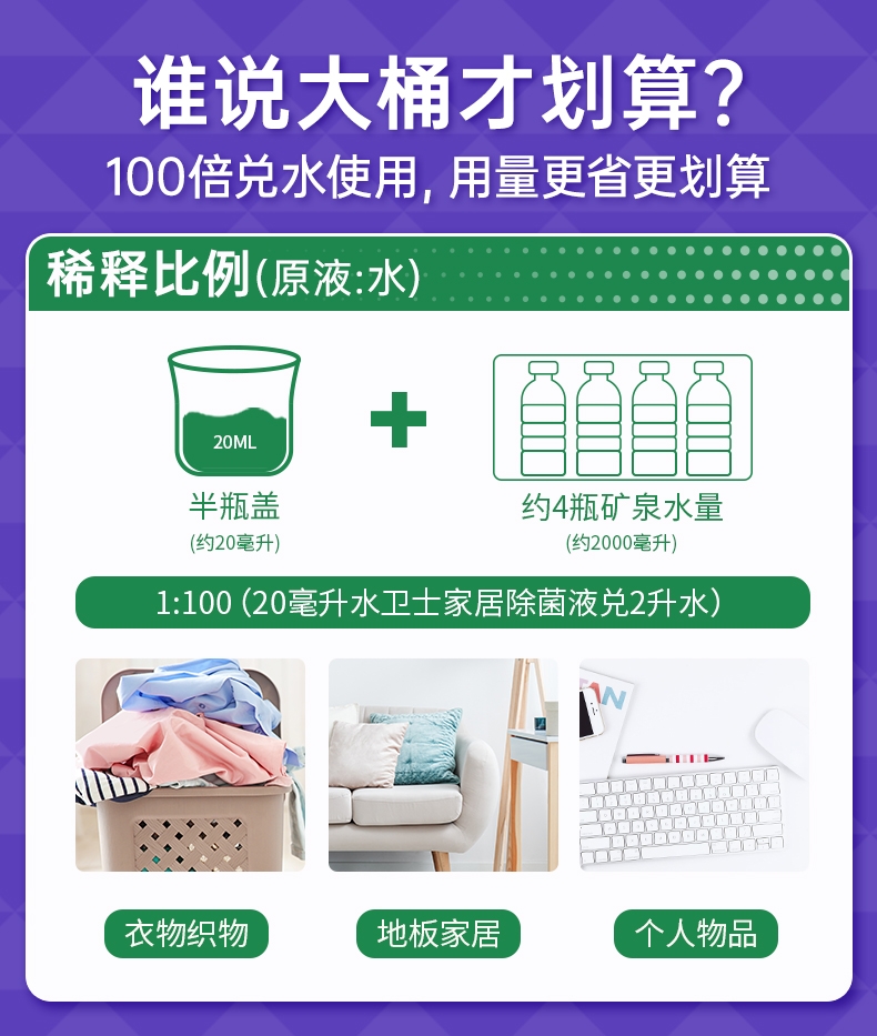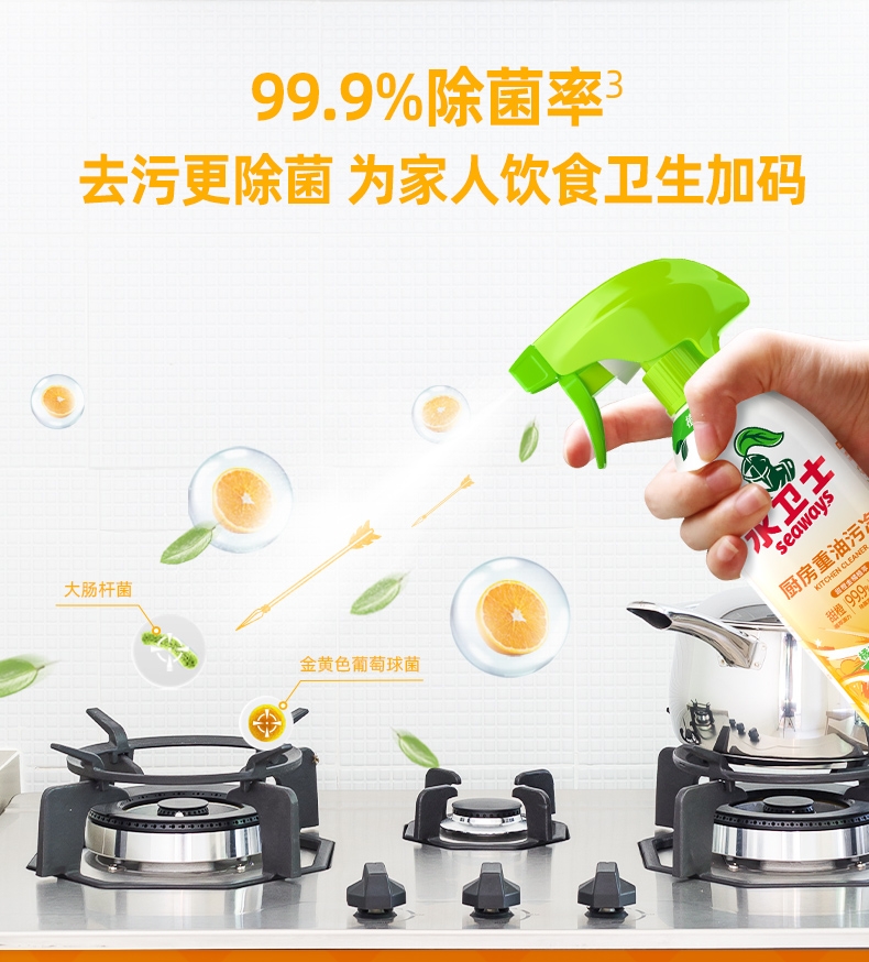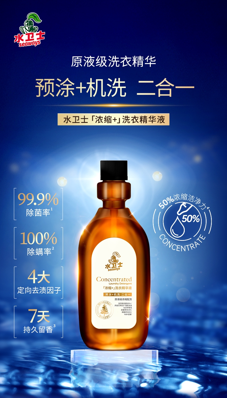 100倍兑水,天然植萃高效除菌,除菌率99.9%;浓缩洗衣精华液:浓缩洁净力,高定香氛,持久留香7天;厨房重油污:1分钟强劲快速溶解