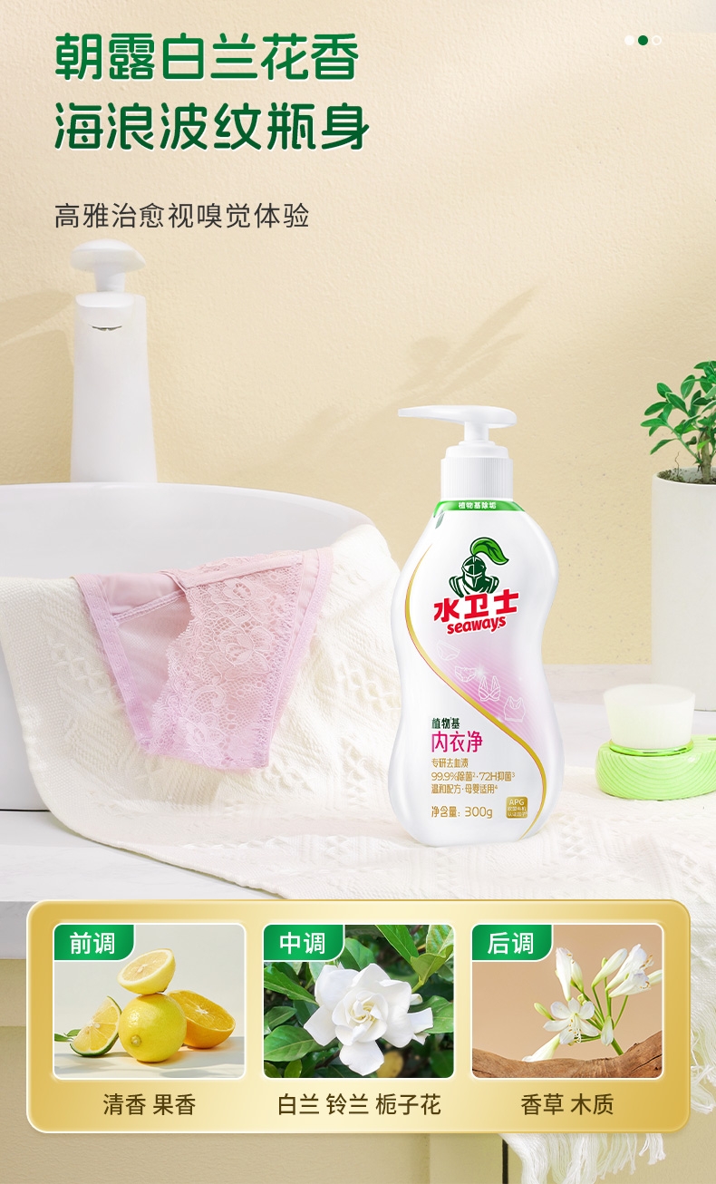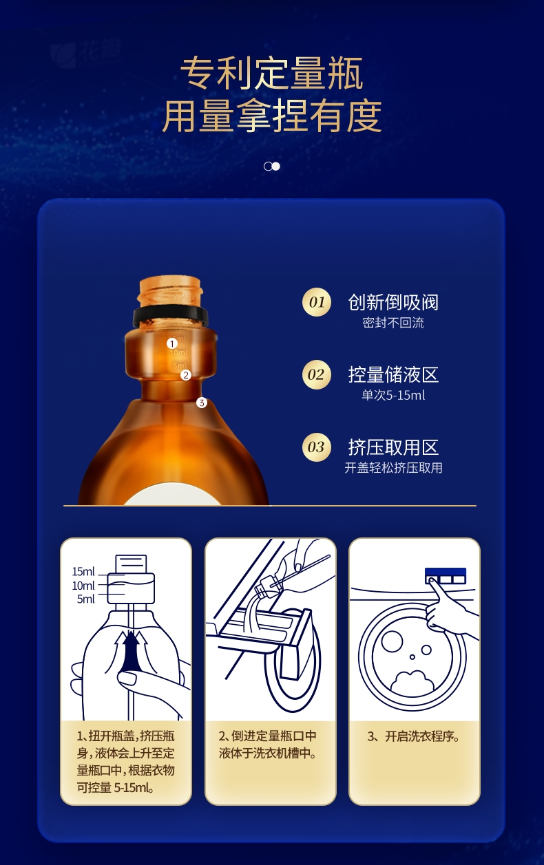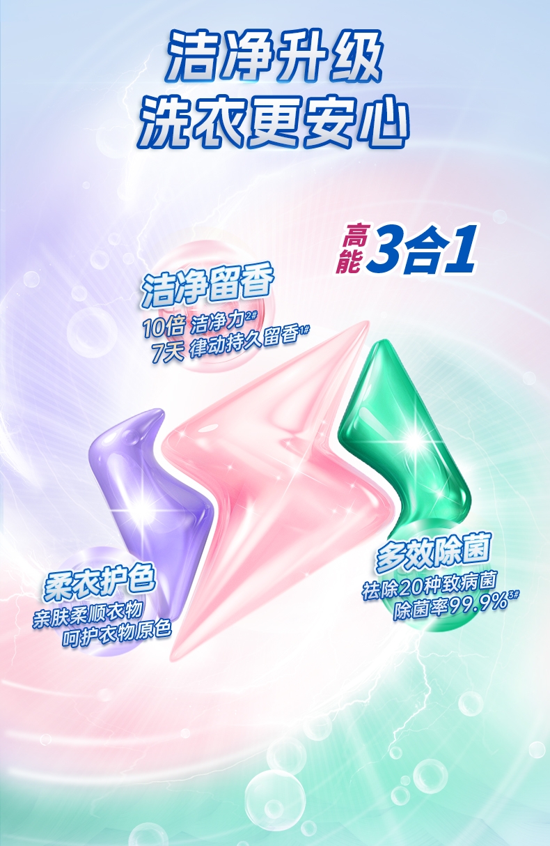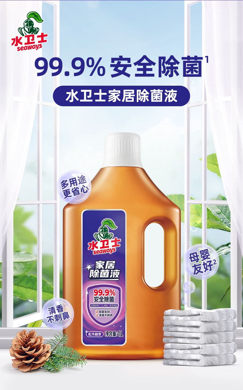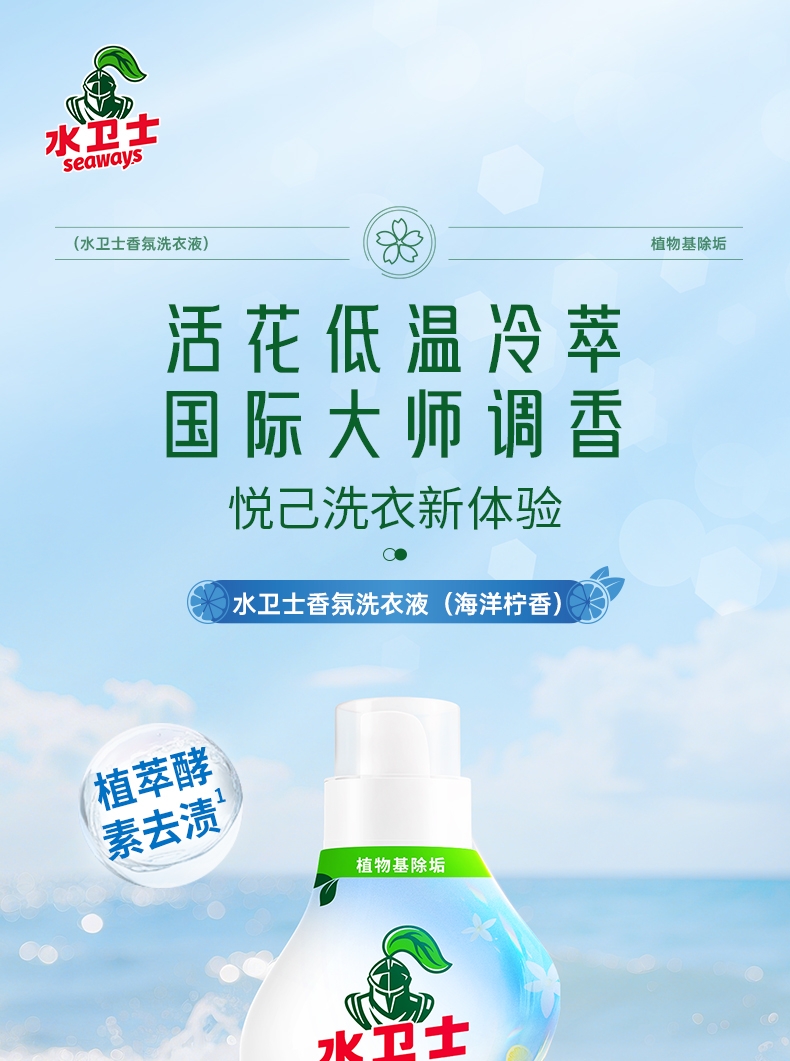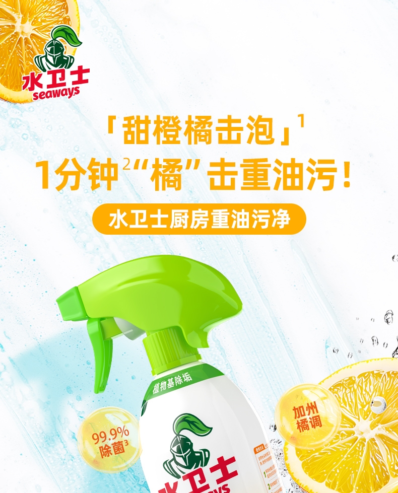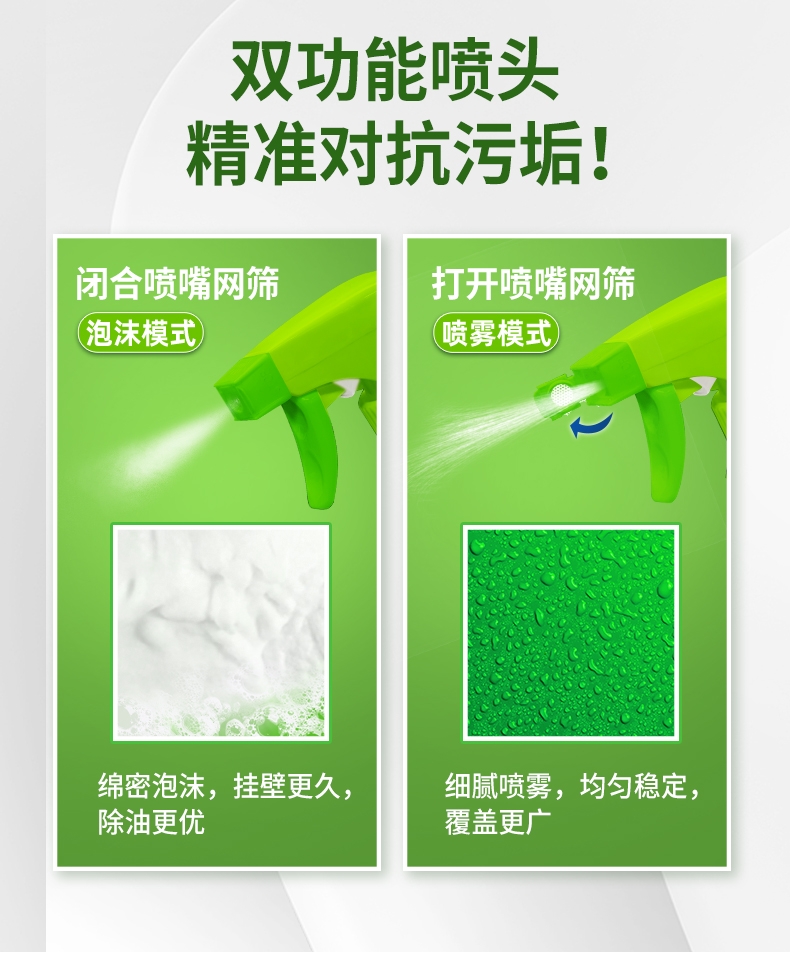100倍兑水,天然植萃高效除菌,除菌率99.9%;浓缩洗衣精华液:浓缩洁净力,高定香氛,持久留香7天;厨房重油污:1分钟强劲快速溶解