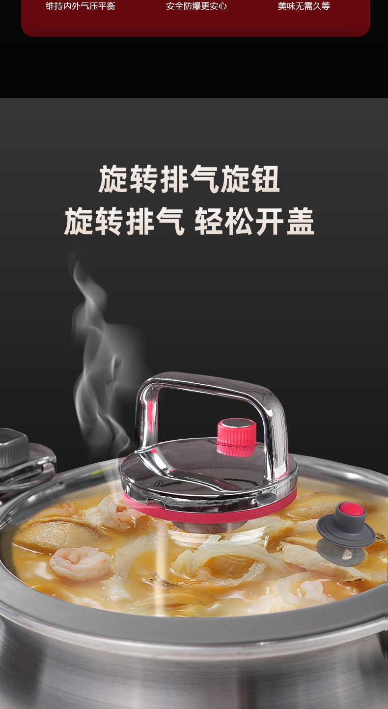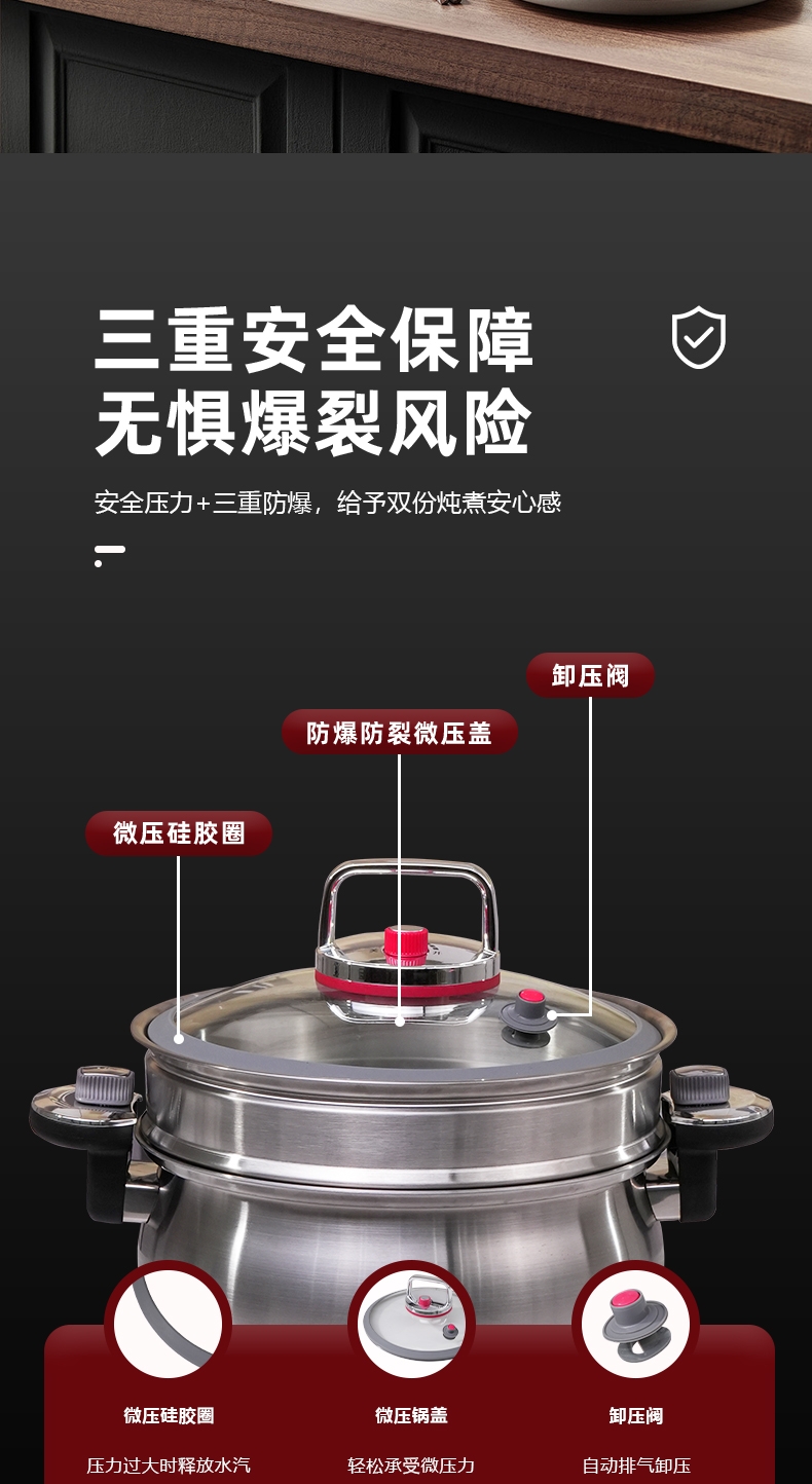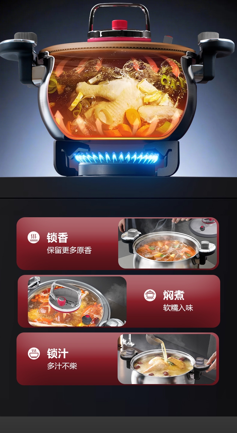 安全微压|省时炖煮|随时开盖;实现微压环境,锁住食材原香;;锅内形成内循环,出汤自然更浓郁