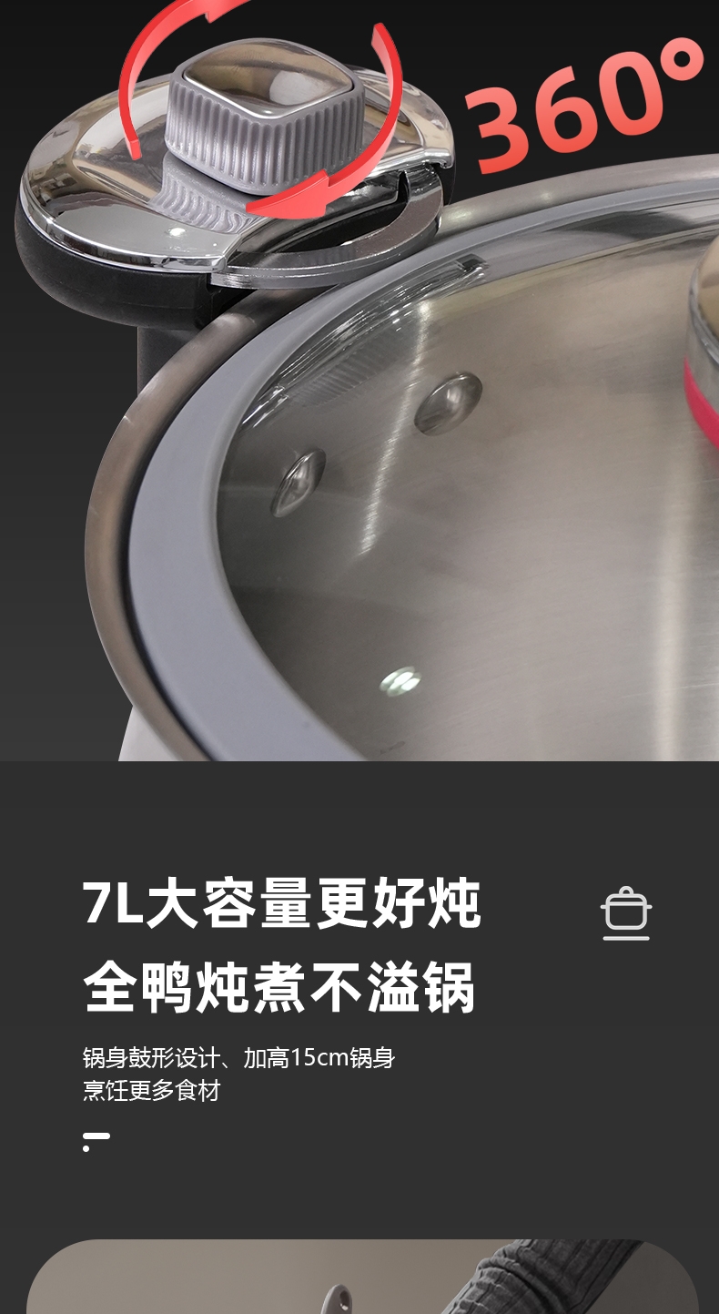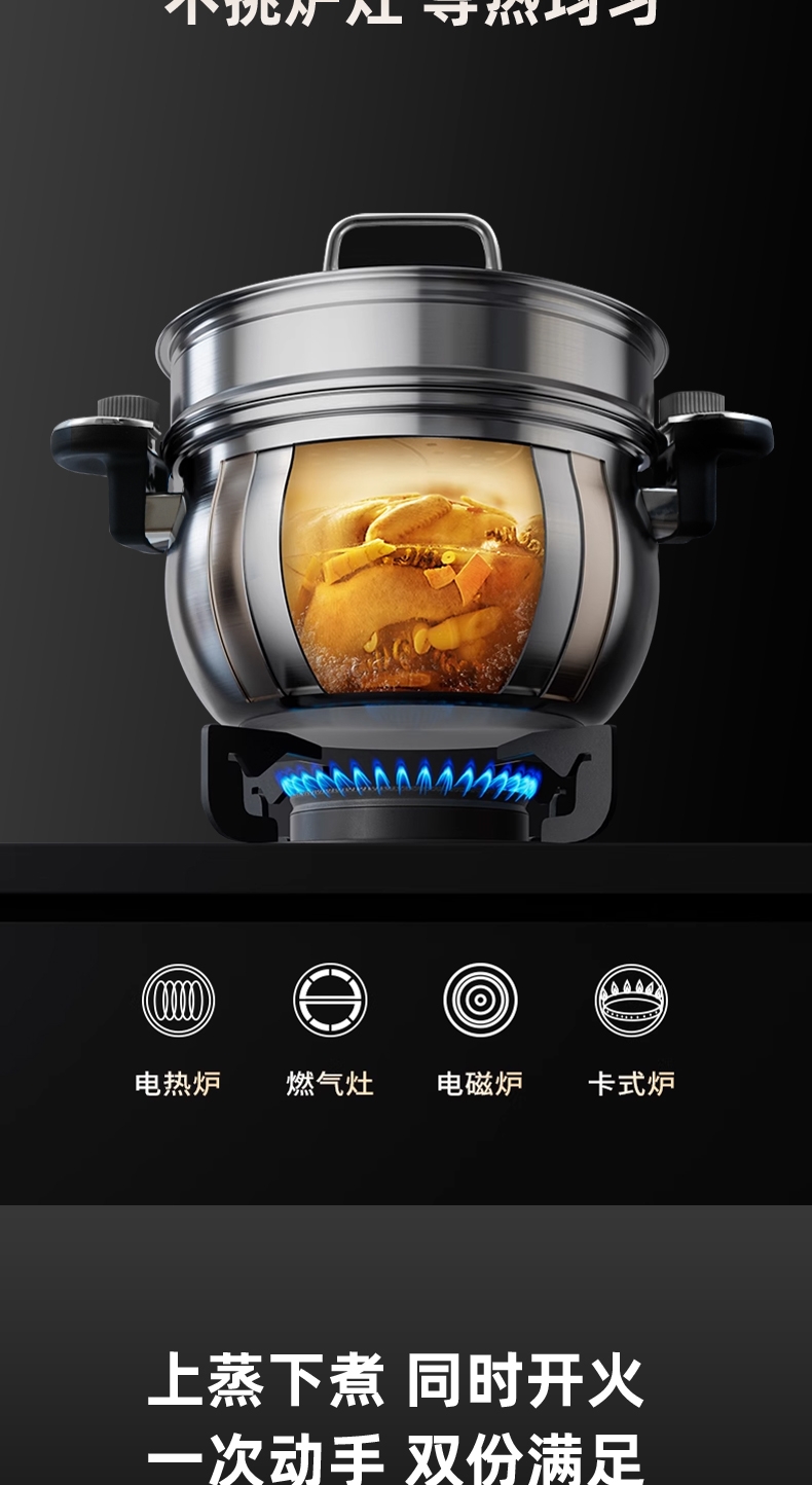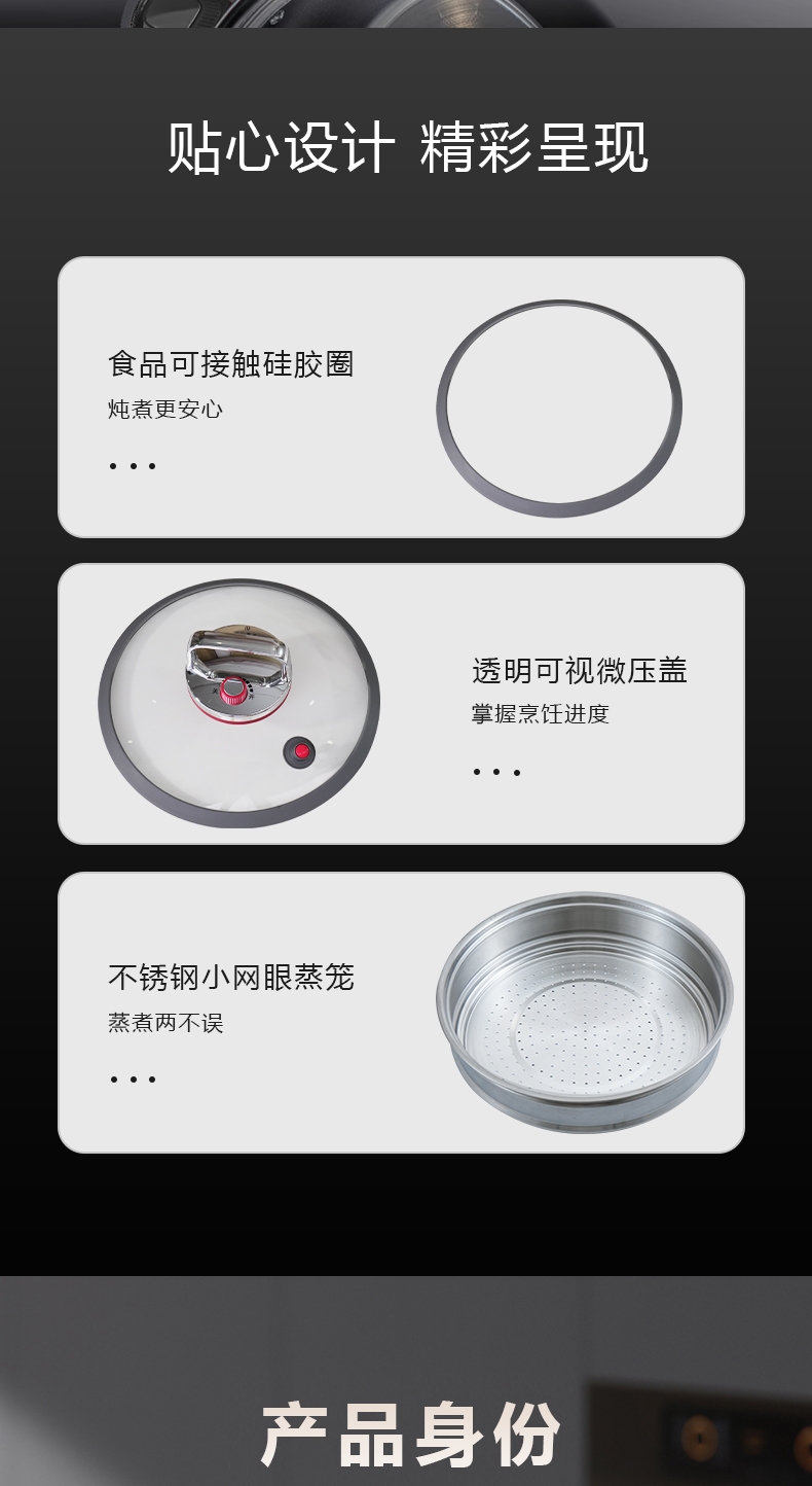 安全微压|省时炖煮|随时开盖;实现微压环境,锁住食材原香;;锅内形成内循环,出汤自然更浓郁