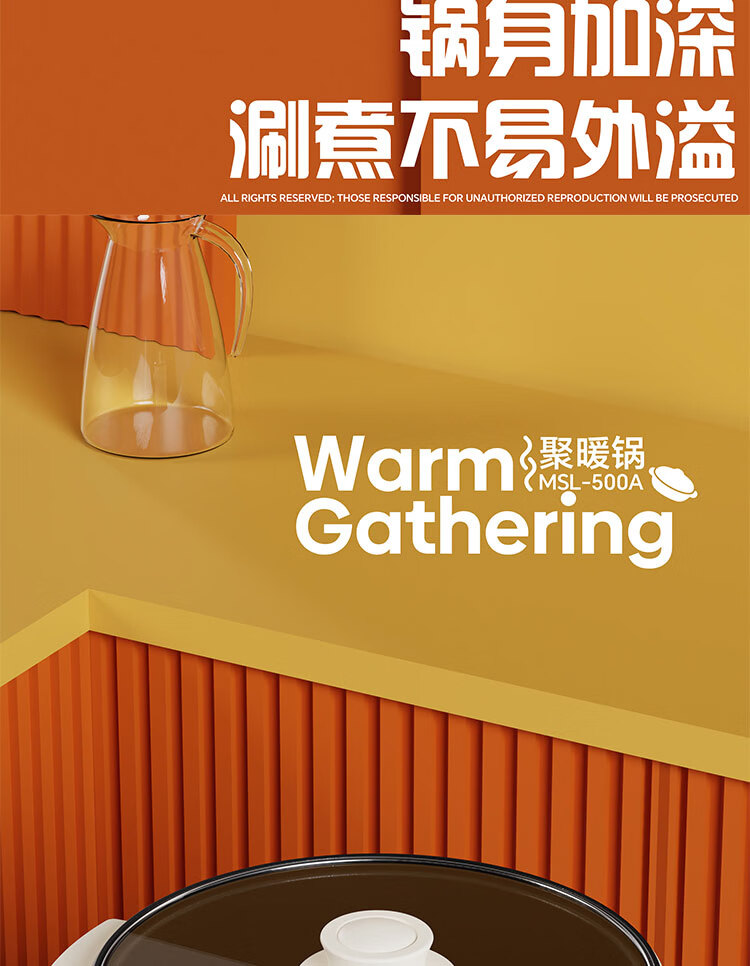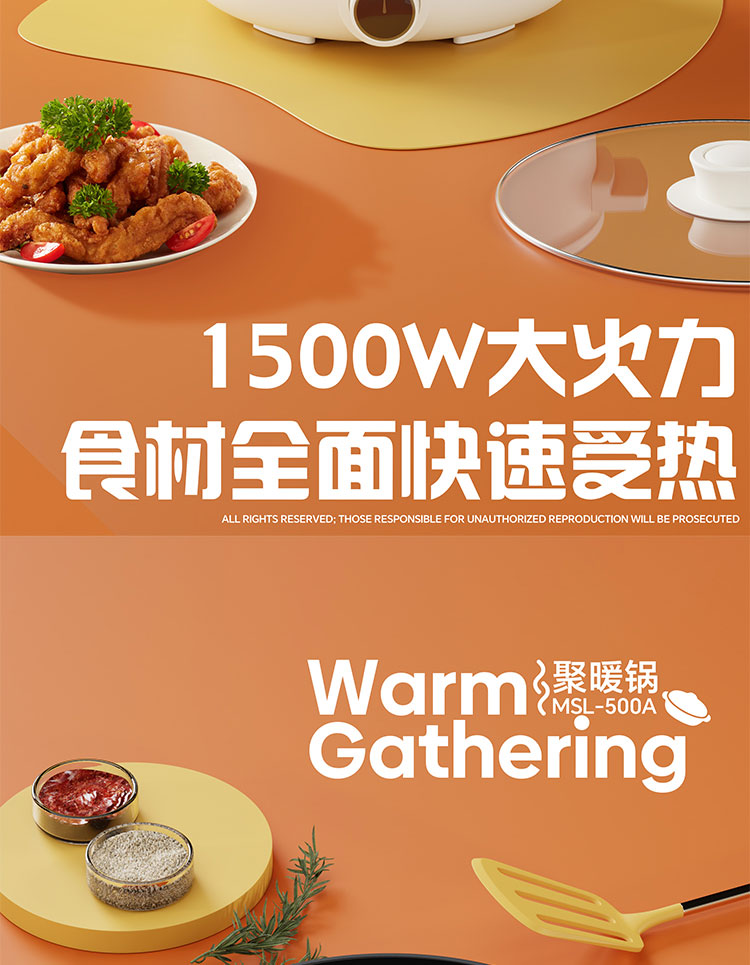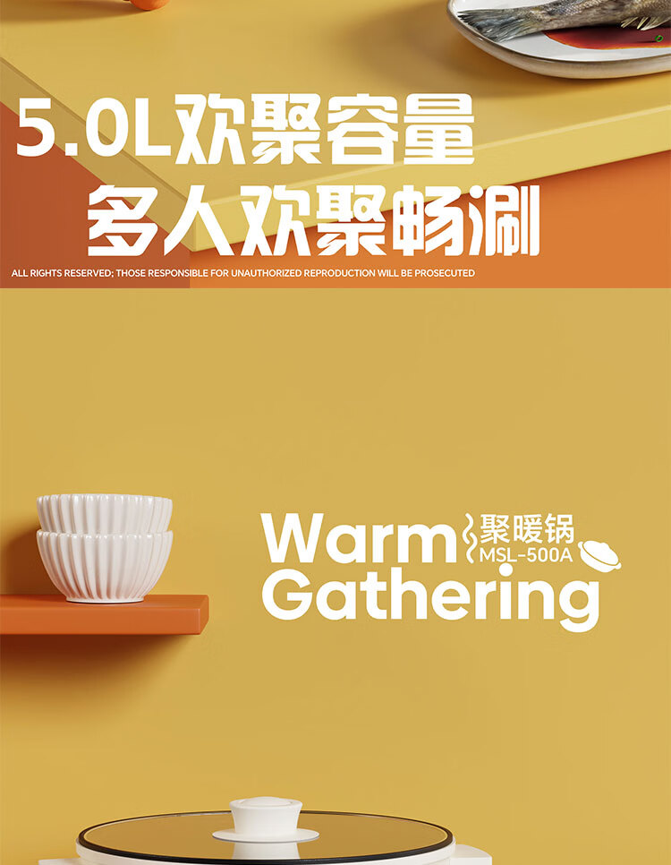 聚暖锅 一体式电火锅;500W 大功率带来强劲火力,升温迅速且受热均匀,;精准适配涮、煮、焖、煎、炒、炸多样需求。5.0L