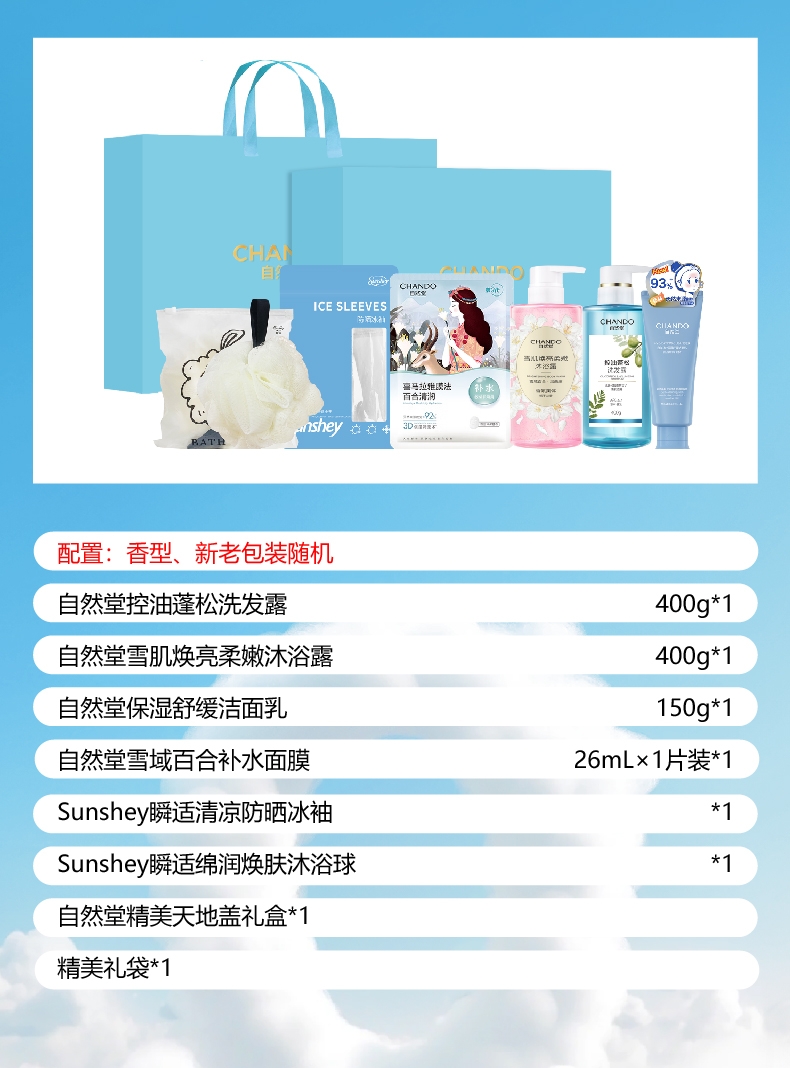 配置清单:自然堂控油蓬松洗发露400g*1 自然堂雪肌焕亮柔嫩沐浴露400g*1 自然堂保湿舒缓洁面乳150g*1 自然堂雪域百合补水面膜26mL×1片装*1 Sunshey瞬适清凉防晒冰袖*1 Sunshey瞬适绵润焕肤沐浴球*1 自然堂精美天地盖礼盒*1 精美礼袋*1