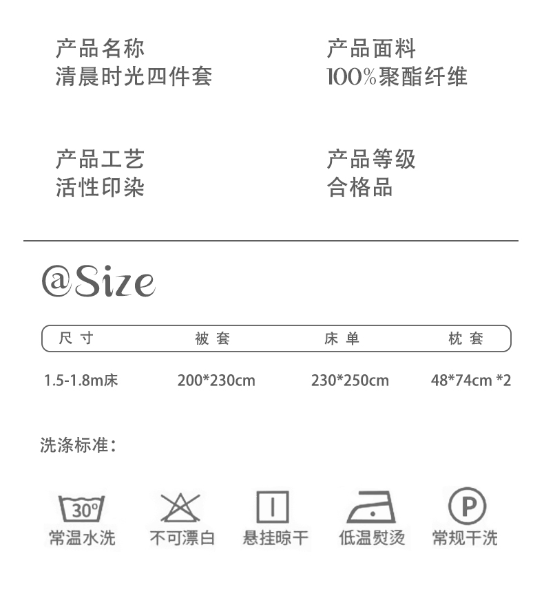 规格:被套200*230cm床单230*250cm 枕套48*74cm*2只