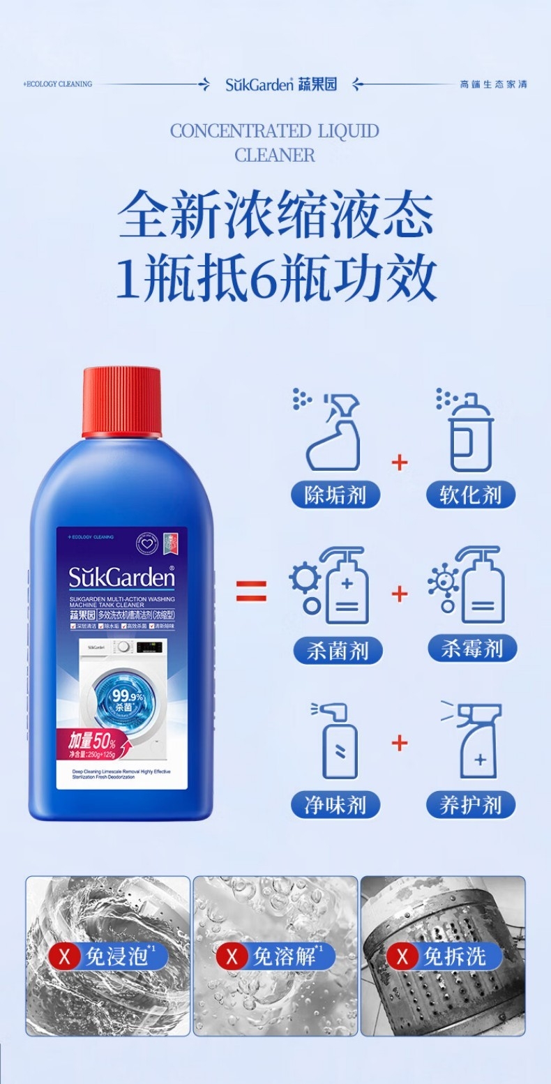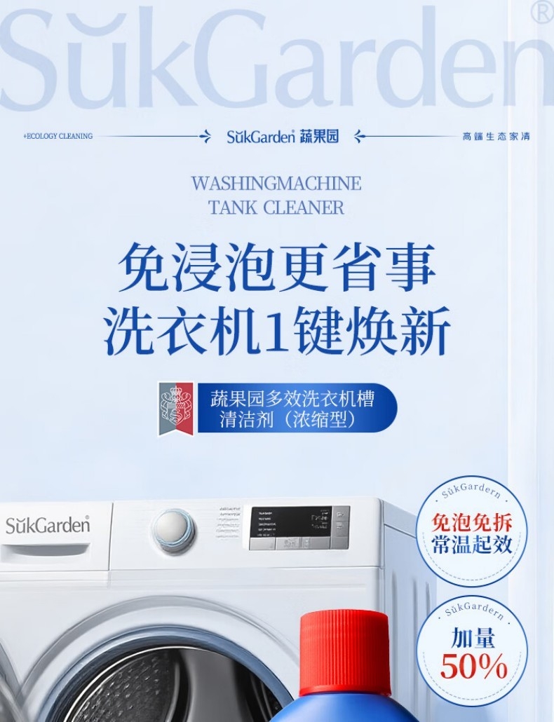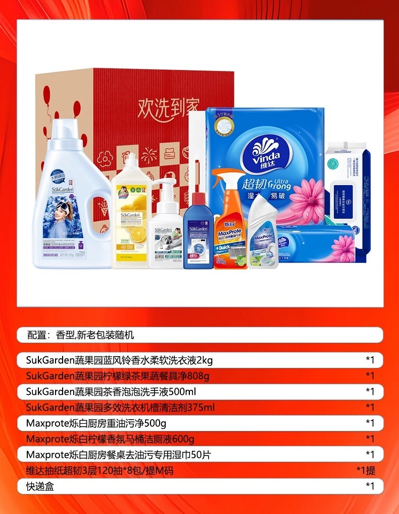 配置清单:SukGarden蔬果园蓝风铃香水柔软洗衣液(持久留香型)2kg*1 SukGarden蔬果园柠檬绿茶果蔬餐具净808g*1 SukGarden蔬果园茶香泡泡洗手液 500ml*1 SukGarden蔬果园多效洗衣机槽清洁剂(浓缩型)375ml*1 Maxprote烁白厨房重油污净500g*1 Maxprote烁白柠檬香氛马桶洁厕液600g*1 Maxprote烁白厨房餐桌去油污专用湿巾50片*1 维达(Vinda)抽纸 超韧3层120抽*8包/提M码*1提 快递盒*1