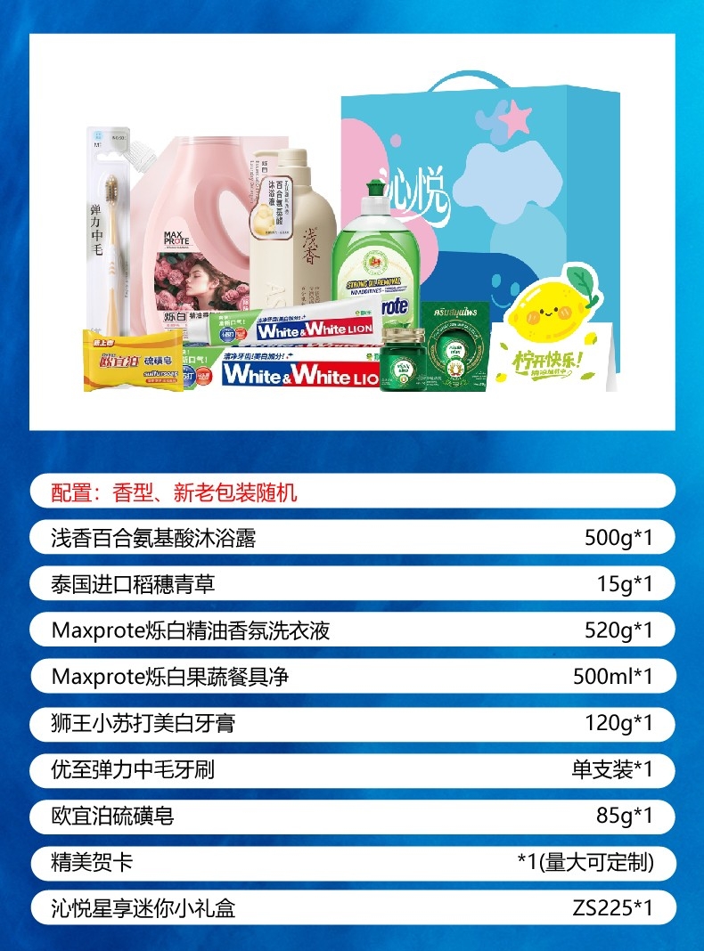 配置清单:浅香百合氨基酸沐浴露500g*1 泰国进口稻穗青草15g*1 Maxprote烁白精油香氛洗衣液520g*1 Maxprote烁白果蔬餐具净500ml*1 狮王小苏打美白牙膏120g*1 优至弹力中毛牙刷单支装*1 欧宜泊硫磺皂85g*1 精美贺卡*1 沁悦星享迷你小礼盒ZS225*1