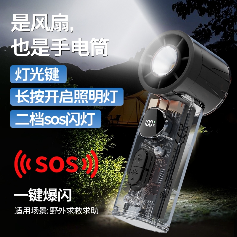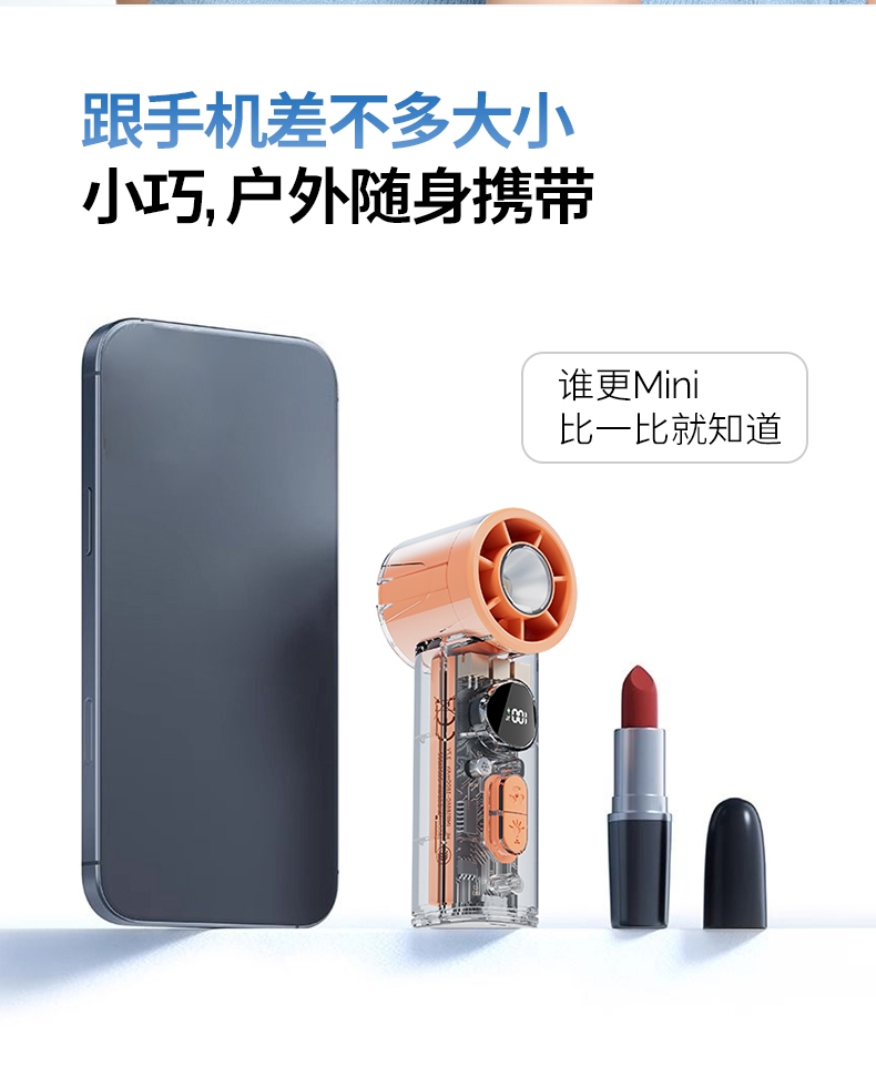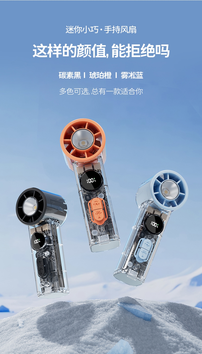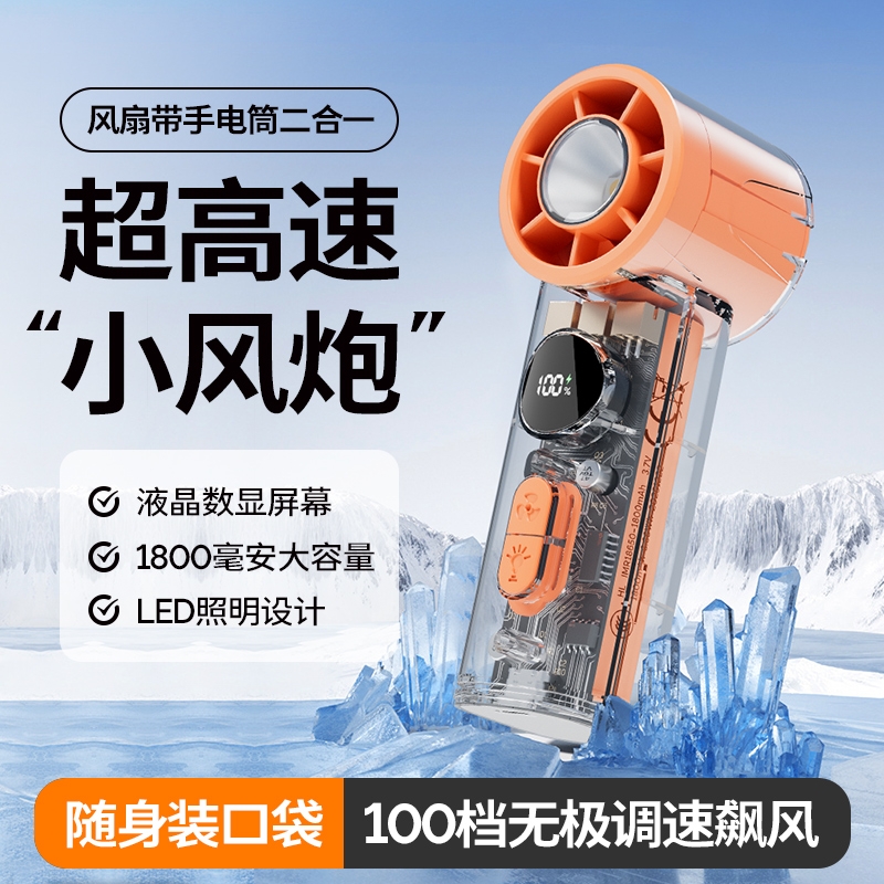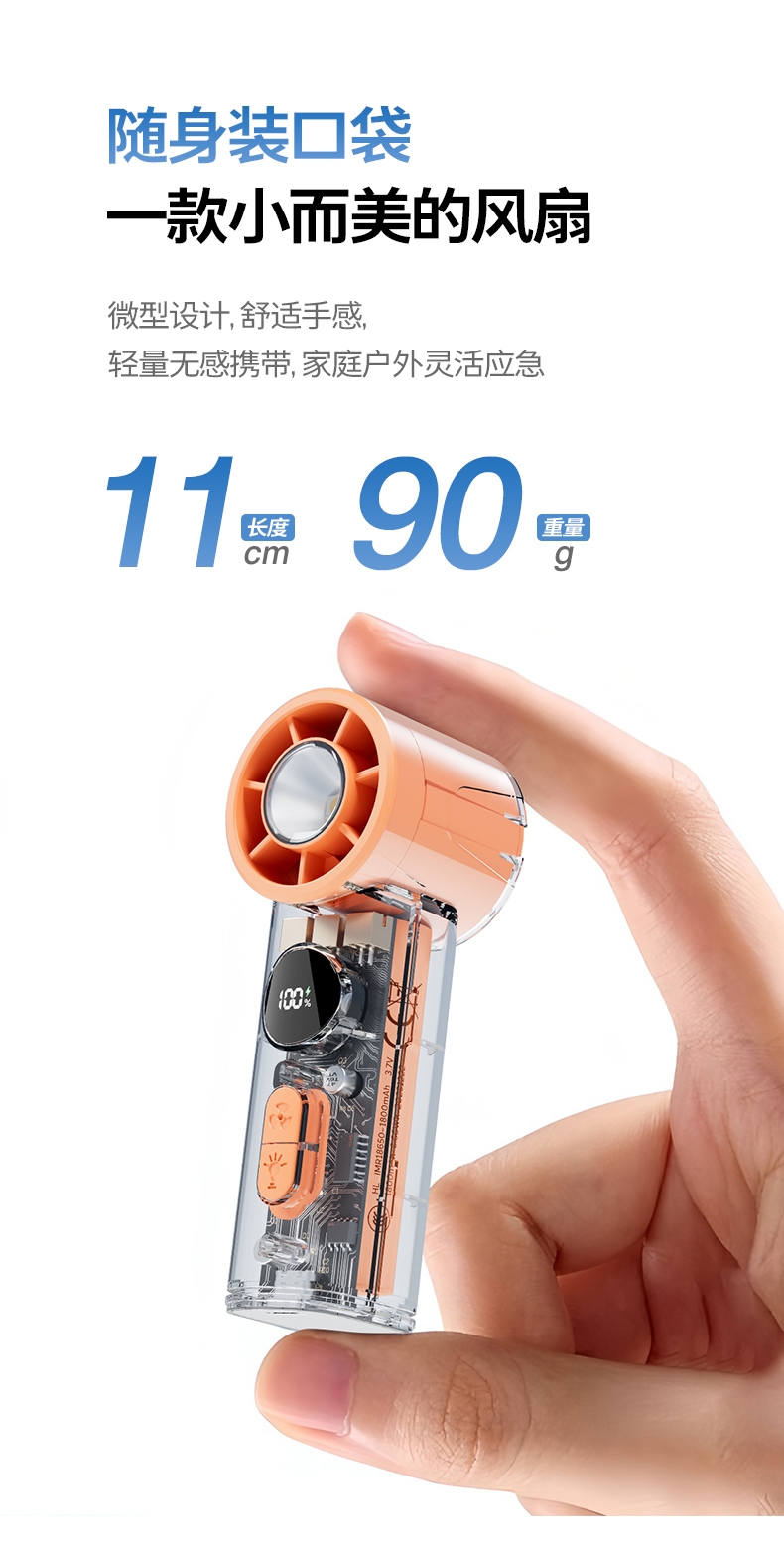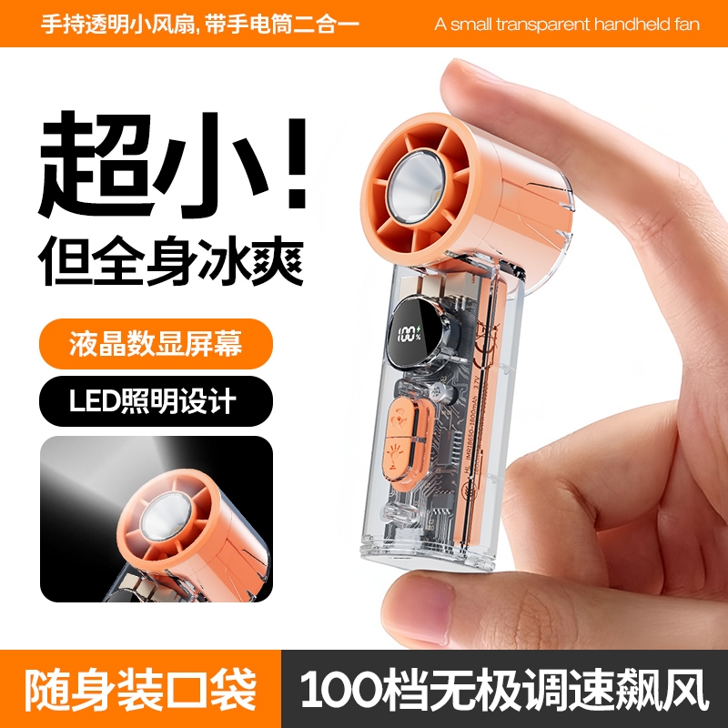 手持+挂壁+手电;无刷电机数显无极调控大容量电池持久续航;高颜值透明机身小巧迷你口袋手持风扇