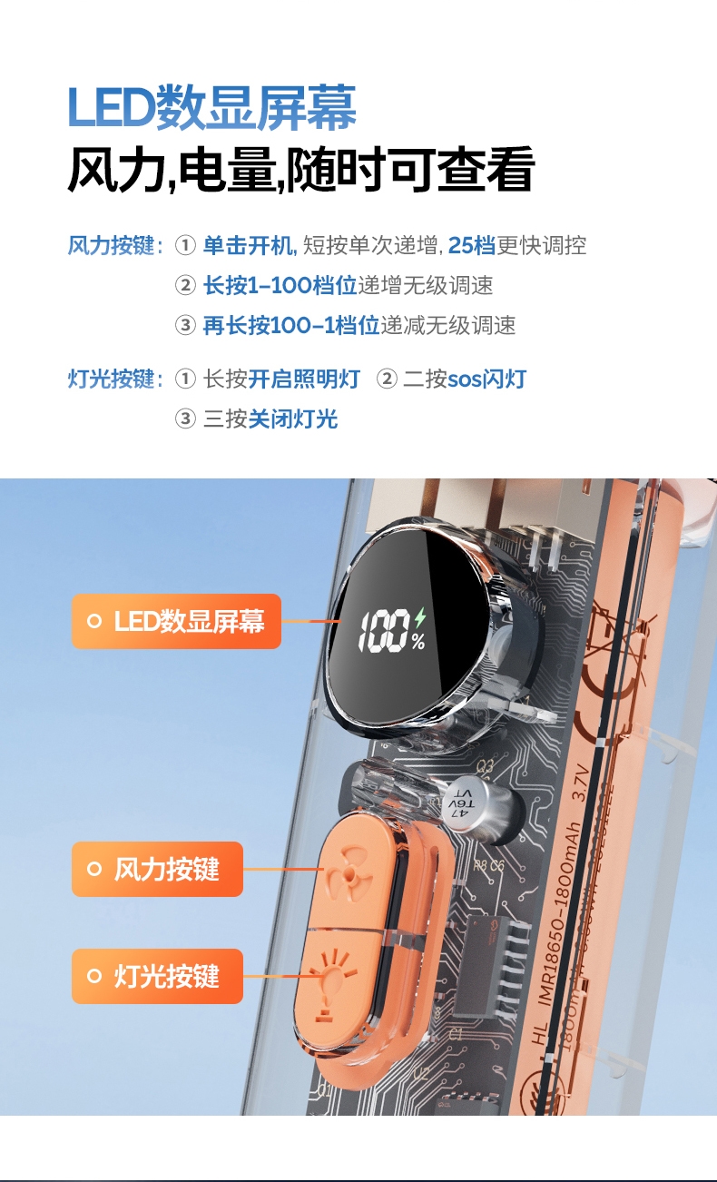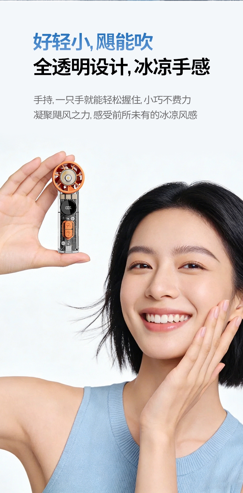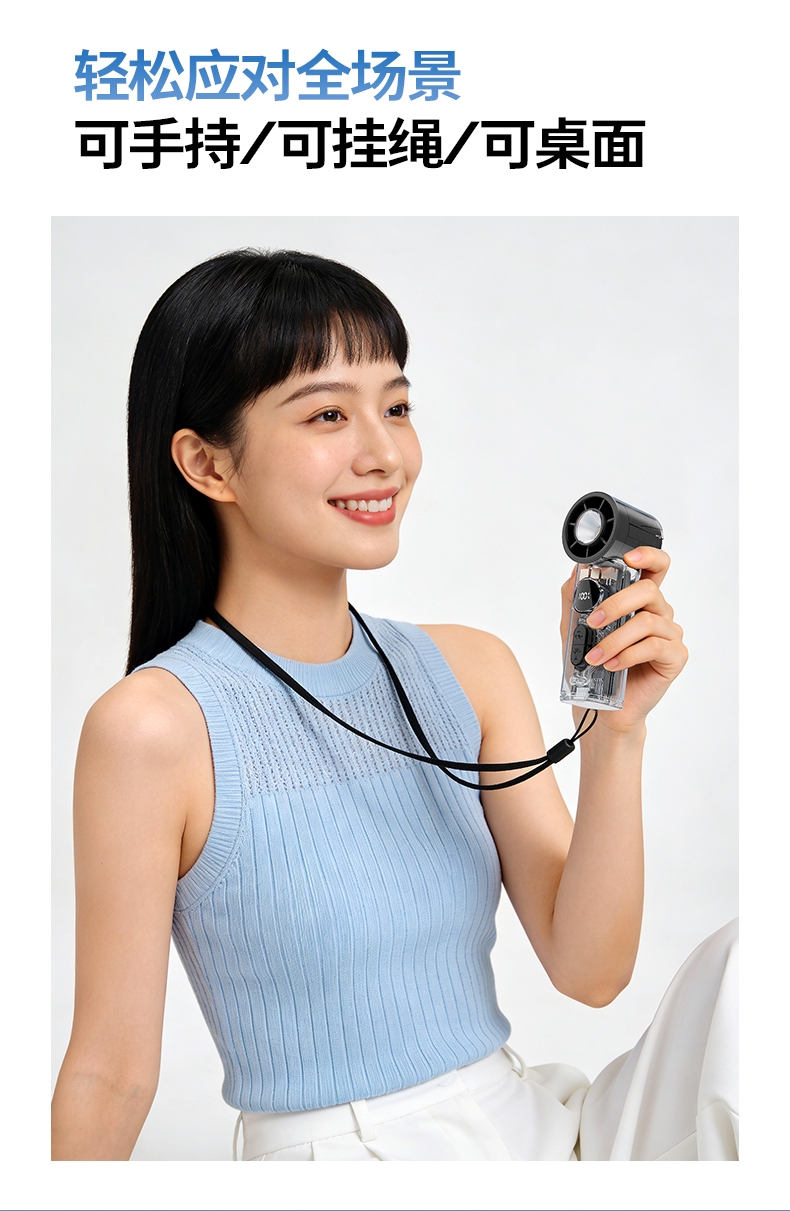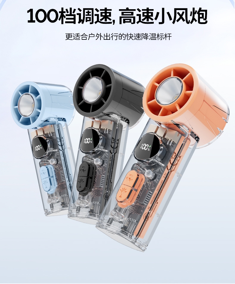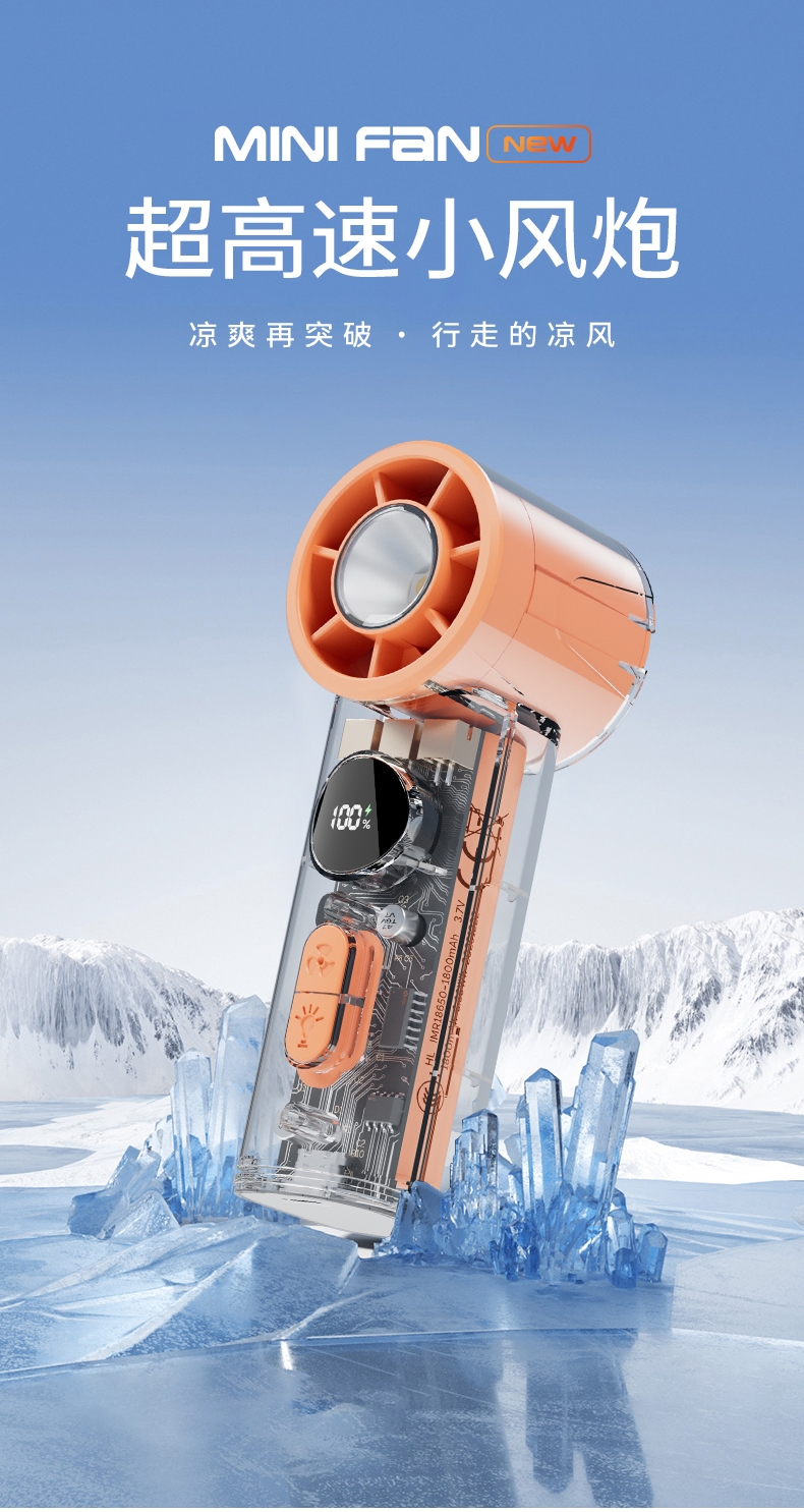 手持+挂壁+手电;无刷电机数显无极调控大容量电池持久续航;高颜值透明机身小巧迷你口袋手持风扇